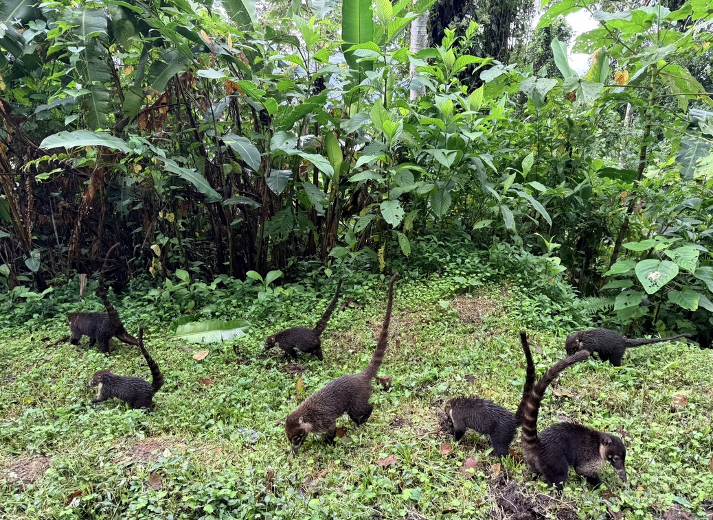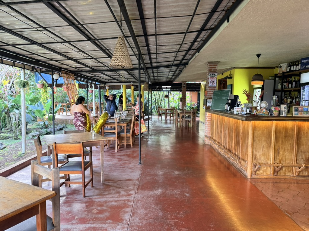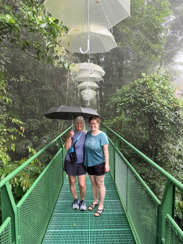 On Friday, we took off for La Fortuna in the rain. We saw a band of coatis scavenging for food along the road. We race-walked through Mistico Arenal Hanging Bridges Park in foggy conditions, with Sarah braving, with some trepidation, the 5 hanging bridges that were open. After that, we ate sushi at Kappa Sushi and shopped in Wandering, where Sarah found a bunch of goodies to take home. Mike and I each bought things too. We spent the rest of the day at Hotel Los Lagos Spa & Resort, taking advantage of the resort’s 8 hot thermal springs, topped off with drinks at the swim-up bar. We enjoyed Indian food at Sunny’s Indian Restaurant.