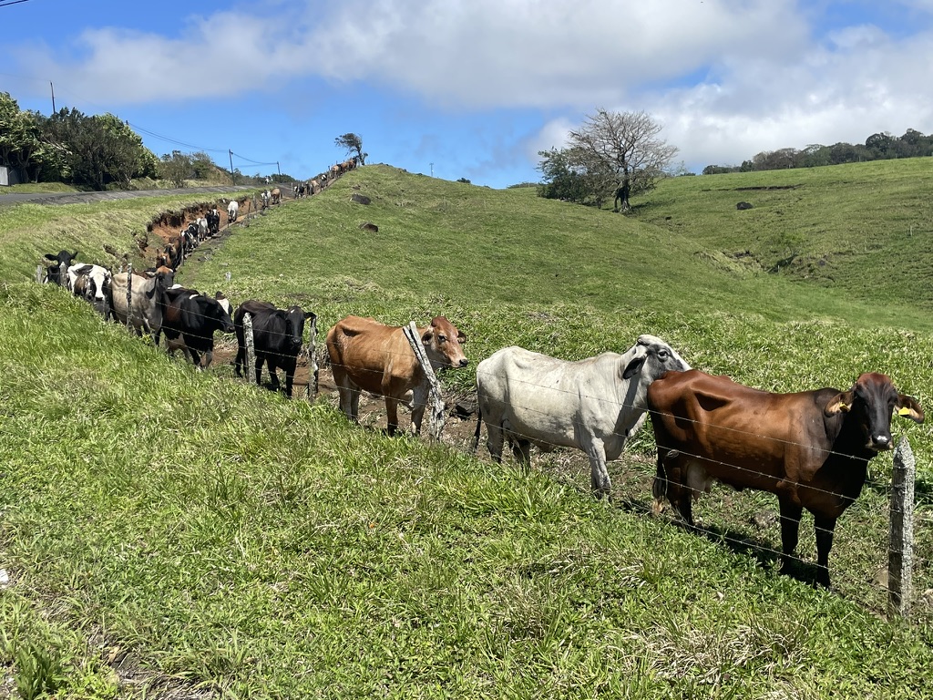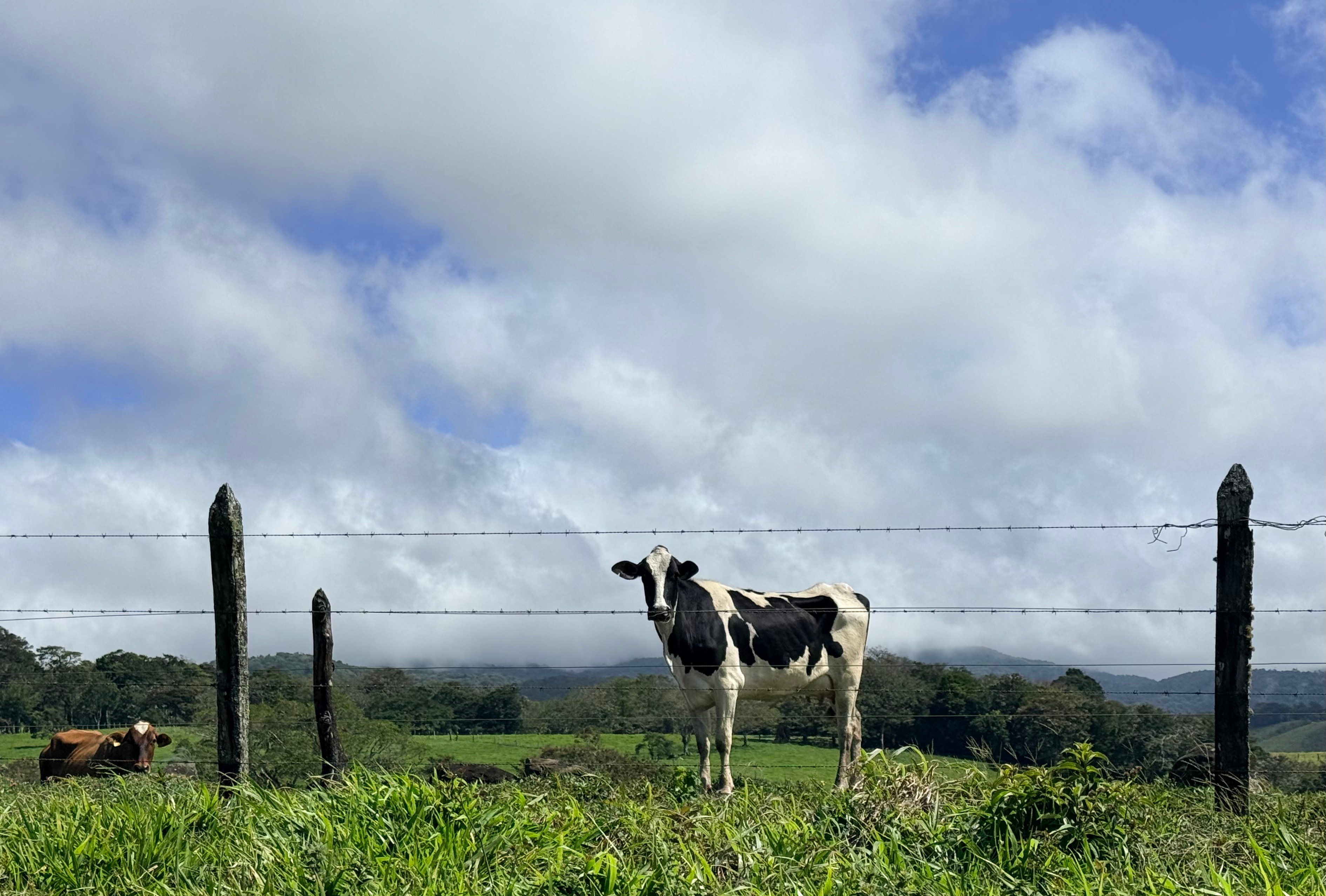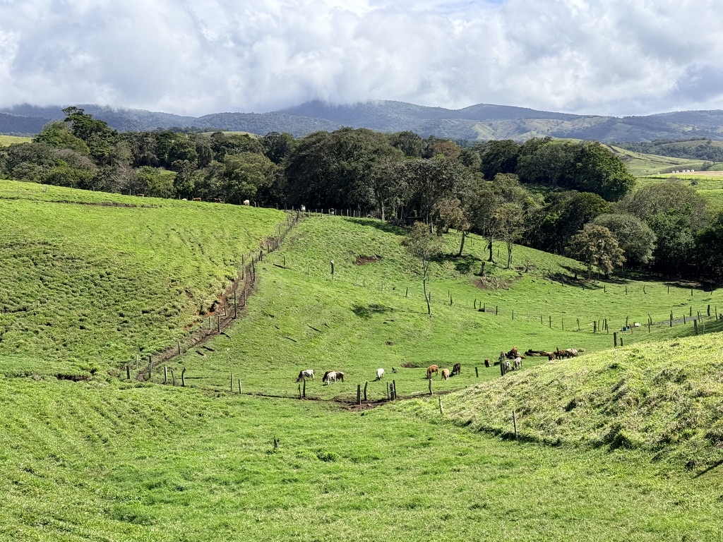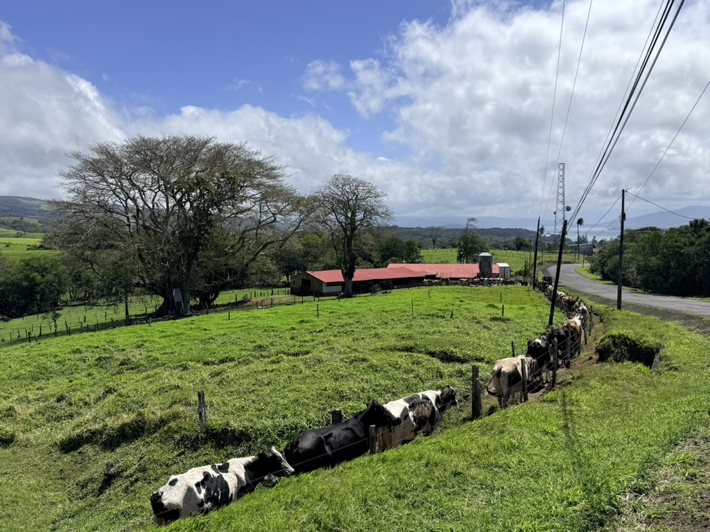 After getting birthday calls via WhatsApp from both Sarah and Adam, we walked up near Sabalito where we watched the dairy cows lining up to be milked. It was breezy and sunny, and the scenery was magnificent.