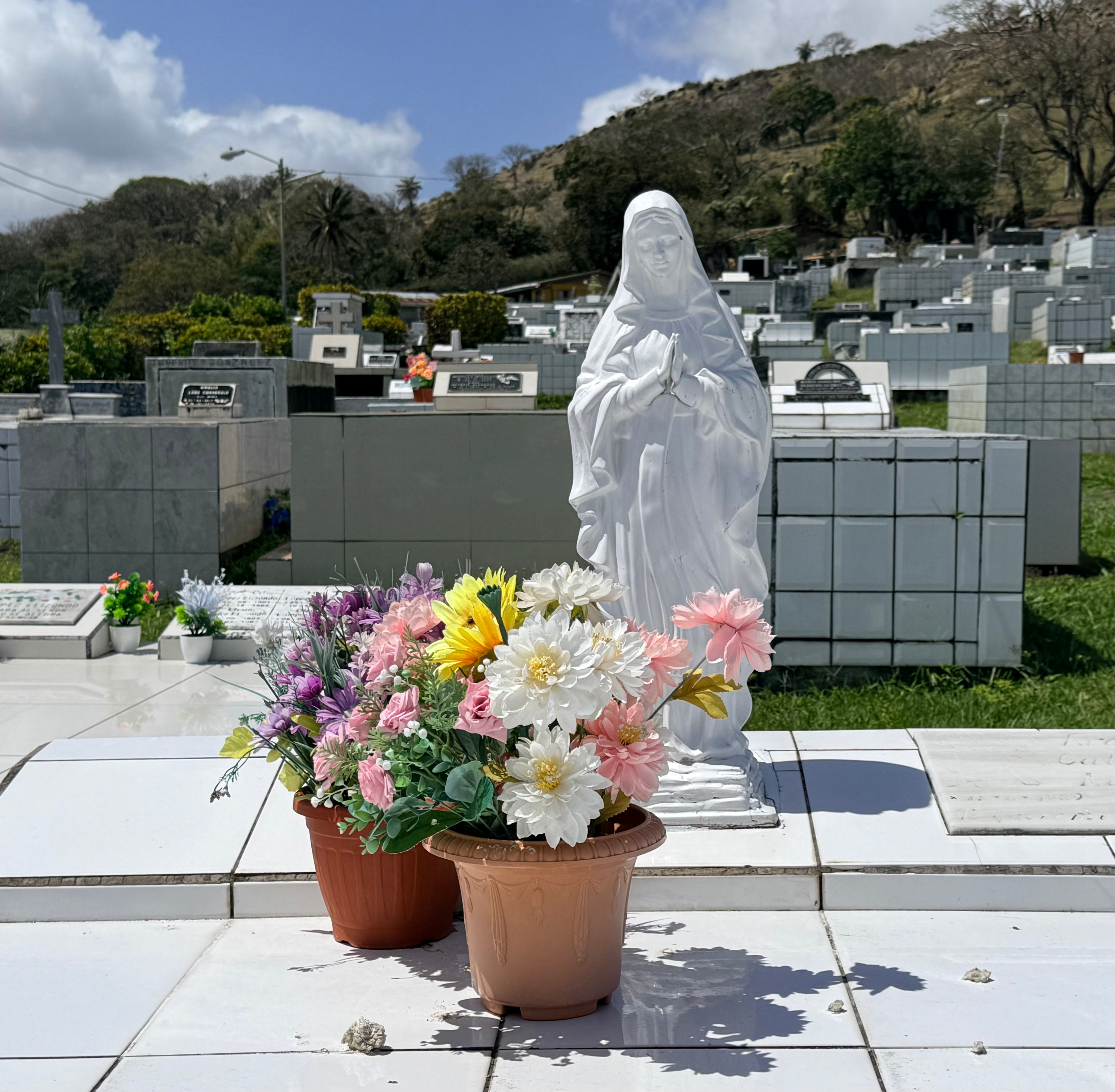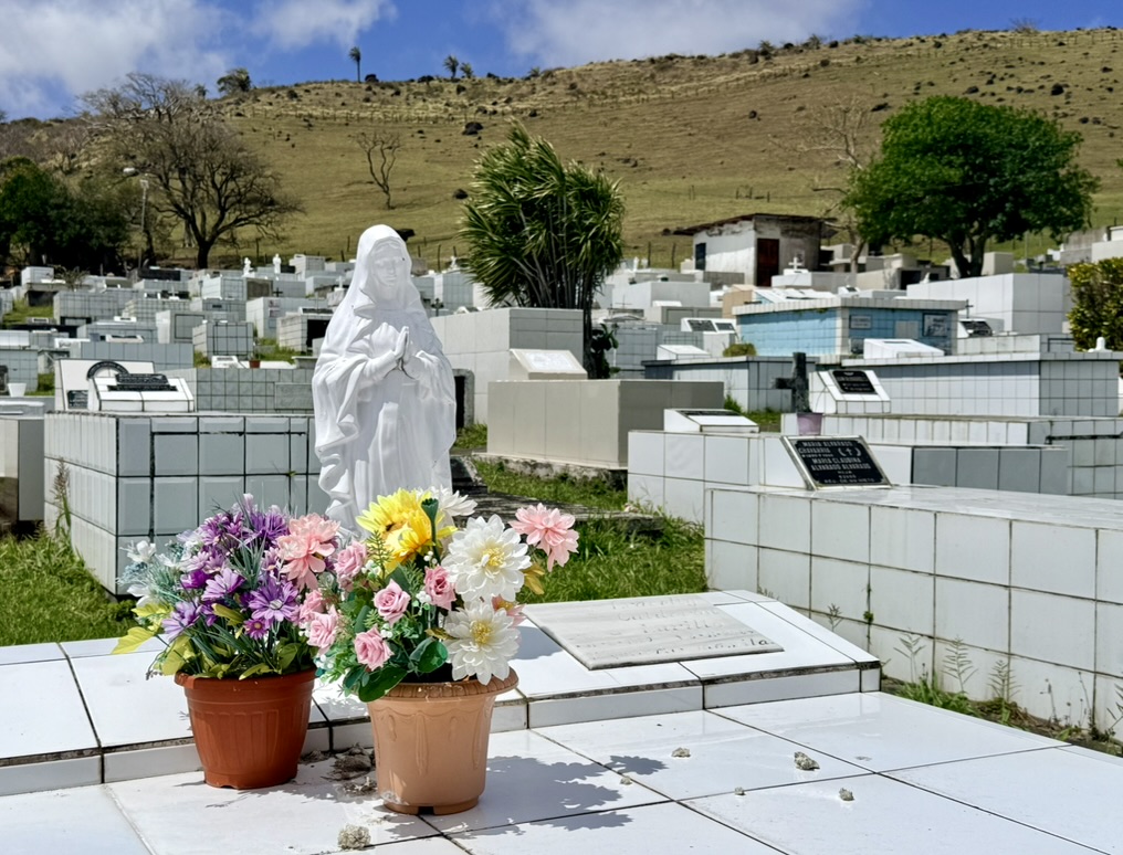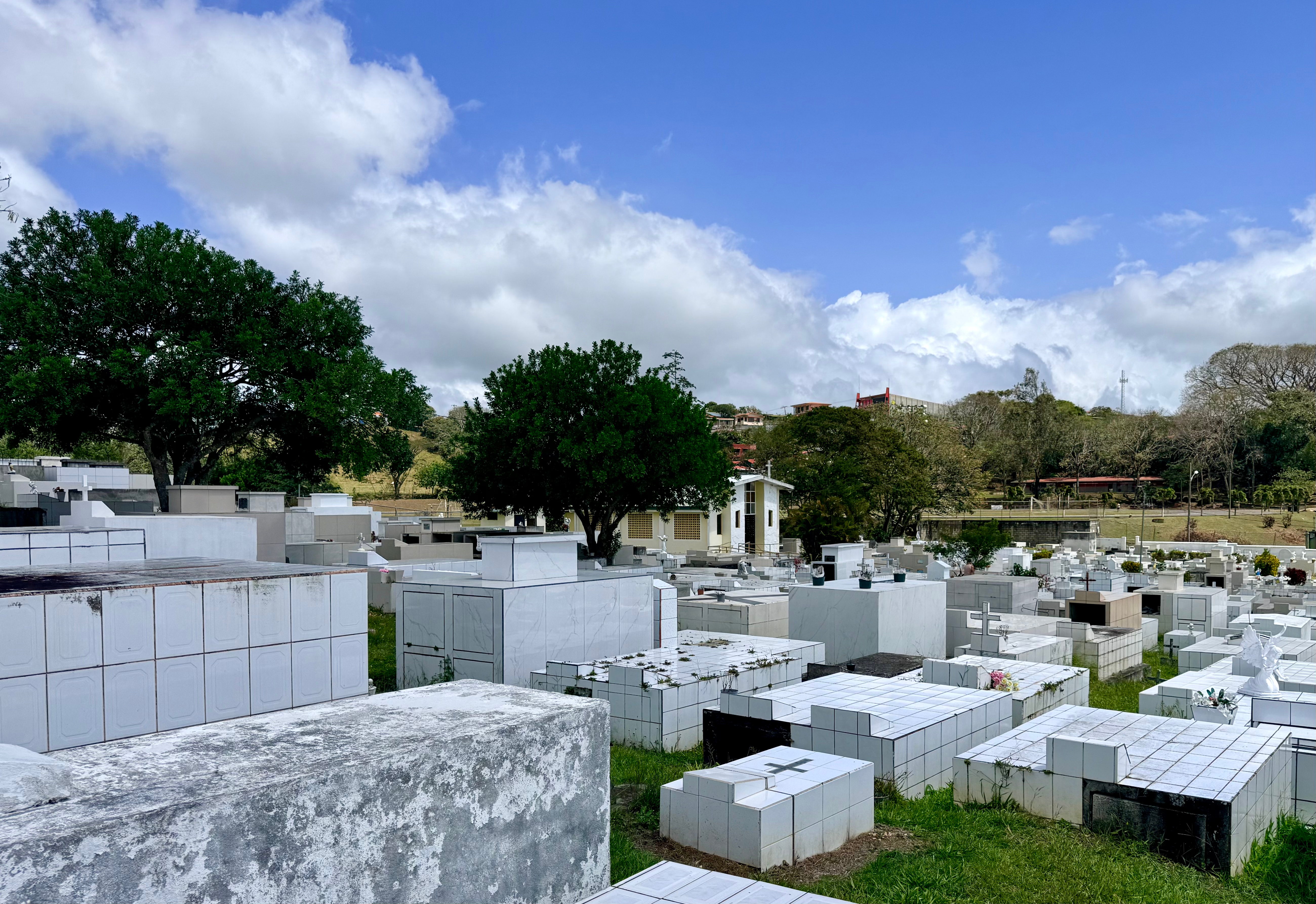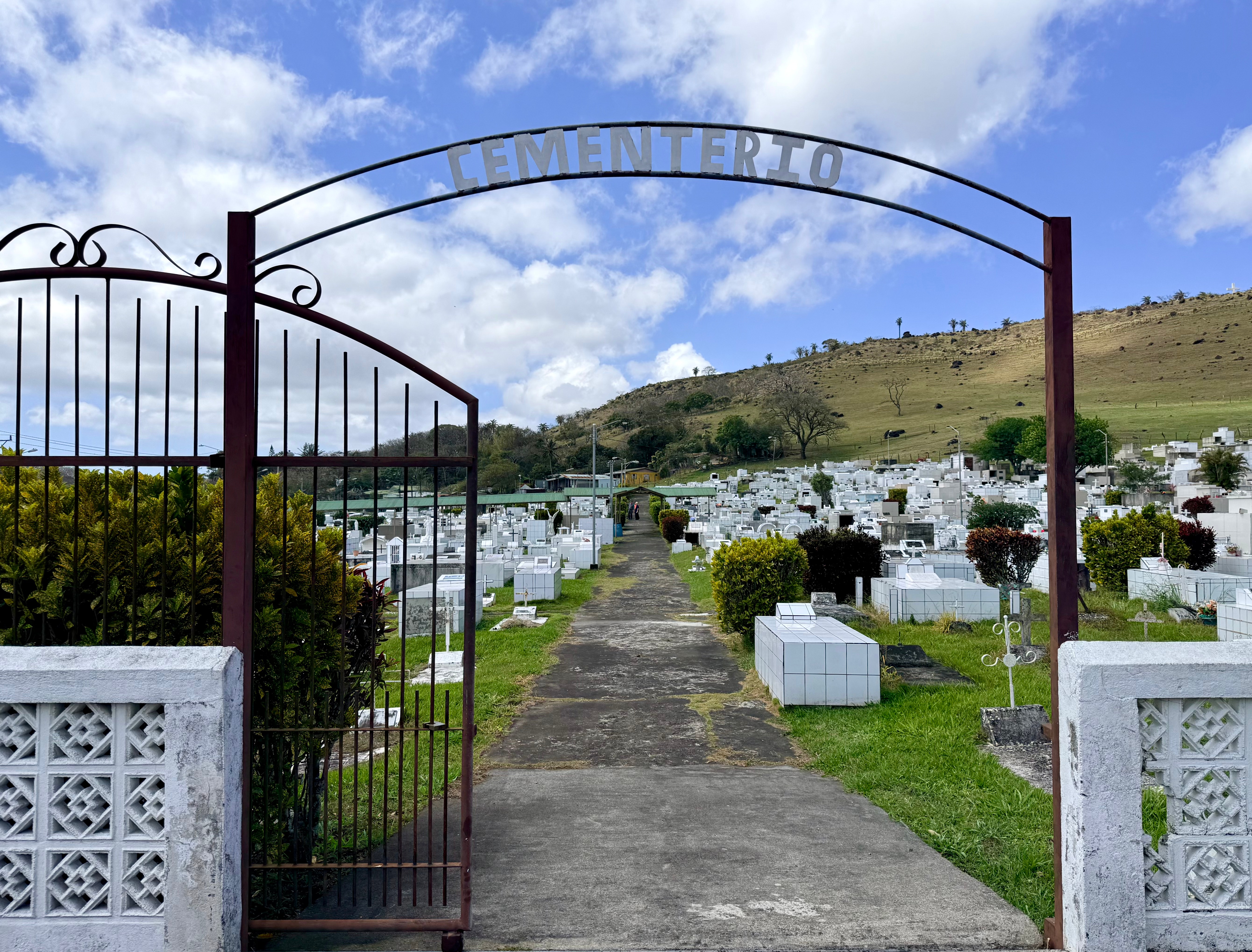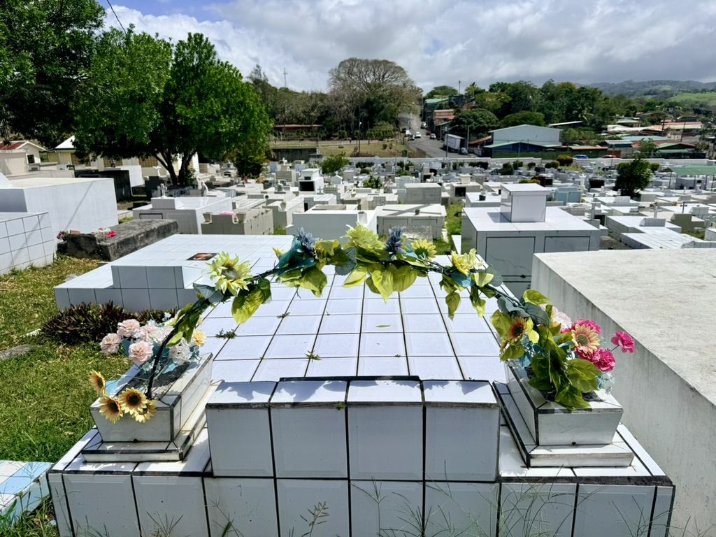 On Sunday, the 22nd, we drove southwest of Tilarán to the tiny town of Libano. The landscape looked like high chaparral, quite a difference from the tropical vegetation just a few miles north of Tilarán, where we live. Then we discovered the Cementario de Tilarán, which we had somehow missed in our nine months here. Later, it was sunny enough that Mike went to swim in the cove at Puerto San Luis; while he swam, I walked my normal loop around Tronadora.