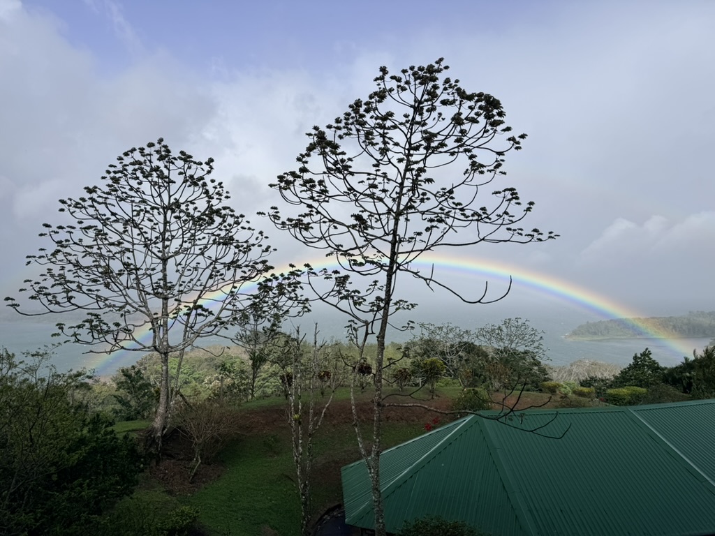 We can stay inside to keep out of the constant rain and wind, or we can venture out to our balcony on the rare sunny day; maybe we’ll be lucky enough to see rainbows or the Snow Moon. You can even come along as we witness some wedding vows, show our daughter Sarah around Costa Rica, and celebrate Mike’s 72nd birthday. Sunset is is now at around 5:50 every night and if it’s not raining, we can enjoy some magnificent painterly skies at sunset.