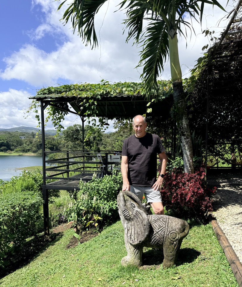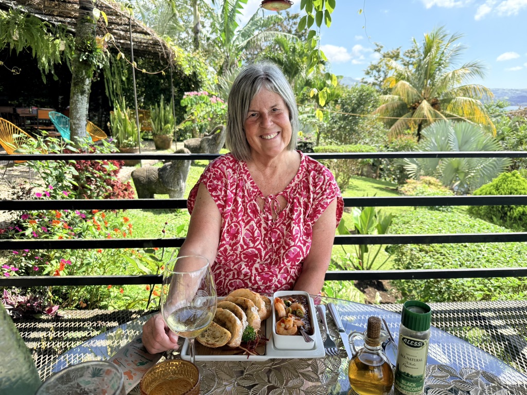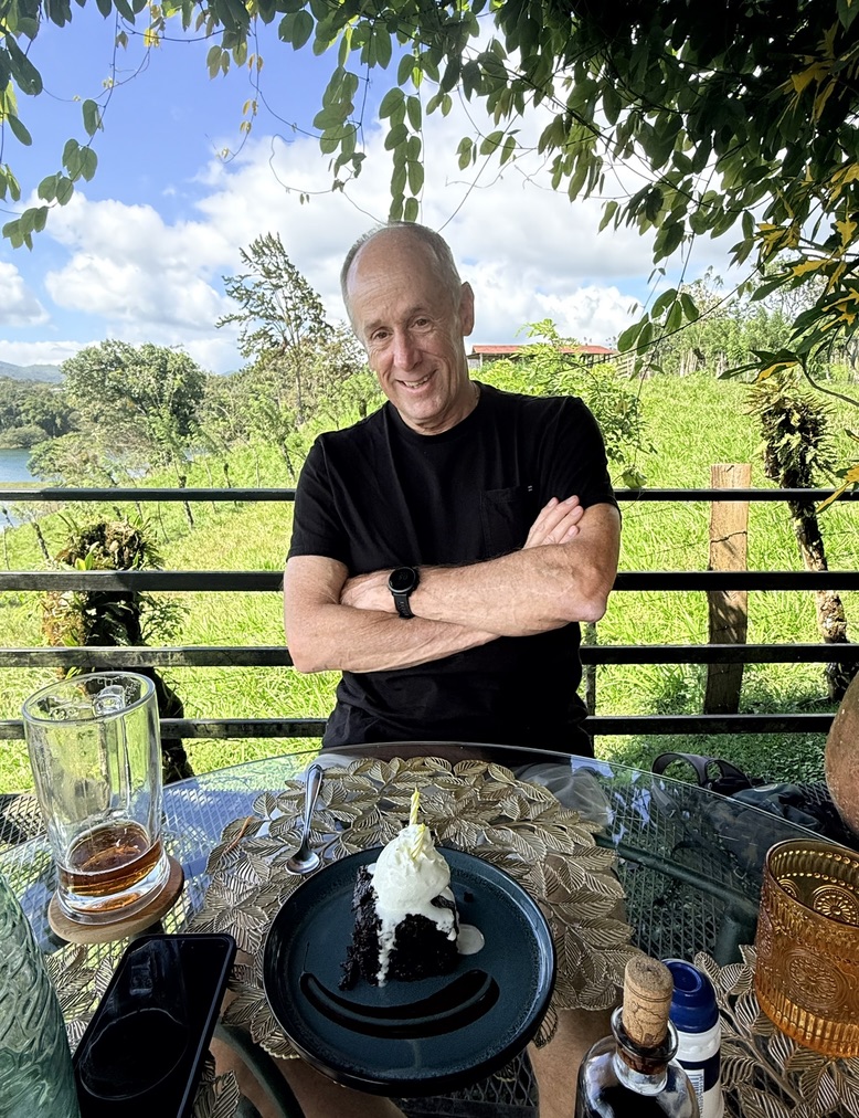We drove to Nuevo Arenal where we had a lovely lunch at Restaurante Tinajas overlooking the placid lake. Mike had a Segua Red Ale and I had a Cabernet Sauvignon Blanc from Chile, and we toasted to Mike’s 72nd birthday. Mike ate a delicious Angus & Eggplant Burger (without bread – the eggplant slices served as a kind of bun), and I had Spicy Thai Chili Shrimp with oven bread. We sat on the special platform with sweeping views of the lake; we could even see our condos directly across the lake. I had sneakily asked the waitress as we walked in to bring a chocolate cake for his birthday, and the waiter, Nixón, brought the cake when he brought us a carry-out box. What a pleasant birthday celebration!