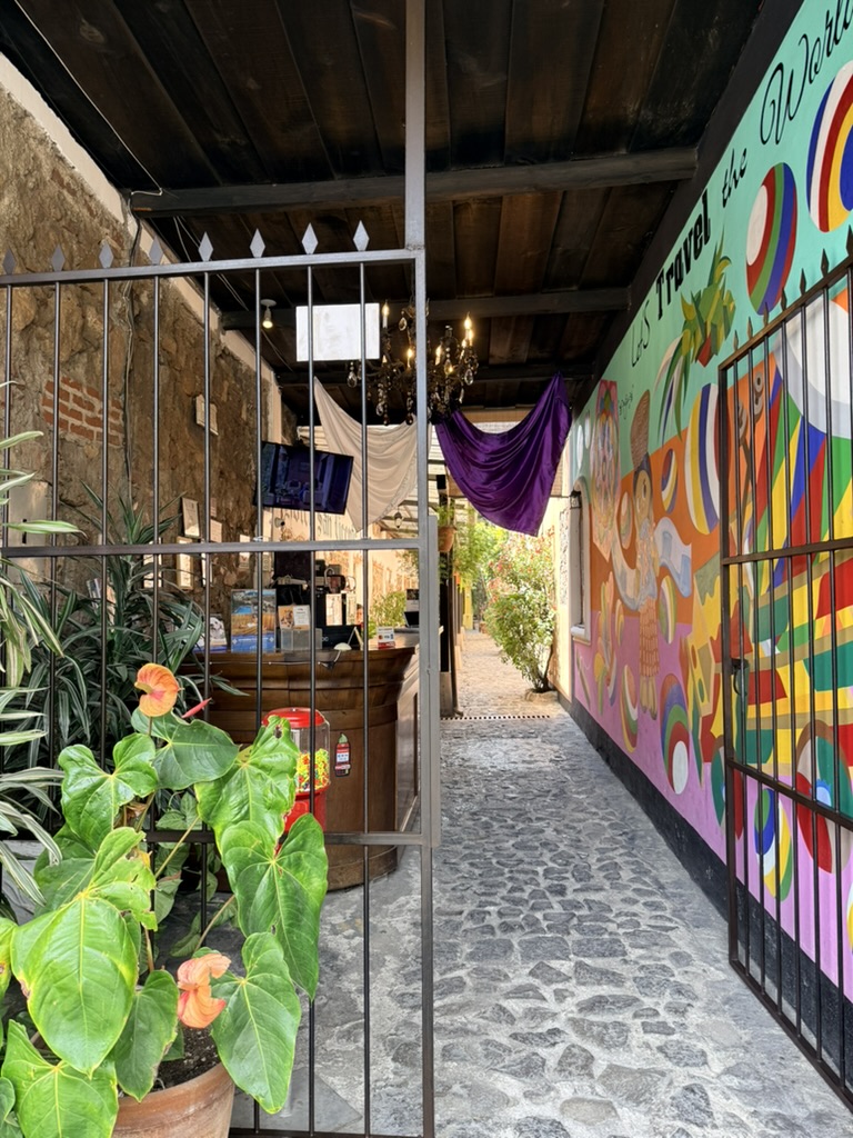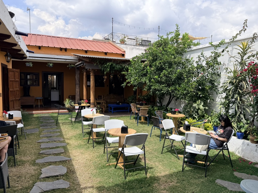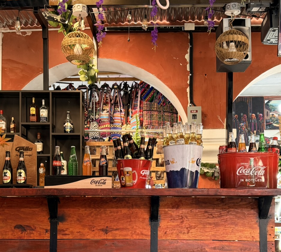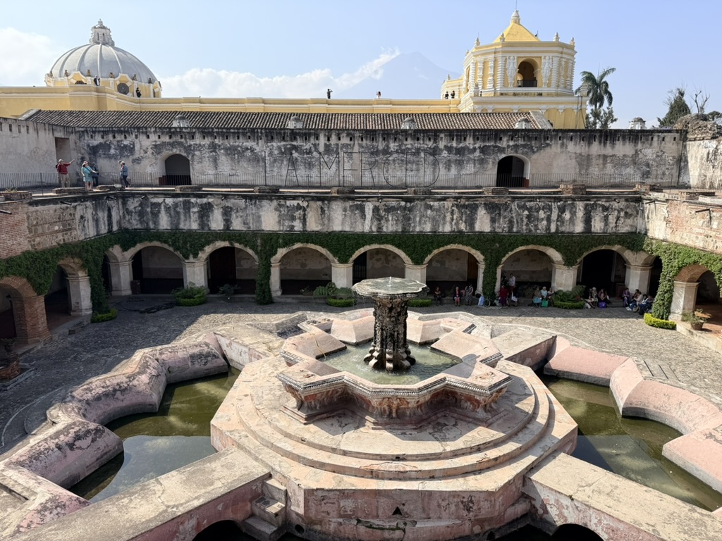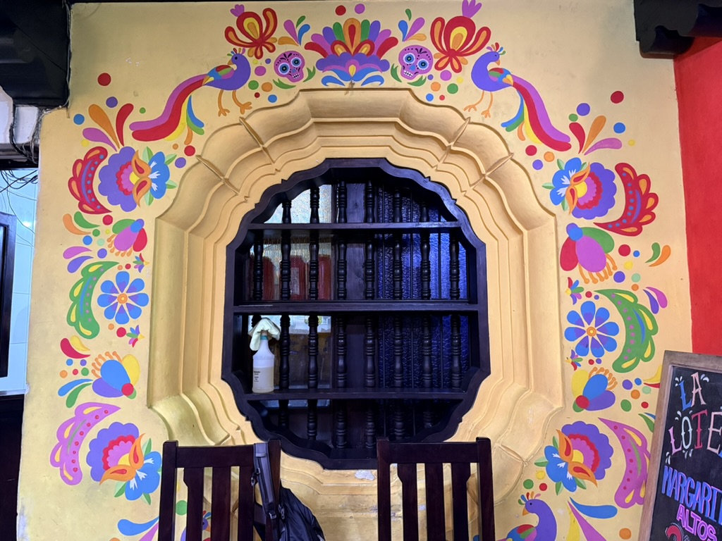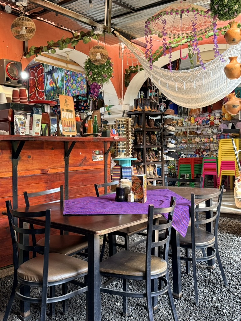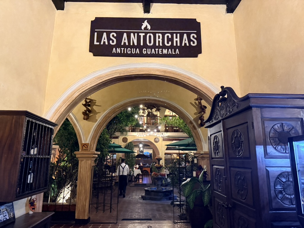 Last but not least was the coffee and the food scene that arose from the ashes of Antigua. Coffee shops abound and we stopped in them whenever we needed a break. We drank the local Gallo beer. We shared Baked Camembert with Onion Chutney, Sopa de Tortilla and pork ragout alongside a gurgling fountain in the courtyard of Las Antorchas (The Torches). At Seth and Joel’s recommendation, we ate tacos at Tacos La Loteria at a colorful food court. We stopped twice at a little bar called Red Zebra where I drank a decadent Fresa Colada (Strawberry colada) while Lost Frequencies sang “Black Friday (pretty like the sun)” and “Are you with me?” The second time I went lighter with a glass of wine to the tune of “Prayer in C” by Lillywood & the Prick & Robin Schulz. We gobbled up a Cactus (Nopal) Wrap with chicken and a Veggie Quesadilla at Union Cafe. And finally, we had authentic Mayan cuisine at Itzam: corn croquettes with Iguashte Sauce and Guatemalan BBQ (Churrasquito), and for dessert a Tamalito, neatly presented in a slit-open corn husk.
