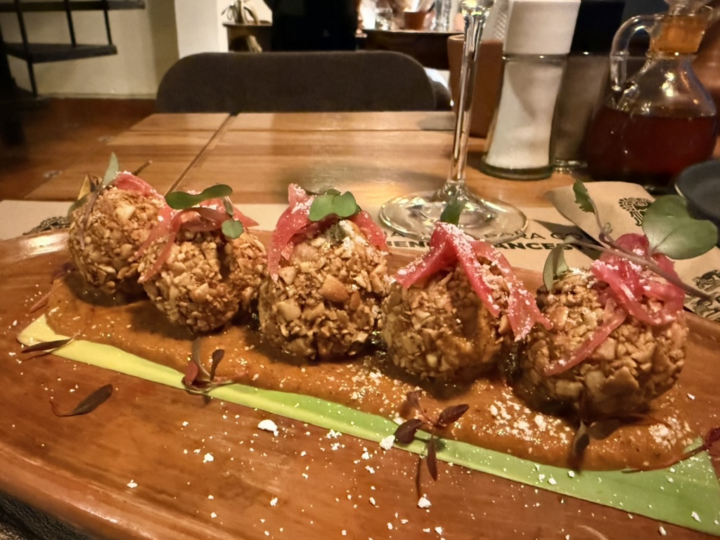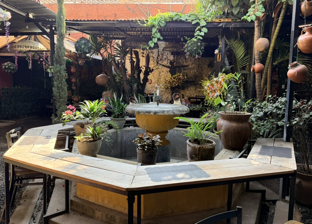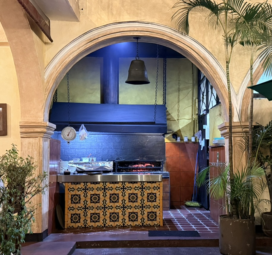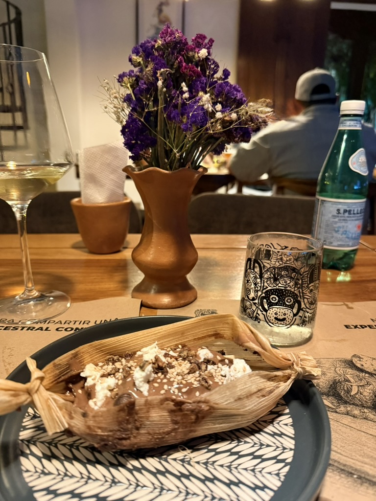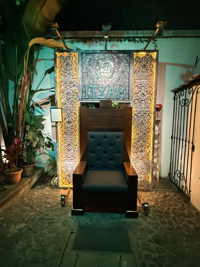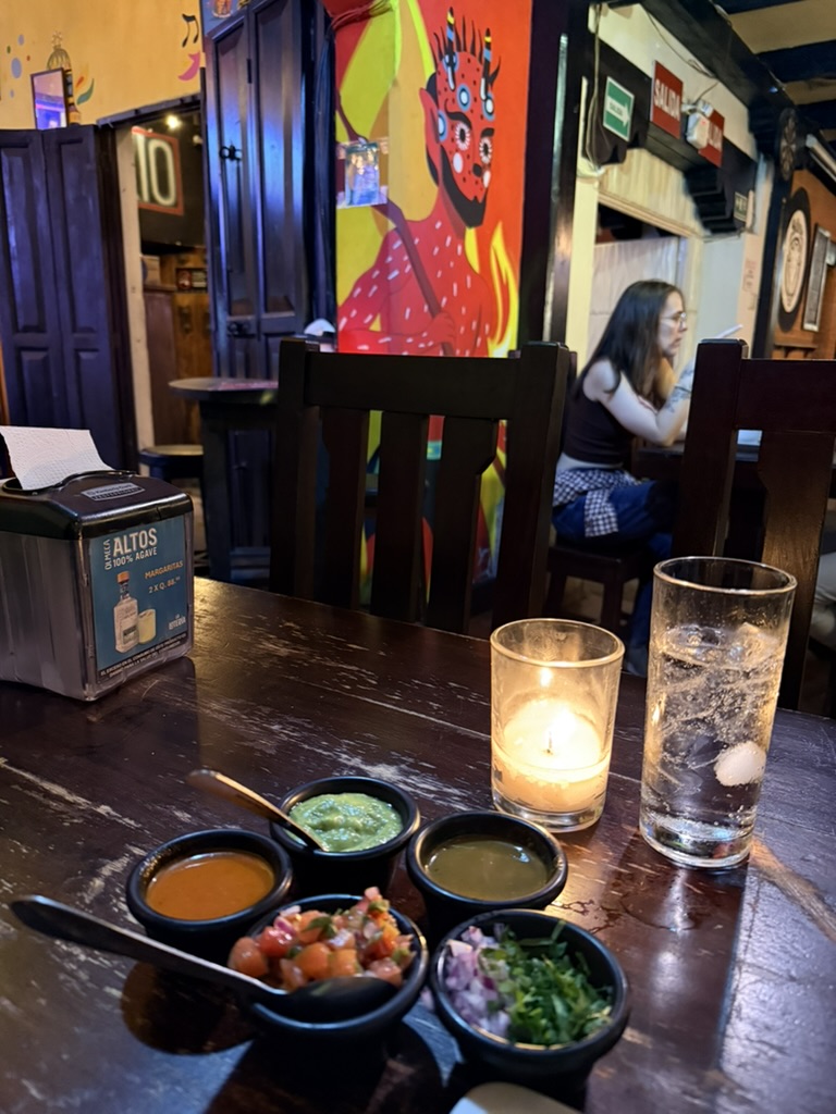 Last but not least was the coffee and the food scene that arose from the ashes of Antigua. Coffee shops abound and we stopped in them whenever we needed a break. We drank the local Gallo beer. We shared Baked Camembert with Onion Chutney, Sopa de Tortilla and pork ragout alongside a gurgling fountain in the courtyard of Las Antorchas (The Torches). At Seth and Joel’s recommendation, we ate tacos at Tacos La Loteria at a colorful food court. We stopped twice at a little bar called Red Zebra where I drank a decadent Fresa Colada (Strawberry colada) while Lost Frequencies sang “Black Friday (pretty like the sun)” and “Are you with me?” The second time I went lighter with a glass of wine to the tune of “Prayer in C” by Lillywood & the Prick & Robin Schulz. We gobbled up a Cactus (Nopal) Wrap with chicken and a Veggie Quesadilla at Union Cafe. And finally, we had authentic Mayan cuisine at Itzam: corn croquettes with Iguashte Sauce and Guatemalan BBQ (Churrasquito), and for dessert a Tamalito, neatly presented in a slit-open corn husk.