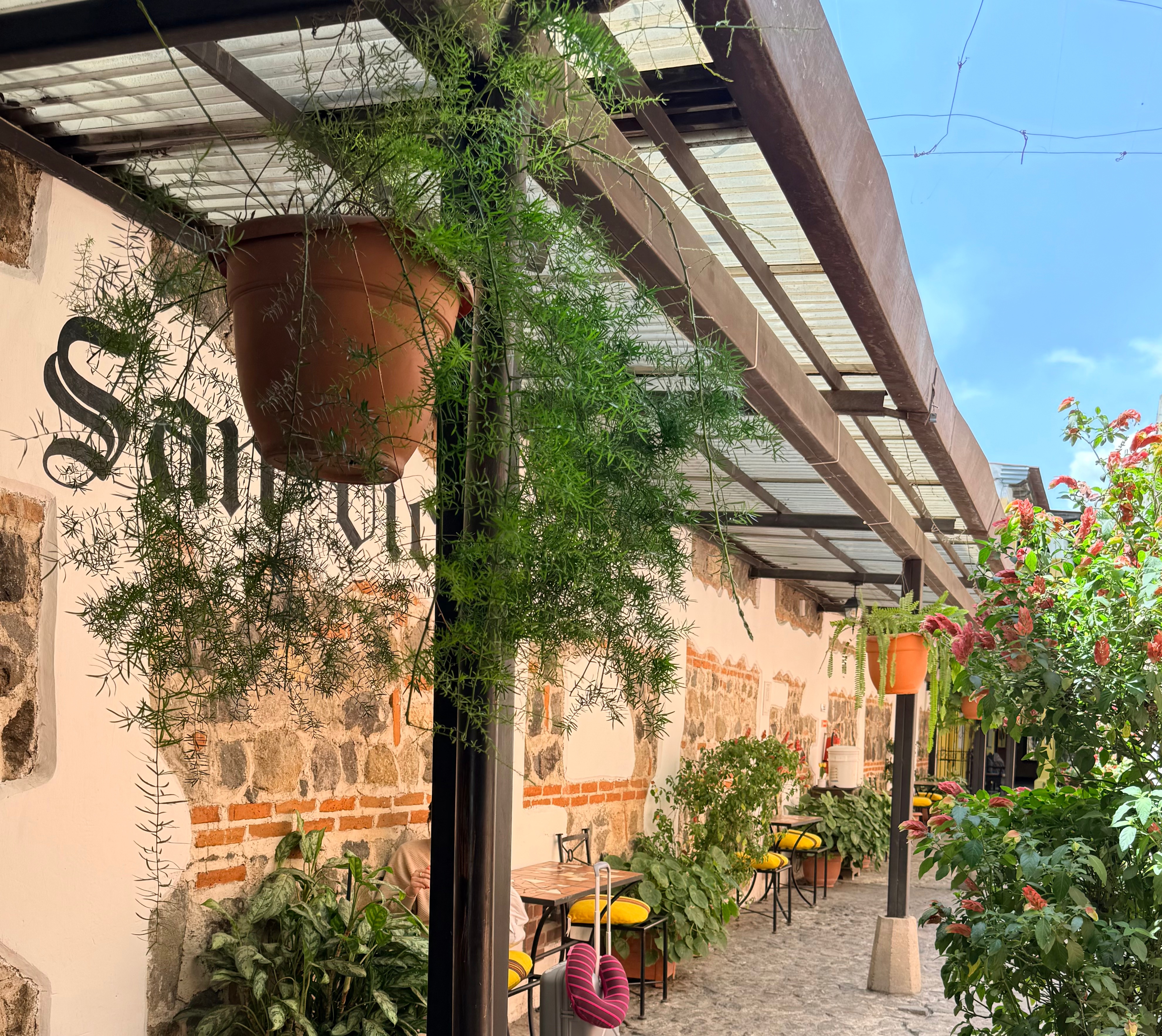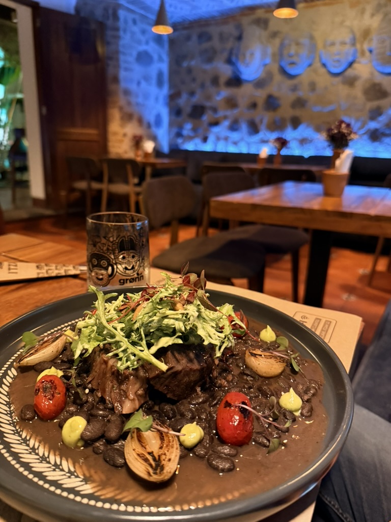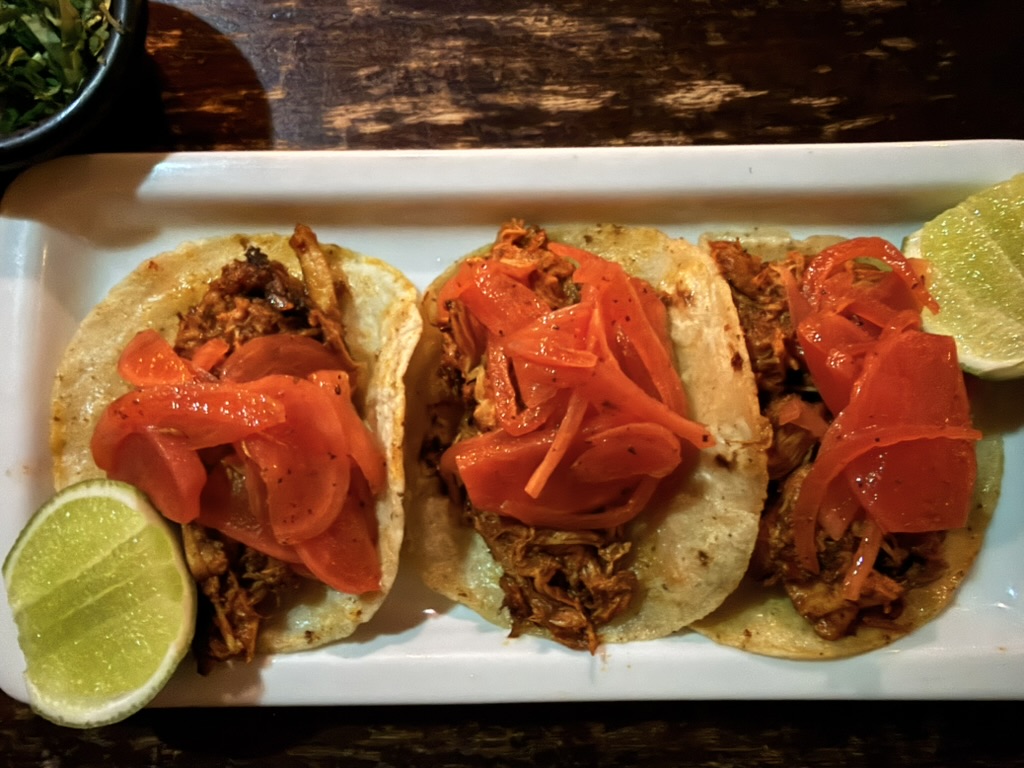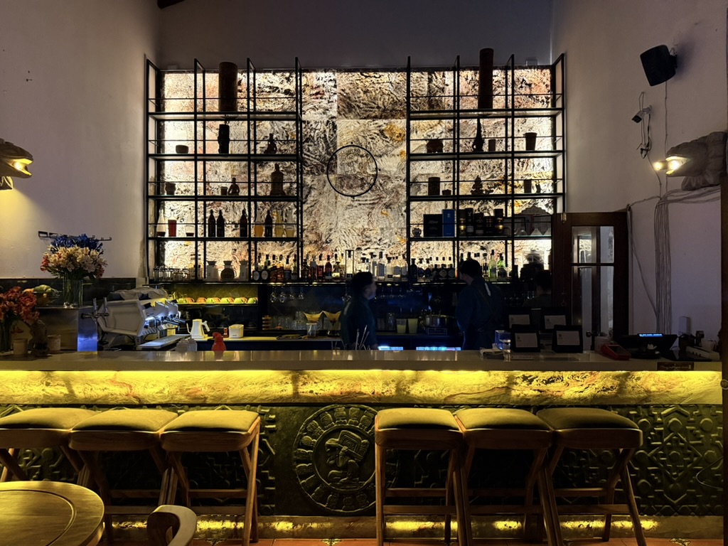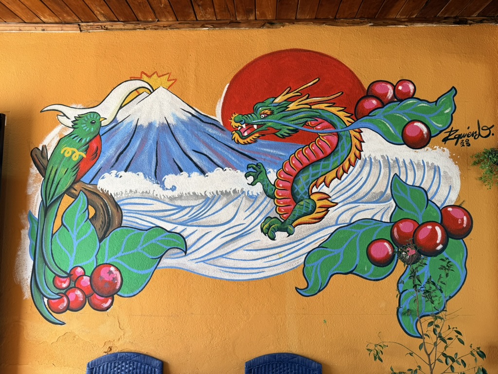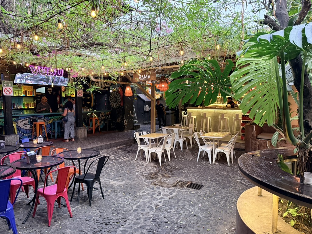 Last but not least was the coffee and the food scene that arose from the ashes of Antigua. Coffee shops abound and we stopped in them whenever we needed a break. We drank the local Gallo beer. We shared Baked Camembert with Onion Chutney, Sopa de Tortilla and pork ragout alongside a gurgling fountain in the courtyard of Las Antorchas (The Torches). At Seth and Joel’s recommendation, we ate tacos at Tacos La Loteria at a colorful food court. We stopped twice at a little bar called Red Zebra where I drank a decadent Fresa Colada (Strawberry colada) while Lost Frequencies sang “Black Friday (pretty like the sun)” and “Are you with me?” The second time I went lighter with a glass of wine to the tune of “Prayer in C” by Lillywood & the Prick & Robin Schulz. We gobbled up a Cactus (Nopal) Wrap with chicken and a Veggie Quesadilla at Union Cafe. And finally, we had authentic Mayan cuisine at Itzam: corn croquettes with Iguashte Sauce and Guatemalan BBQ (Churrasquito), and for dessert a Tamalito, neatly presented in a slit-open corn husk.