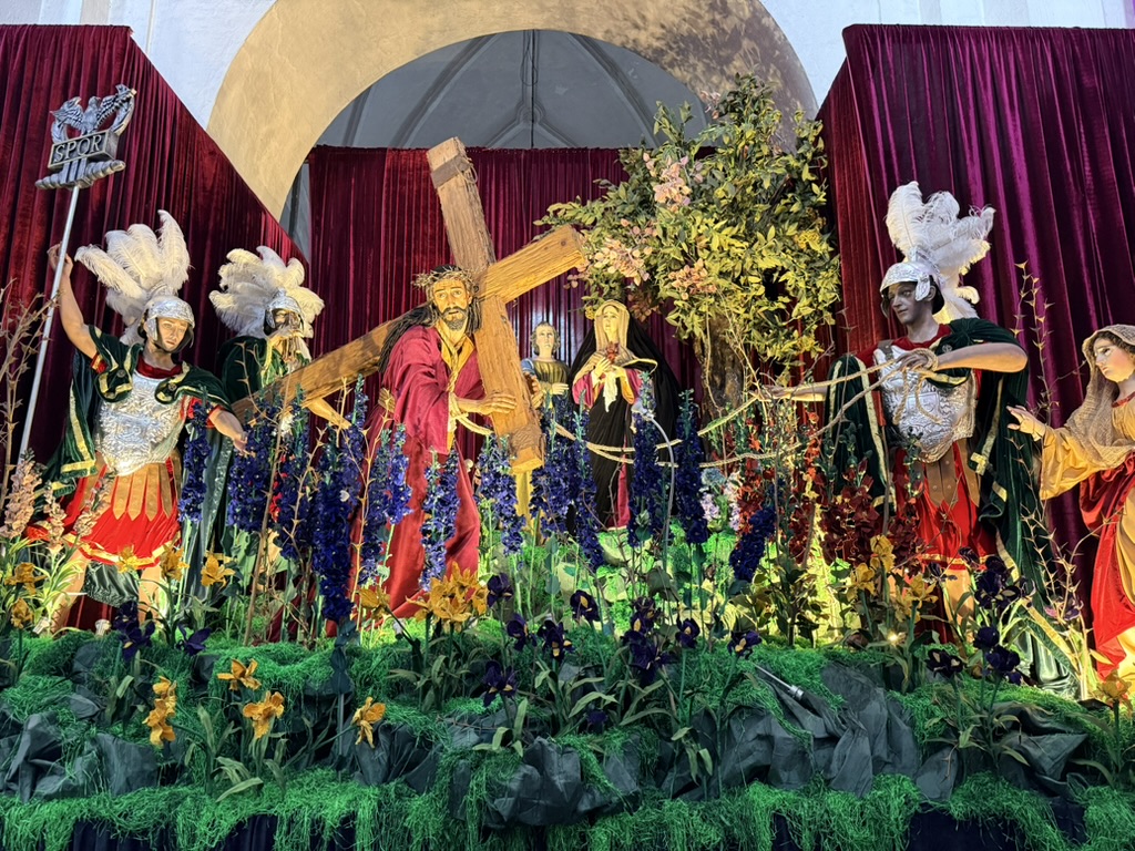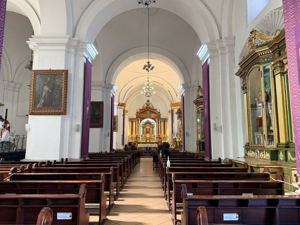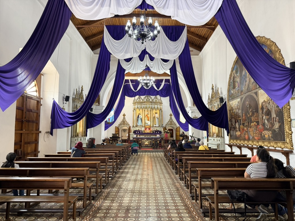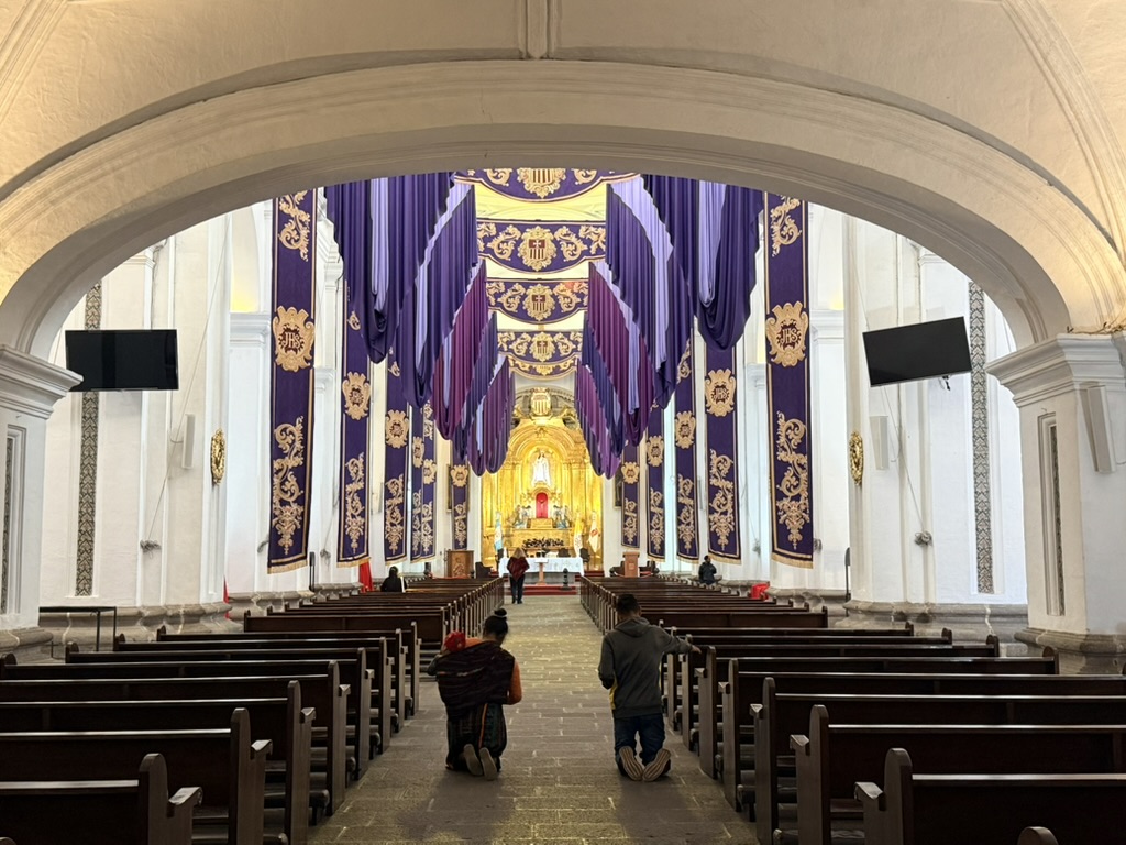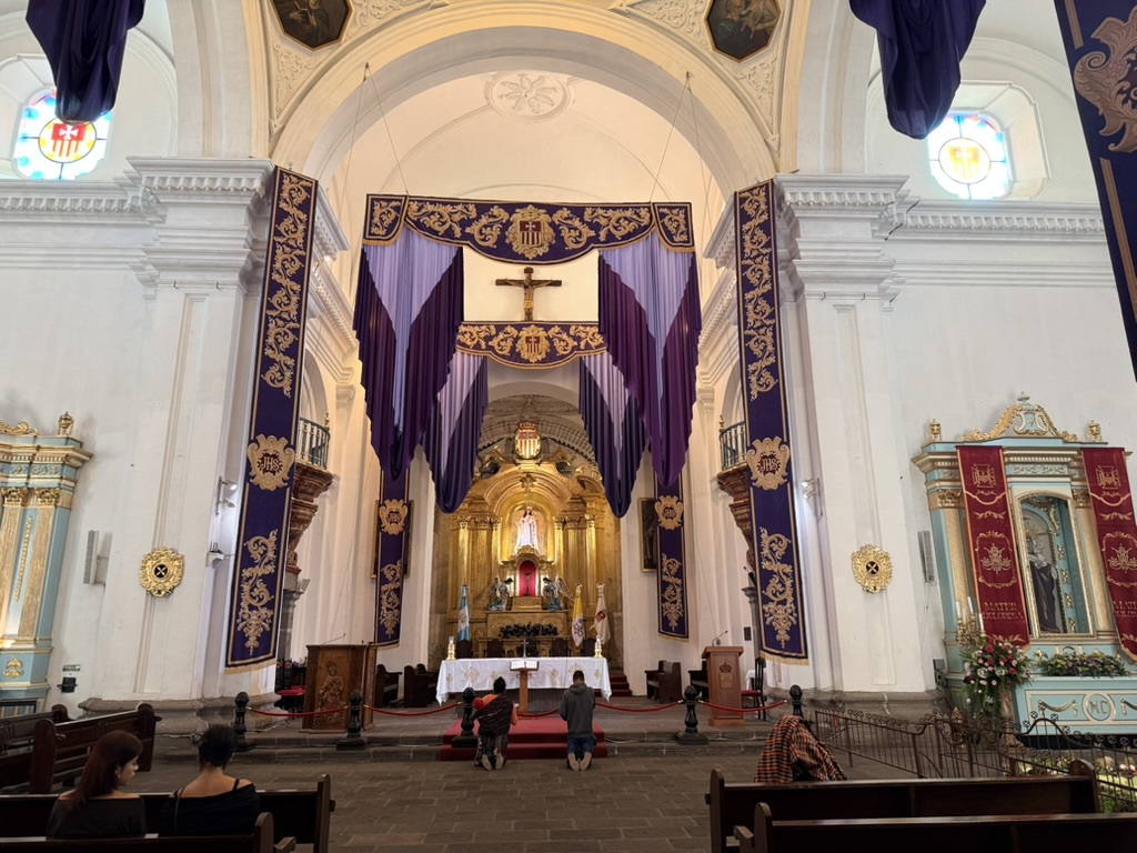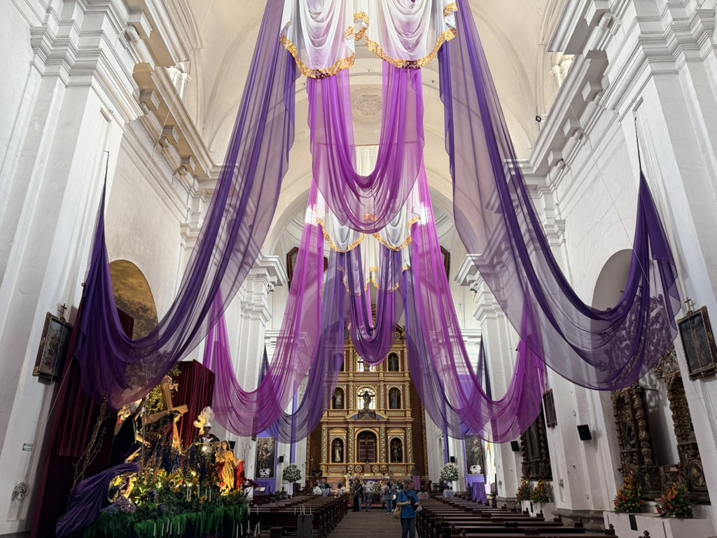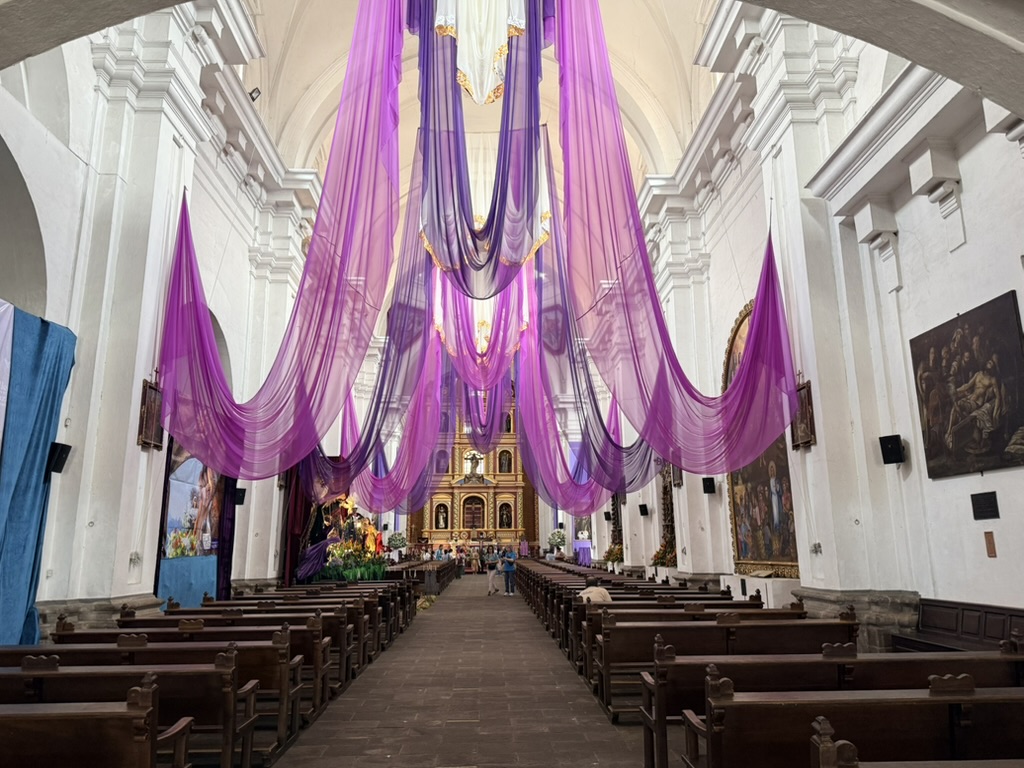 I finally figured out that Antigua is a place that takes the Lenten season (Cuaresma) seriously. Things apparently gear up during Semana Santa, but we decided after being in Colombia during Semana Santa in 2024 that we’d never again travel in Latin America during Easter Week. But it was special to be in Antigua during the Lenten season. Everything was draped in purple – statues, icons, church interiors, crosses, windows – as a symbol of mourning and anticipation of Christ’s passion. Even the jacaranda trees knew the right time to unfurl their purple blossoms. The liturgical color represents penance, mourning, humility, and spiritual reflection leading up to Easter.