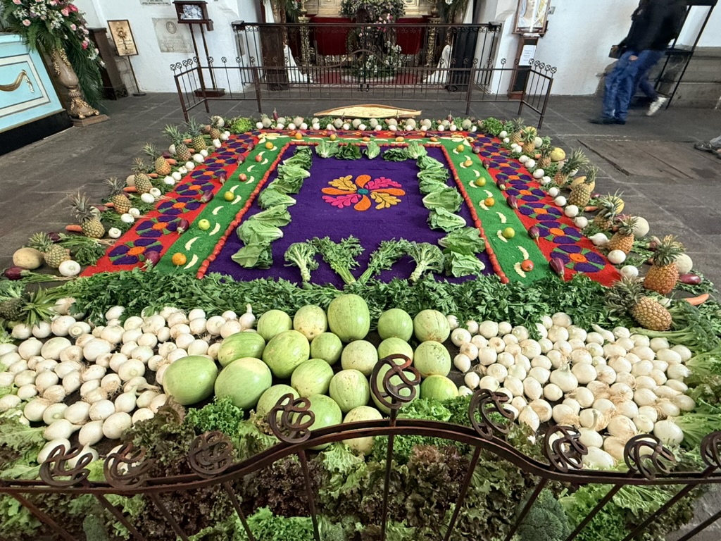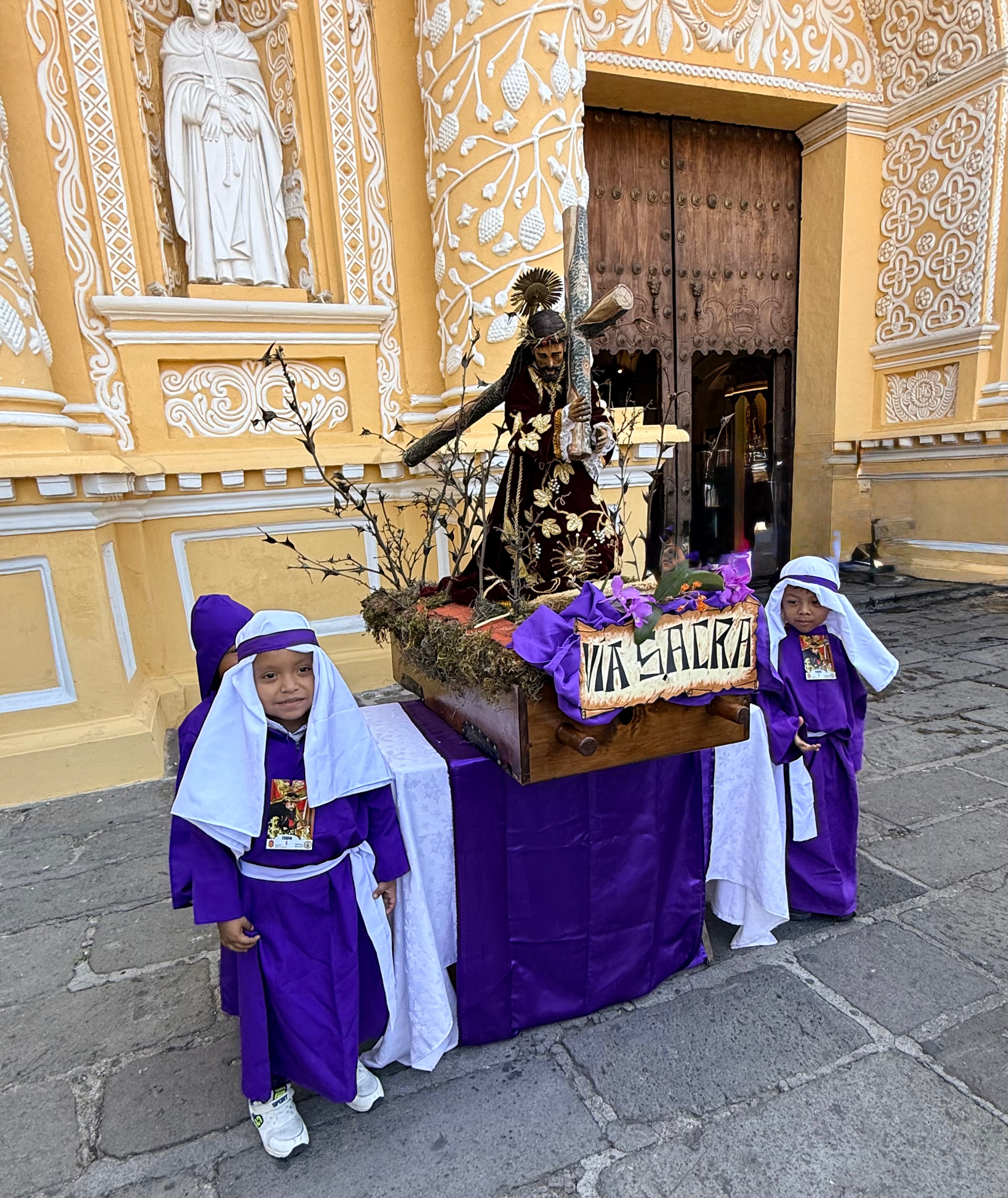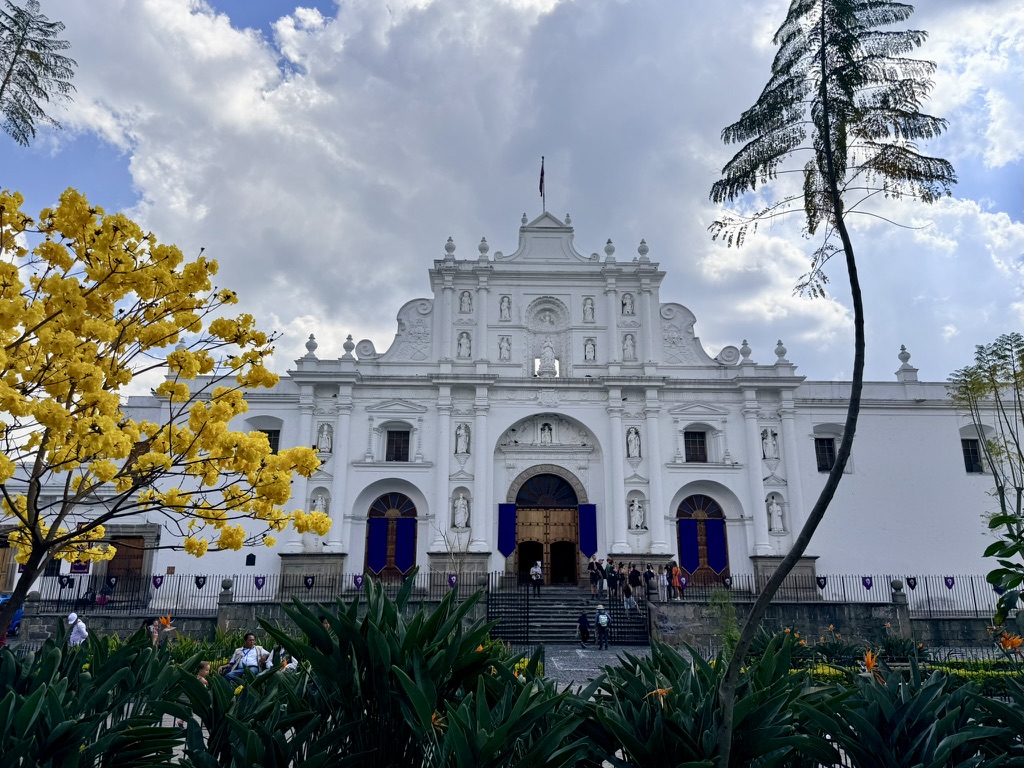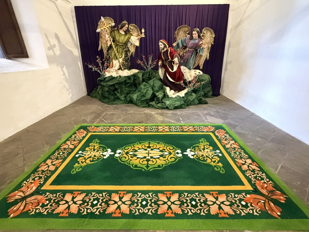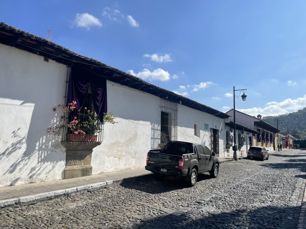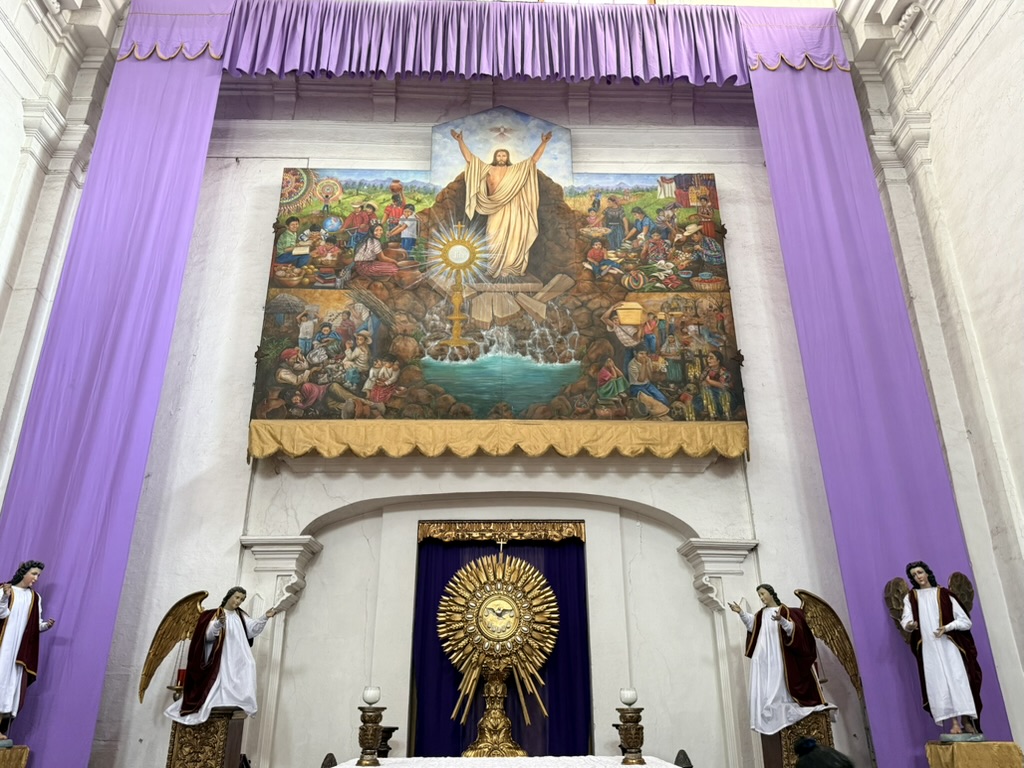 I finally figured out that Antigua is a place that takes the Lenten season (Cuaresma) seriously. Things apparently gear up during Semana Santa, but we decided after being in Colombia during Semana Santa in 2024 that we’d never again travel in Latin America during Easter Week. But it was special to be in Antigua during the Lenten season. Everything was draped in purple – statues, icons, church interiors, crosses, windows – as a symbol of mourning and anticipation of Christ’s passion. Even the jacaranda trees knew the right time to unfurl their purple blossoms. The liturgical color represents penance, mourning, humility, and spiritual reflection leading up to Easter.