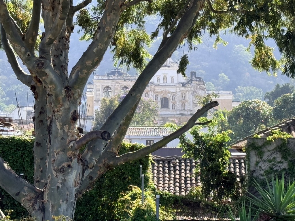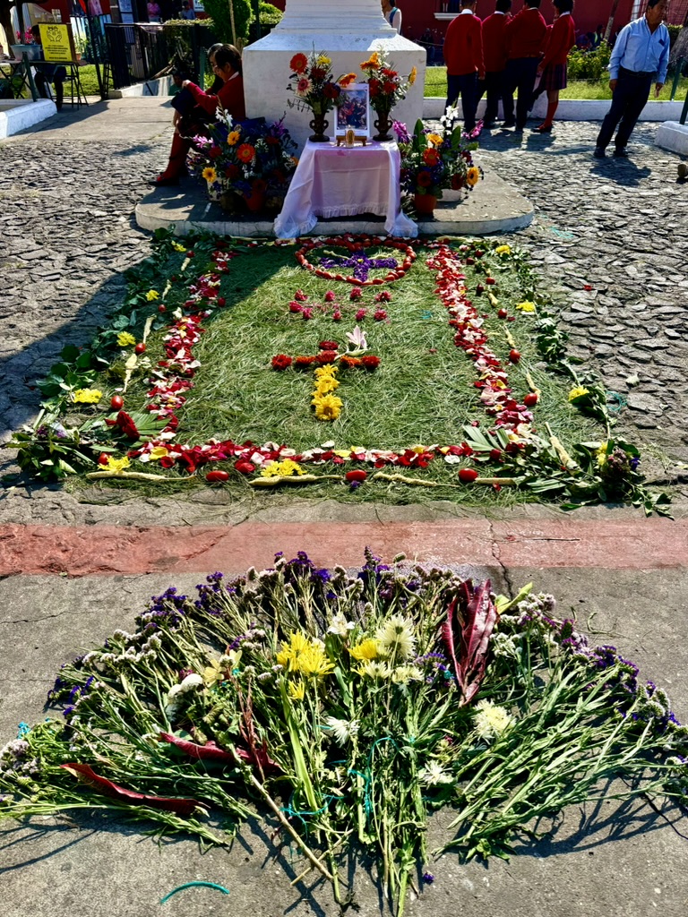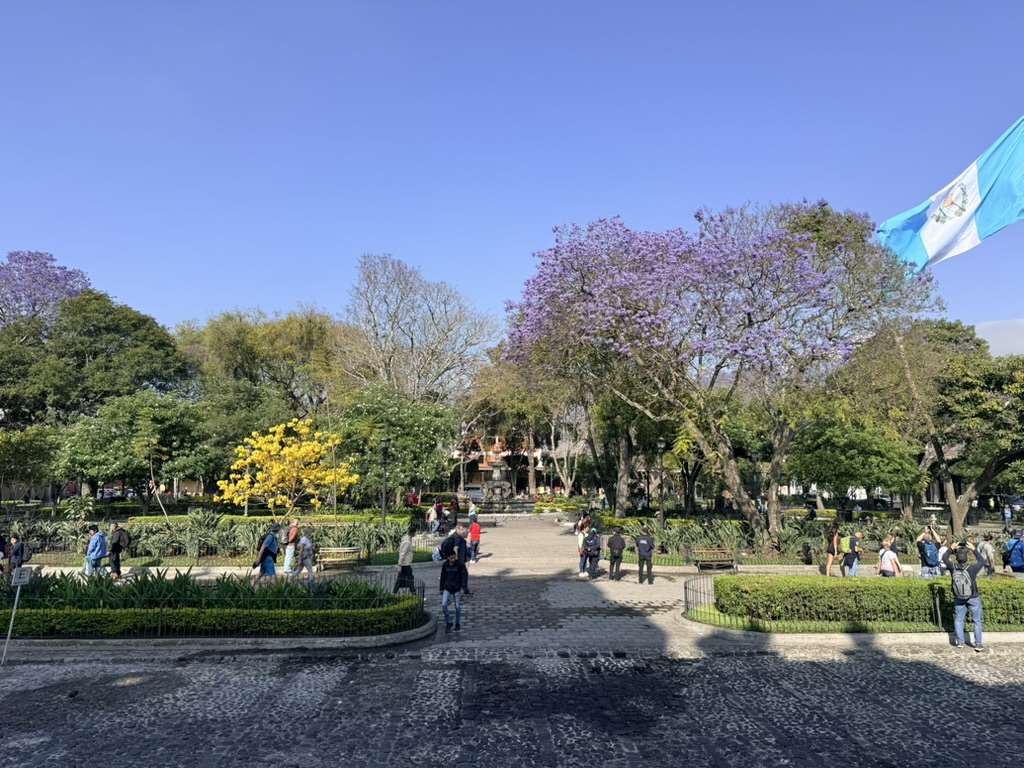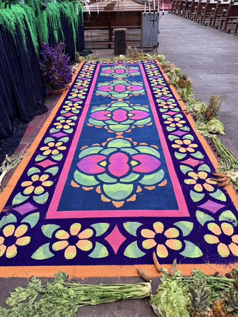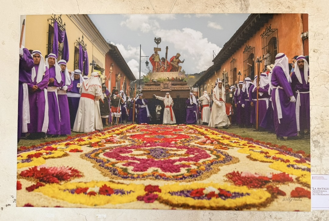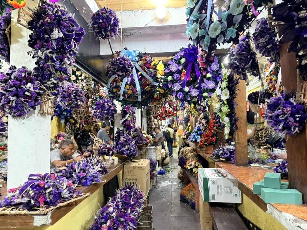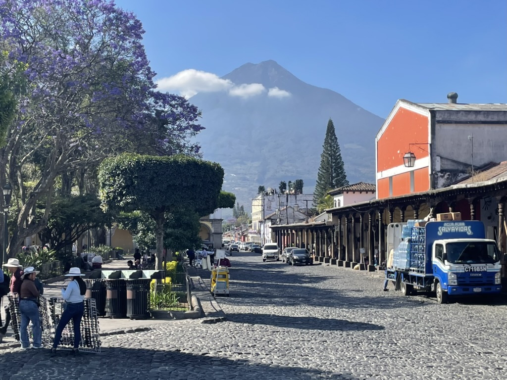 I finally figured out that Antigua is a place that takes the Lenten season (Cuaresma) seriously. Things apparently gear up during Semana Santa, but we decided after being in Colombia during Semana Santa in 2024 that we’d never again travel in Latin America during Easter Week. But it was special to be in Antigua during the Lenten season. Everything was draped in purple – statues, icons, church interiors, crosses, windows – as a symbol of mourning and anticipation of Christ’s passion. Even the jacaranda trees knew the right time to unfurl their purple blossoms. The liturgical color represents penance, mourning, humility, and spiritual reflection leading up to Easter.
