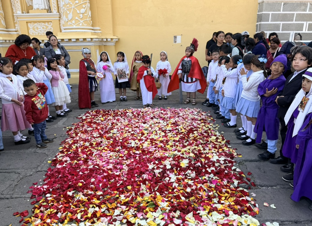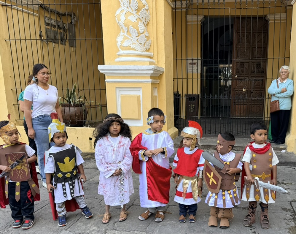Specific churches organize velaciones (vigils) every Friday during Lent. Velaciones are deeply spiritual events in which specific churches create a “vigil” – an artistic display of statues, candles, and floral arrangements – that invites the public to reflect on specific religious themes. On Friday of our stay, in front of the gorgeous yellow Baroque Iglesia Merced, we found children dressed as Roman authorities standing somberly around a beautiful alfombra asserín, or sawdust carpet. These carpets are ever-present throughout Lent in Antigua.