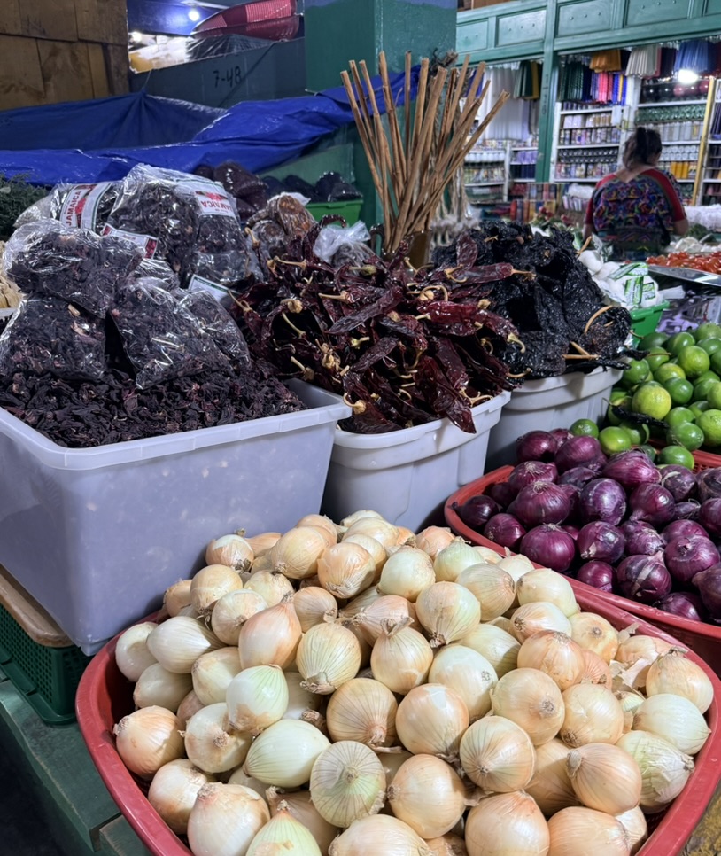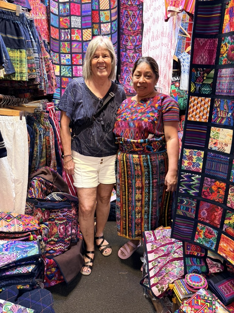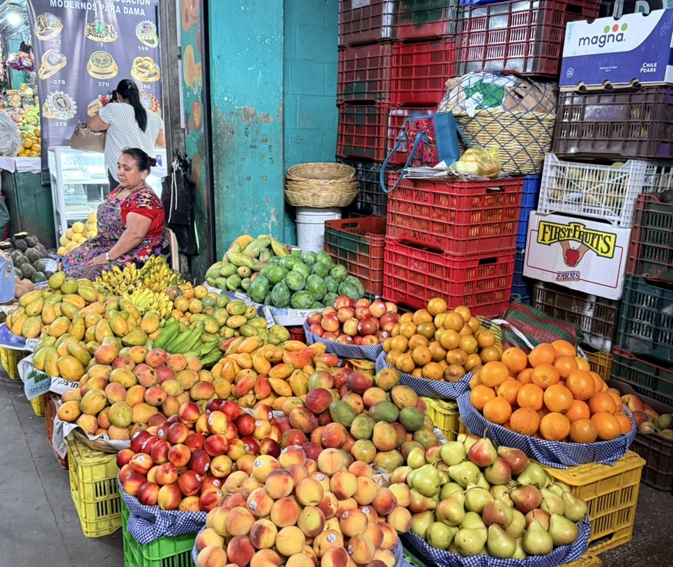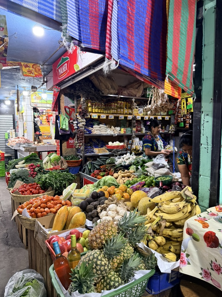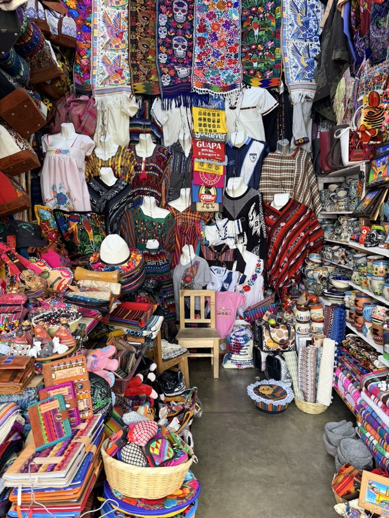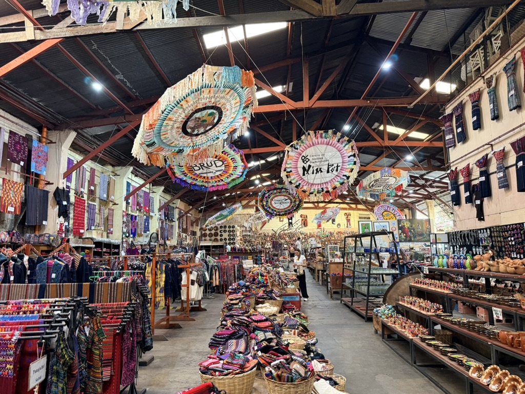 The vibrancy, colors and textiles are found in the clothing of the women, in their specially woven Huipil blouses and skirts that they wear in their everyday lives. They are found on a young girl wearing a blue quinceañera dress, in ice cream carts with pastel-colored flavors displayed, and fruit carts decked out in plastic flowers. They are found in the Mercado Local where locals sell fruits and vegetables; vendors outside sell sliced mango, avocado, and melon. Men sell wooden tube-like musical instruments or beaded hummingbirds to hang from rearview mirrors. In the Mercado de Artesanías and at the Nim Po’t cooperative, women sell candles, masks, Huipil blouses, colorful pants, tablecloths, pillows, handbags and change purses. We wandered around the market and ate lunch at the market, at the Comedor Samaritana, where we both ate meals that somehow messed with our stomachs. Of course, I had to buy some textiles: two blouses and a pair of loose pants, a patchwork of Guatemalan textiles.