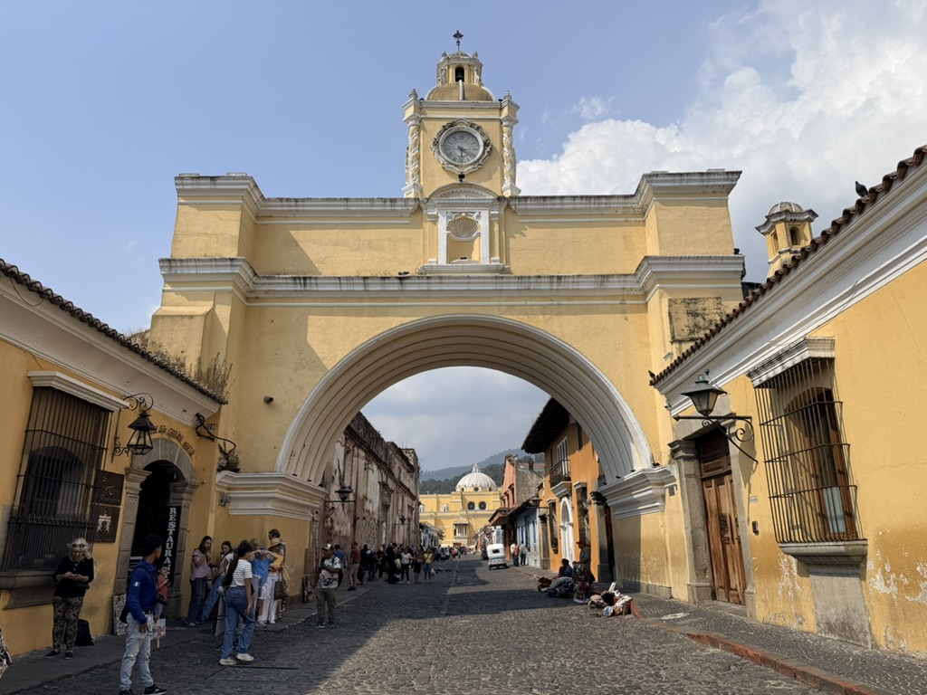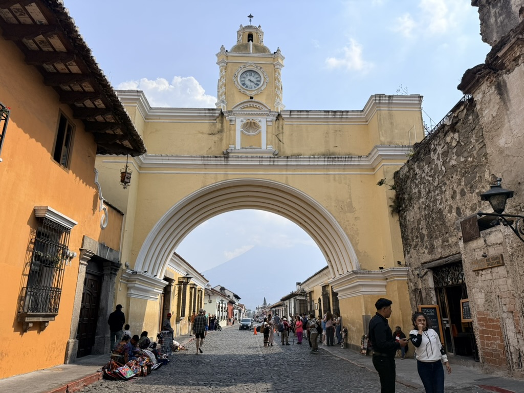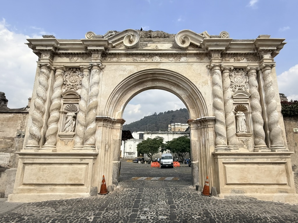 Another landmark, the Arco de Santa Catalina, which frames Volcán Agua, was likely damaged but survived the 1773 earthquake. It was built in 1694 to enable the nuns from the Santa Catalina convent to cross the street without being seen. The clock tower was added in the 19th century.