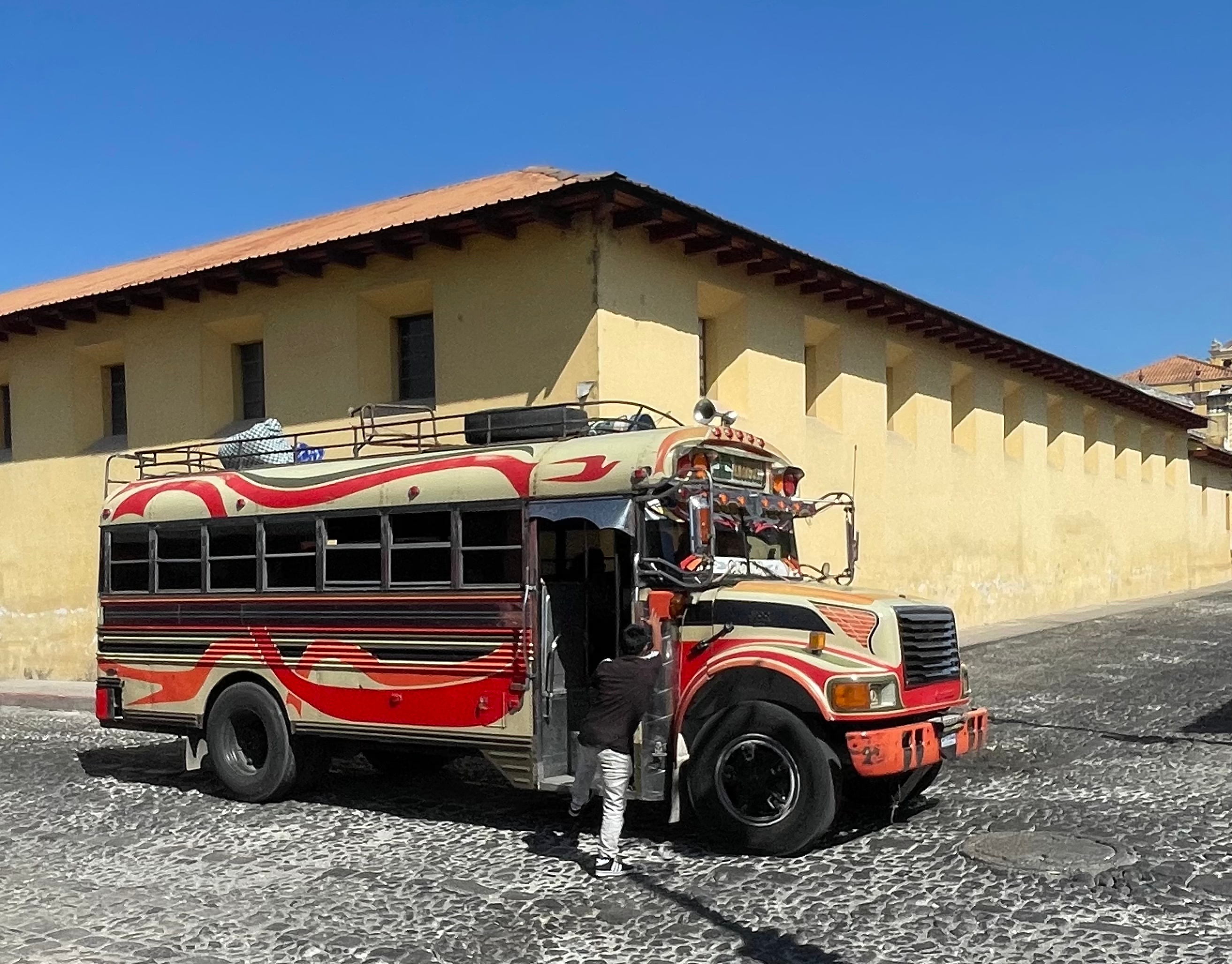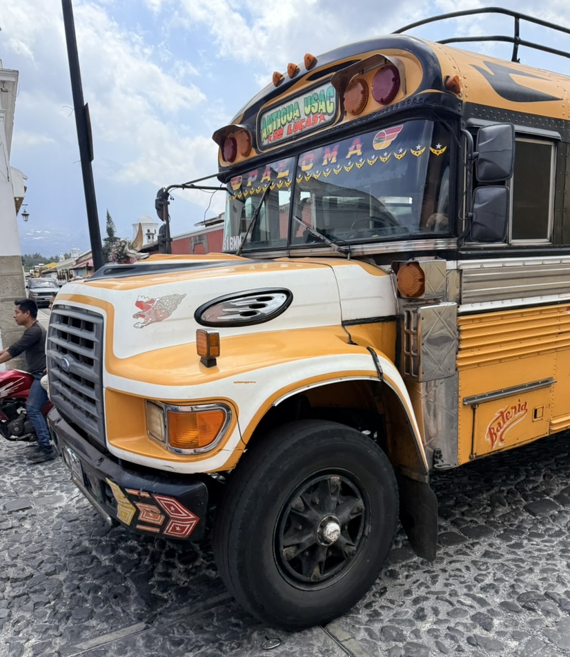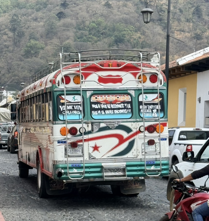 Humor is founds in the so-called chicken buses buzzing around the town. These are repurposed school buses that offer cheap transport to residents and visitors alike. Each bus is specially named and decorated with personal flourishes such as hood ornaments resembling swans, eagles, horses, and even busty females. Each bus is named after a woman and the ultimate destination is written above the front window. Bright lights line the outside of the buses. An assistant stands in the open door, yelling out destinations and collecting money.
