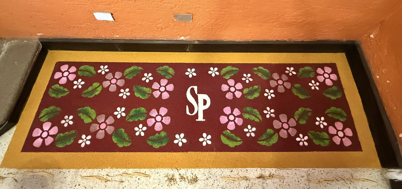 Antigua’s character dawned on me slowly, with sound bites reluctantly offered by our private driver from Guatemala City on a late Wednesday afternoon in early March, right after we’d arrived in the country. The driver was mostly taciturn during the nearly 1 1/2 hours it took us to escape Guatemala City at rush hour in gridlocked traffic. Only as we broke ranks with the city and escaped in darkness onto the mountain roads leading to Antigua did he start to talk. What I heard were enthusiastic Spanish words: “alfombras de aserrín,” “procesiónes,” “domingo,” “cuaresma,” and “velaciones.” I caught and understood the words “carpets,” “processions” and “Sunday” and I got the gist that long processions occurred on Sundays that went on for hours. I wasn’t sure what the carpets were until we checked into our hotel, Hotel Posada San Pedro, which our friend Carol had recommended after her visit to Antigua some 35 years ago. The hotel didn’t look like it had been upgraded much during that time period. The hotel did however have one of the carpets alluded to by our driver.