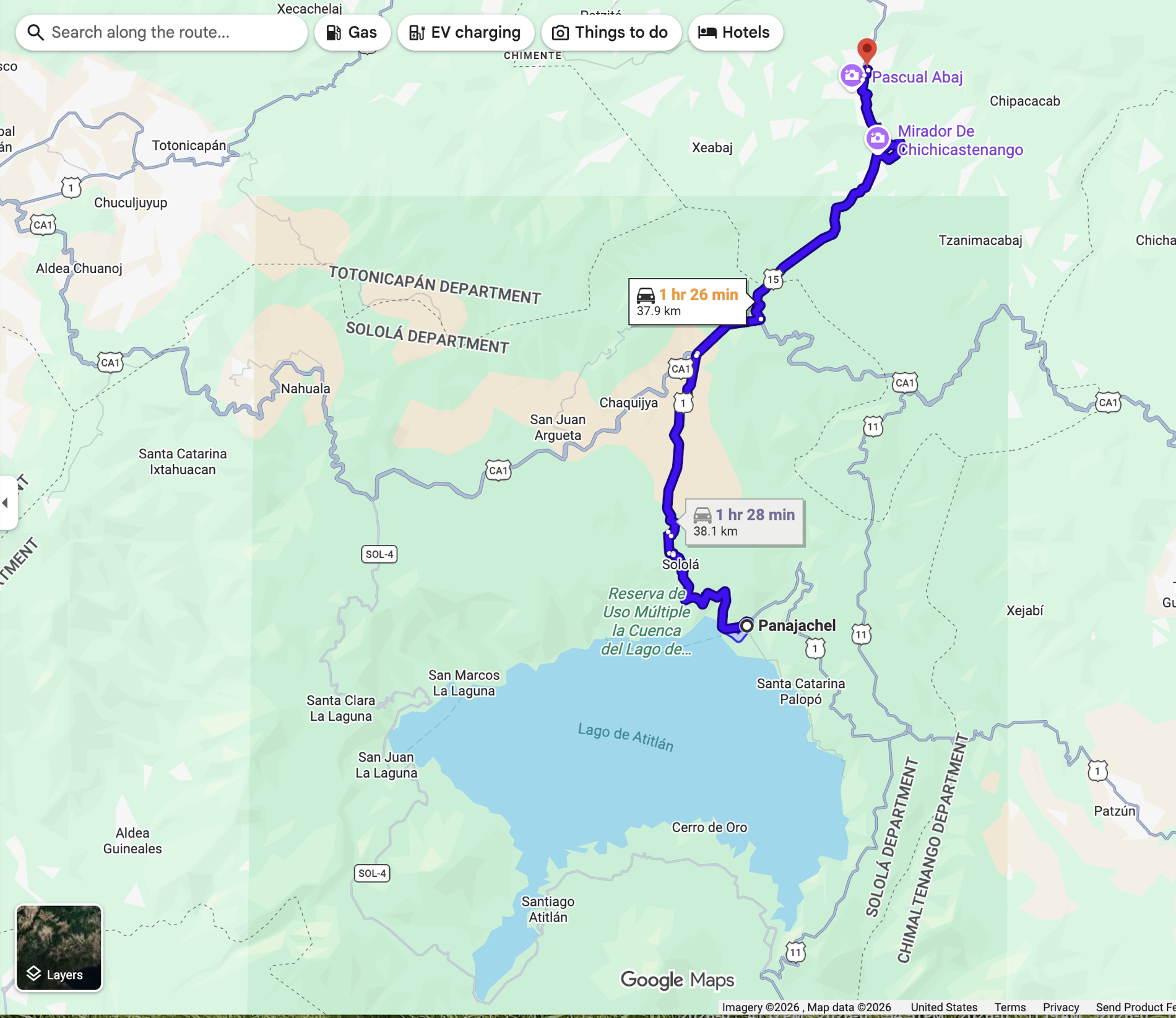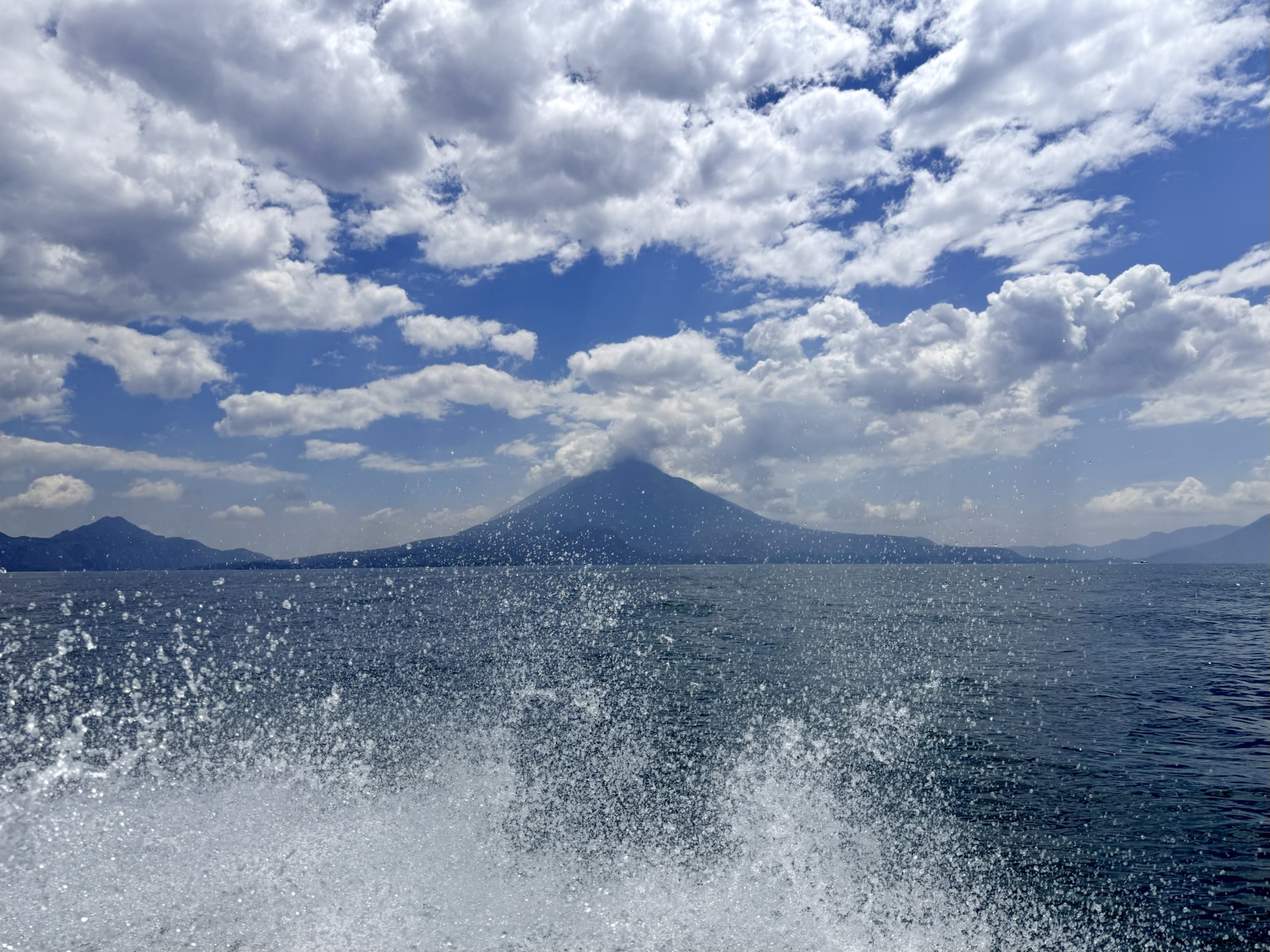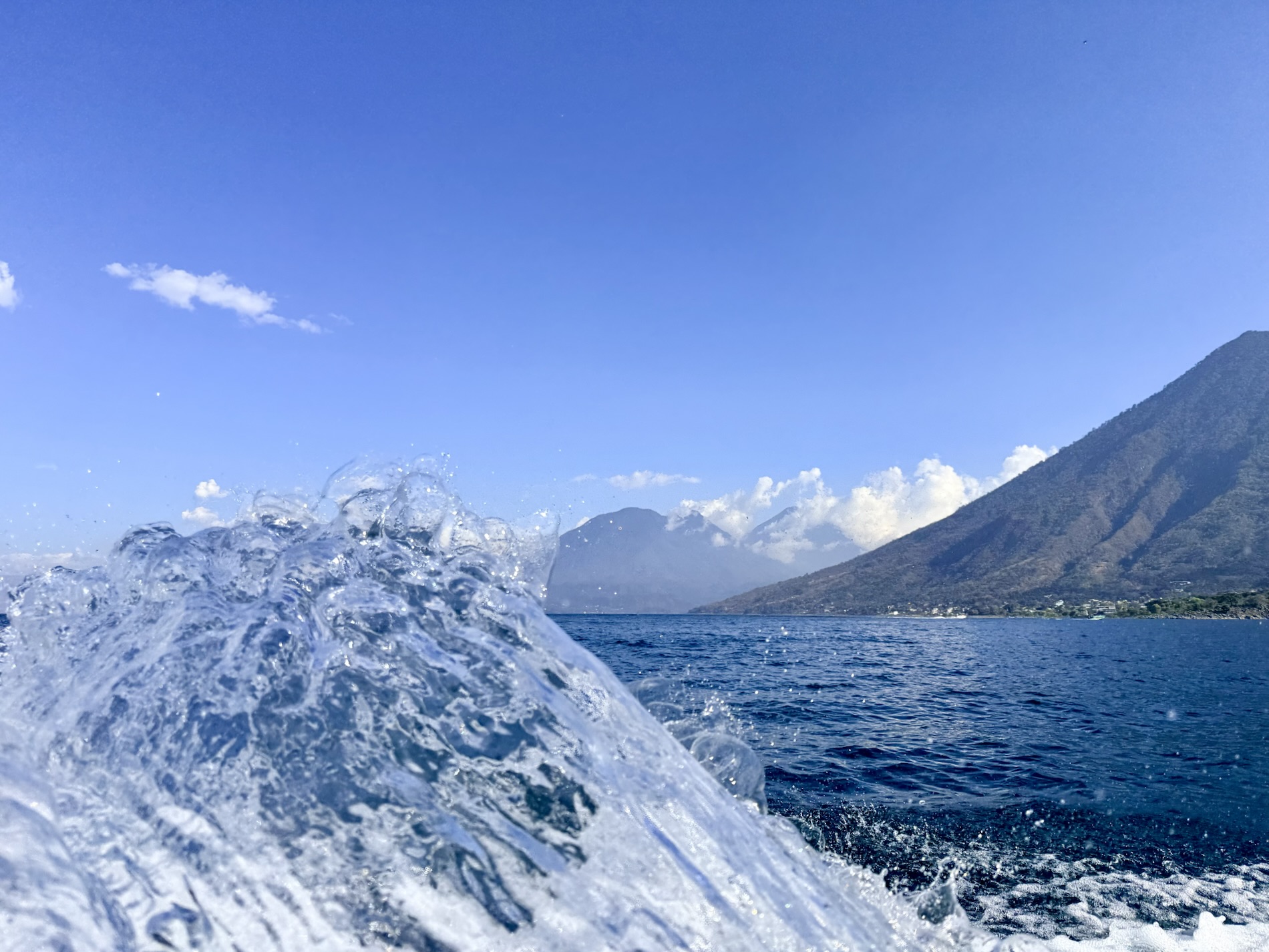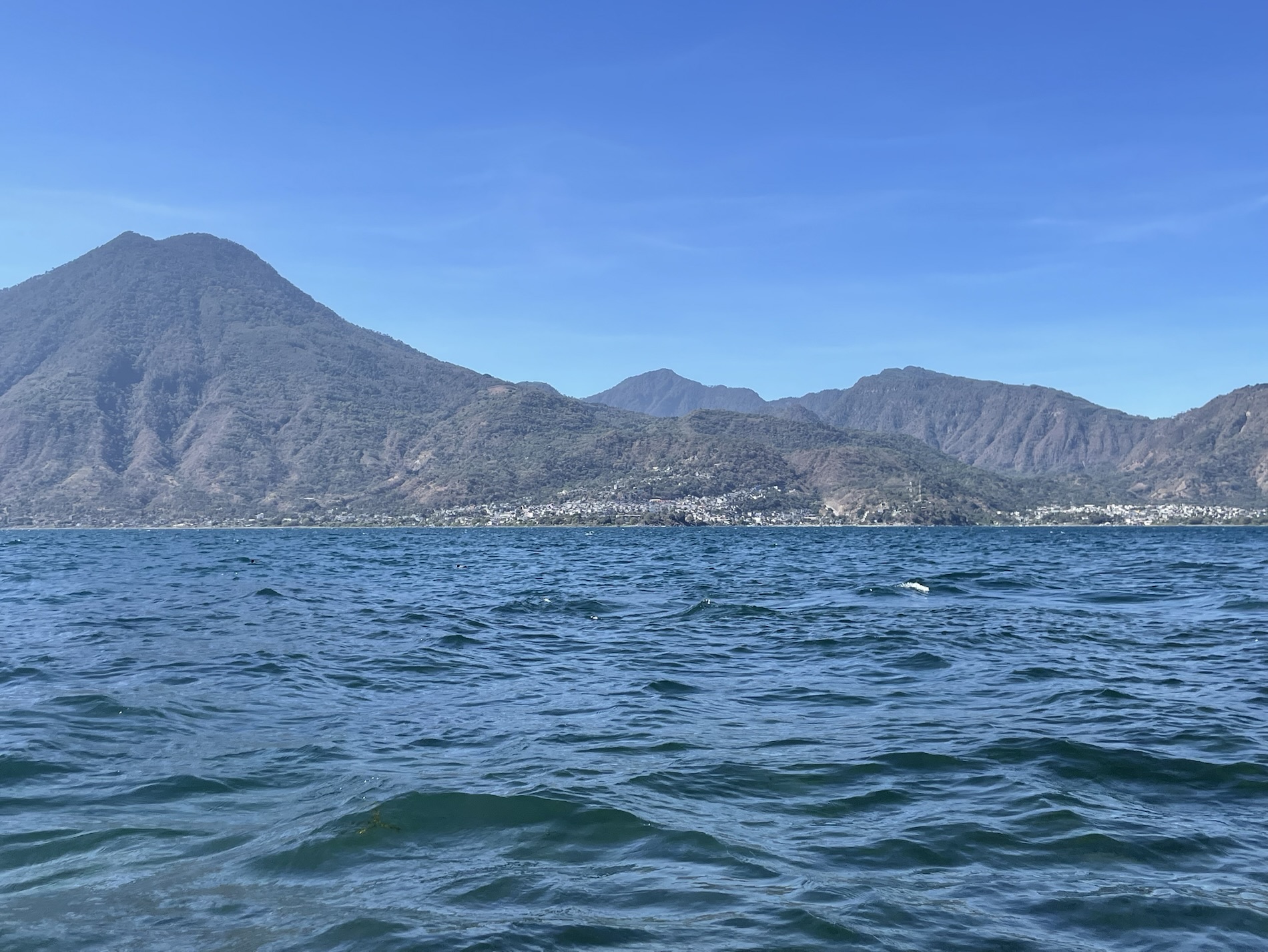 Lake Atitlán is a natural lake filling an enormous caldera formed from a supervolcanic eruption some 79,500 years ago. It is in the Guatemalan Highlands (over 5,000 feet in elevation) in southwestern Guatemala. With a maximum depth of 1,120 feet (340 meters), it is the deepest lake in Central America. It is fed by two nearby rivers and doesn’t drain into the ocean and is shaped by deep surrounding escarpments and three volcanoes on its southern flank. Atitlán means “between the waters” in the Nahuatl language. The culture of the towns and villages surrounding the lake is strongly influenced by the Mayan people, who make up nearly 42% of Guatemala’s population.