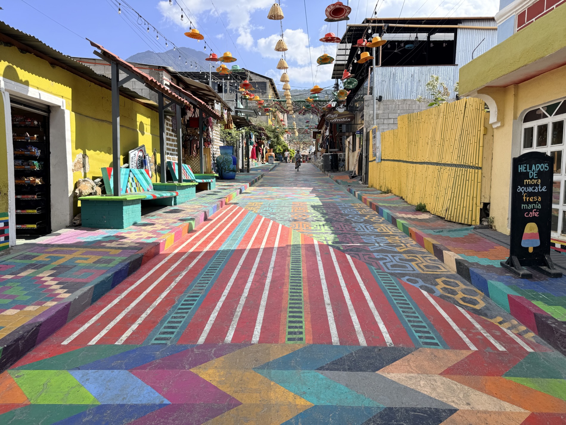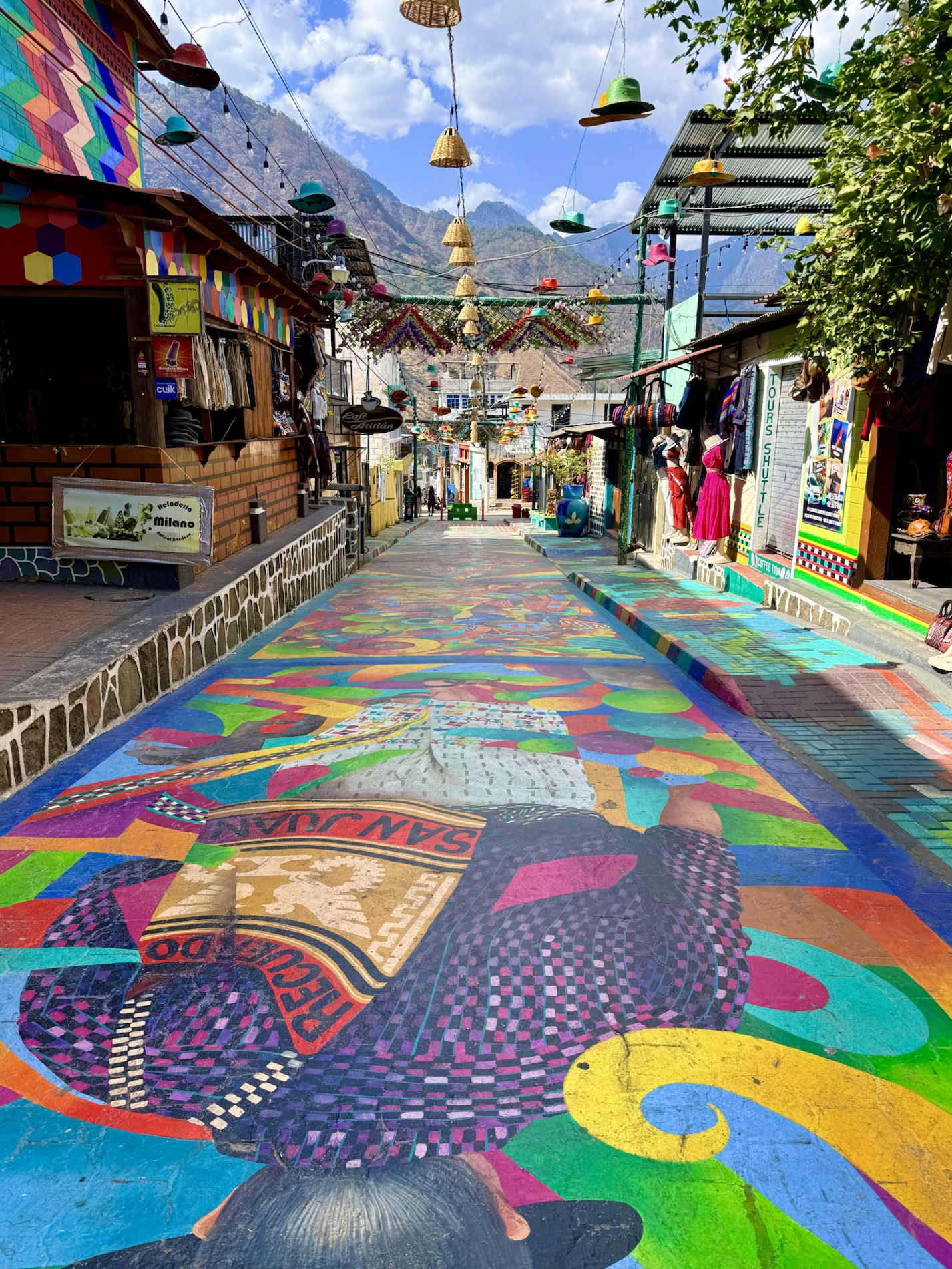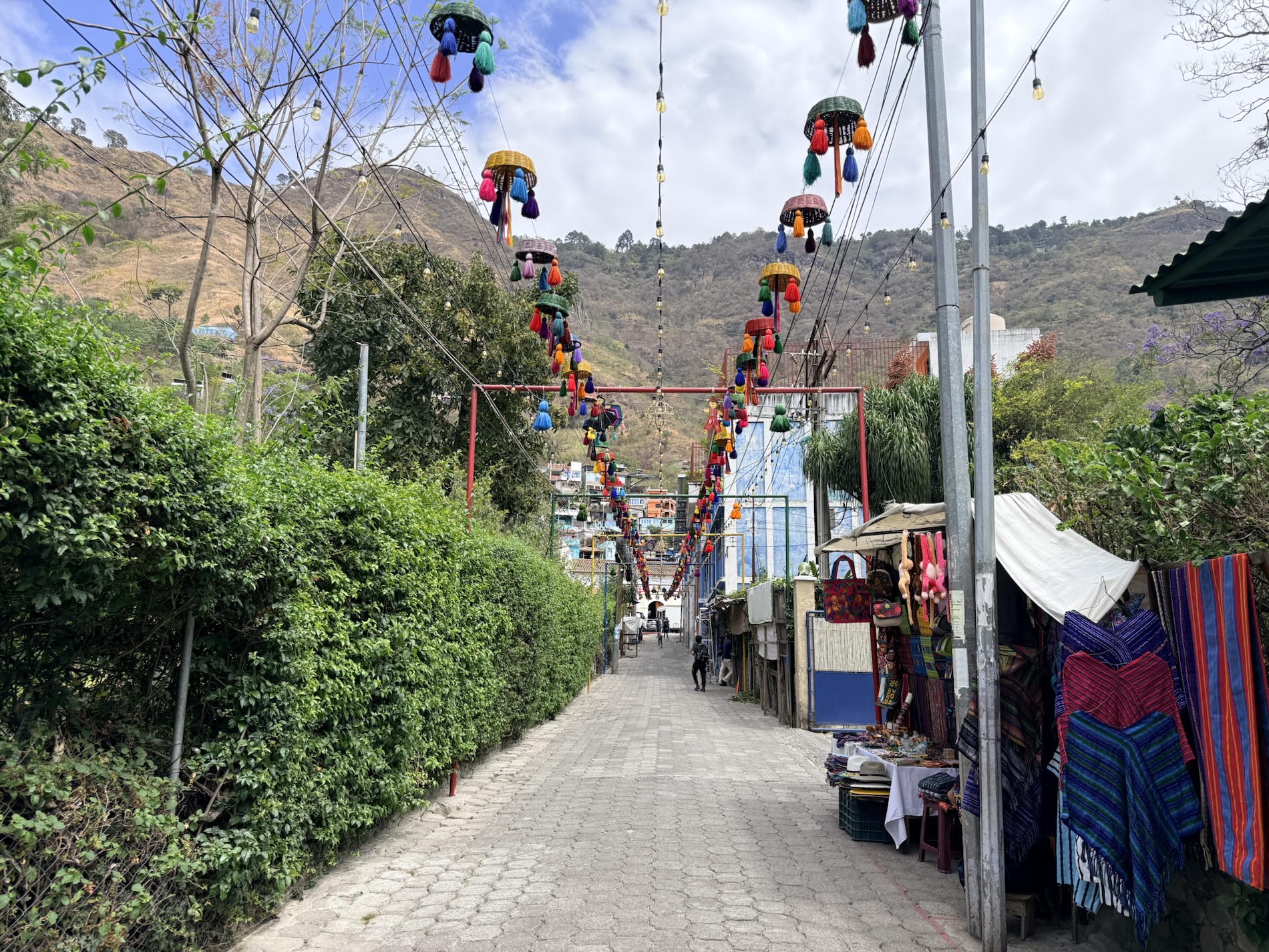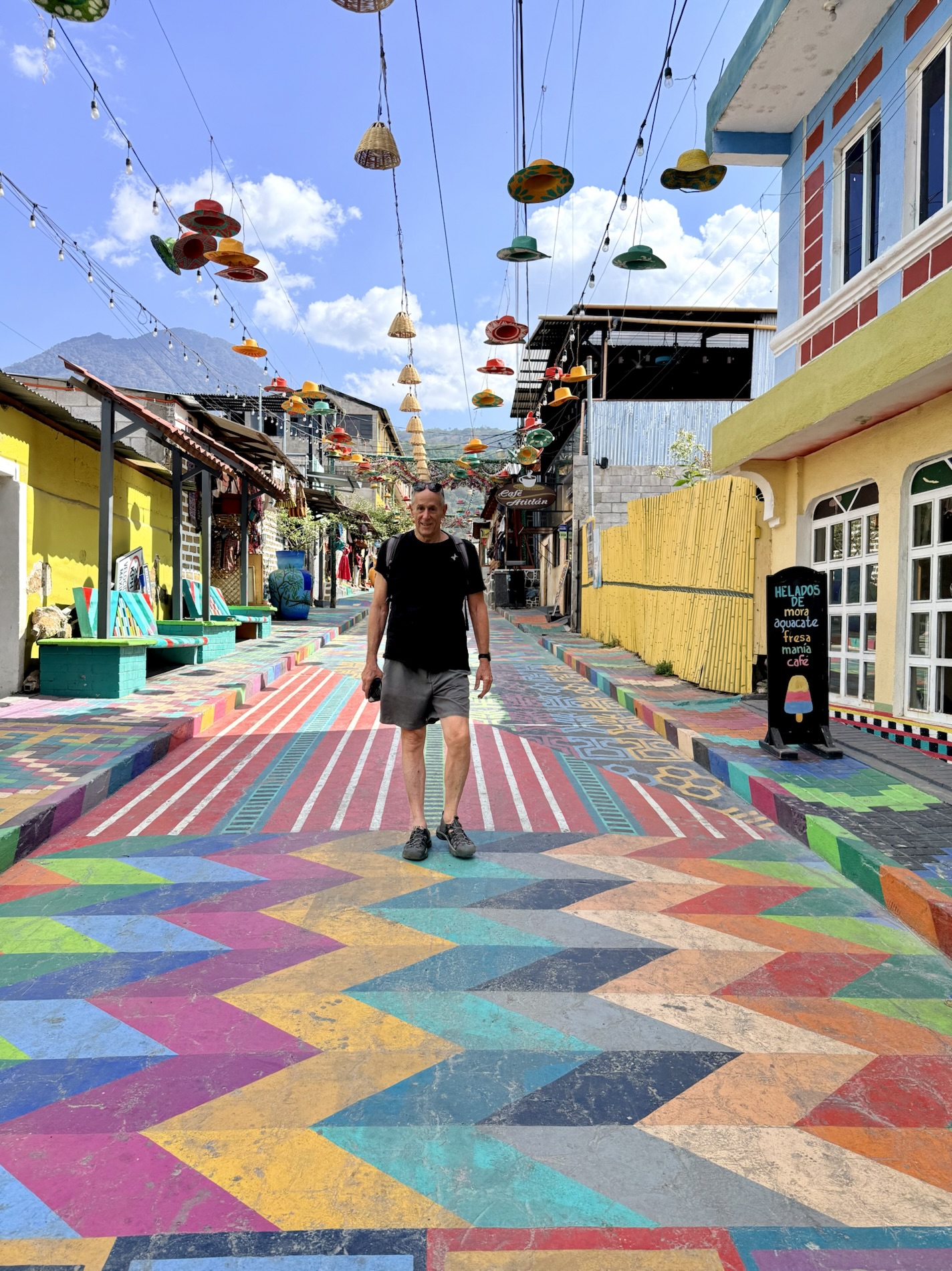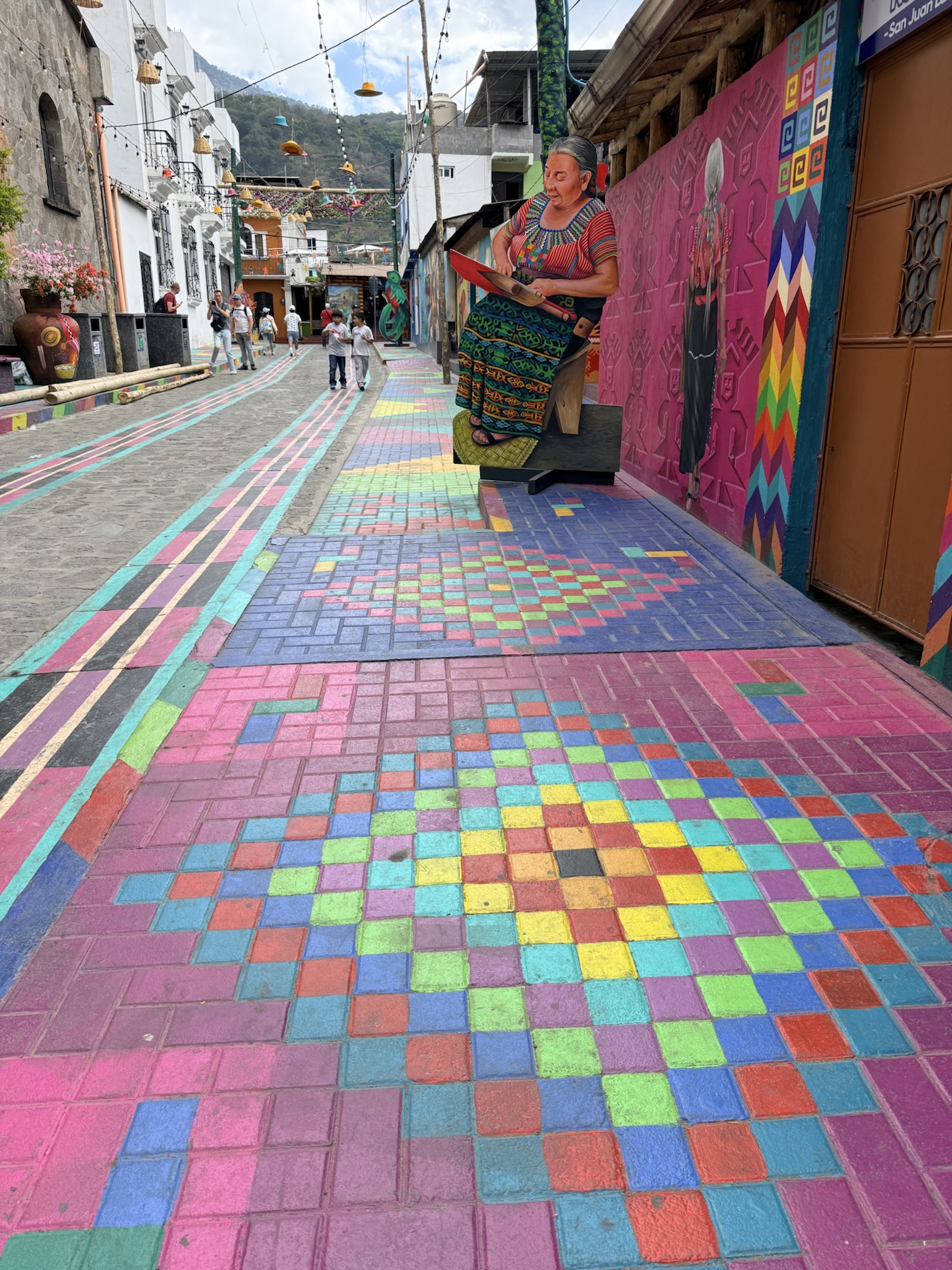 We ate lunch at Deleite Ancestral Experiencia Gastronomica Tz’utujil, which offered traditional Tz’utujil food. The town is awash with beautiful murals that symbolize Mayan tradition. For us, this was the most gorgeous of all the towns. Pavement is painted and two streets are covered in umbrellas and hats: Calle de las Sombrillas and Calle de los Sombreros.
