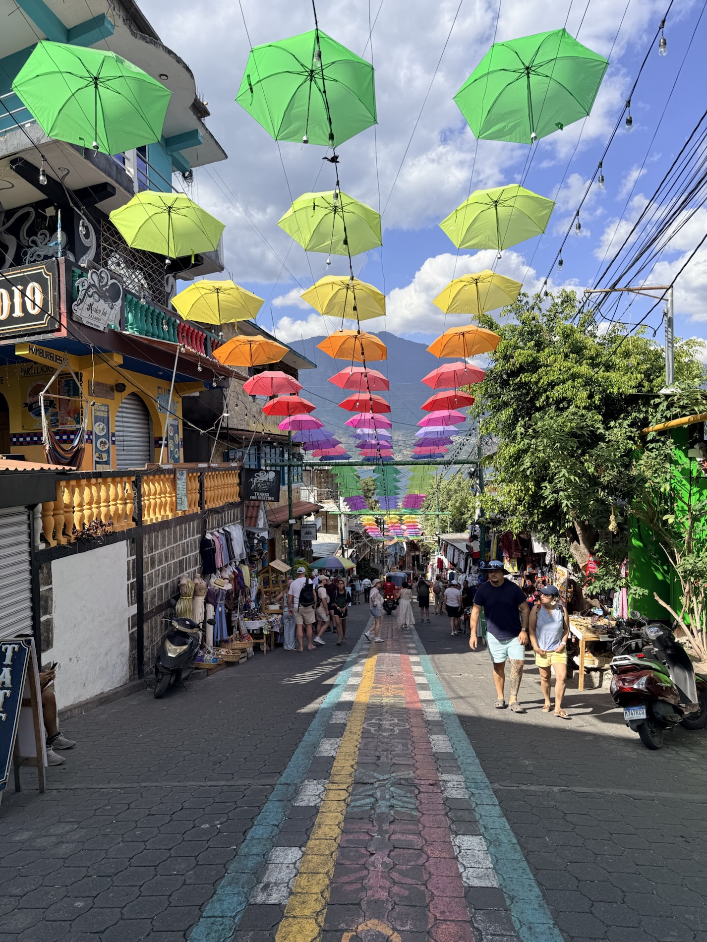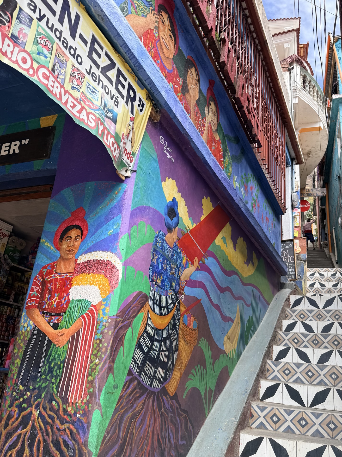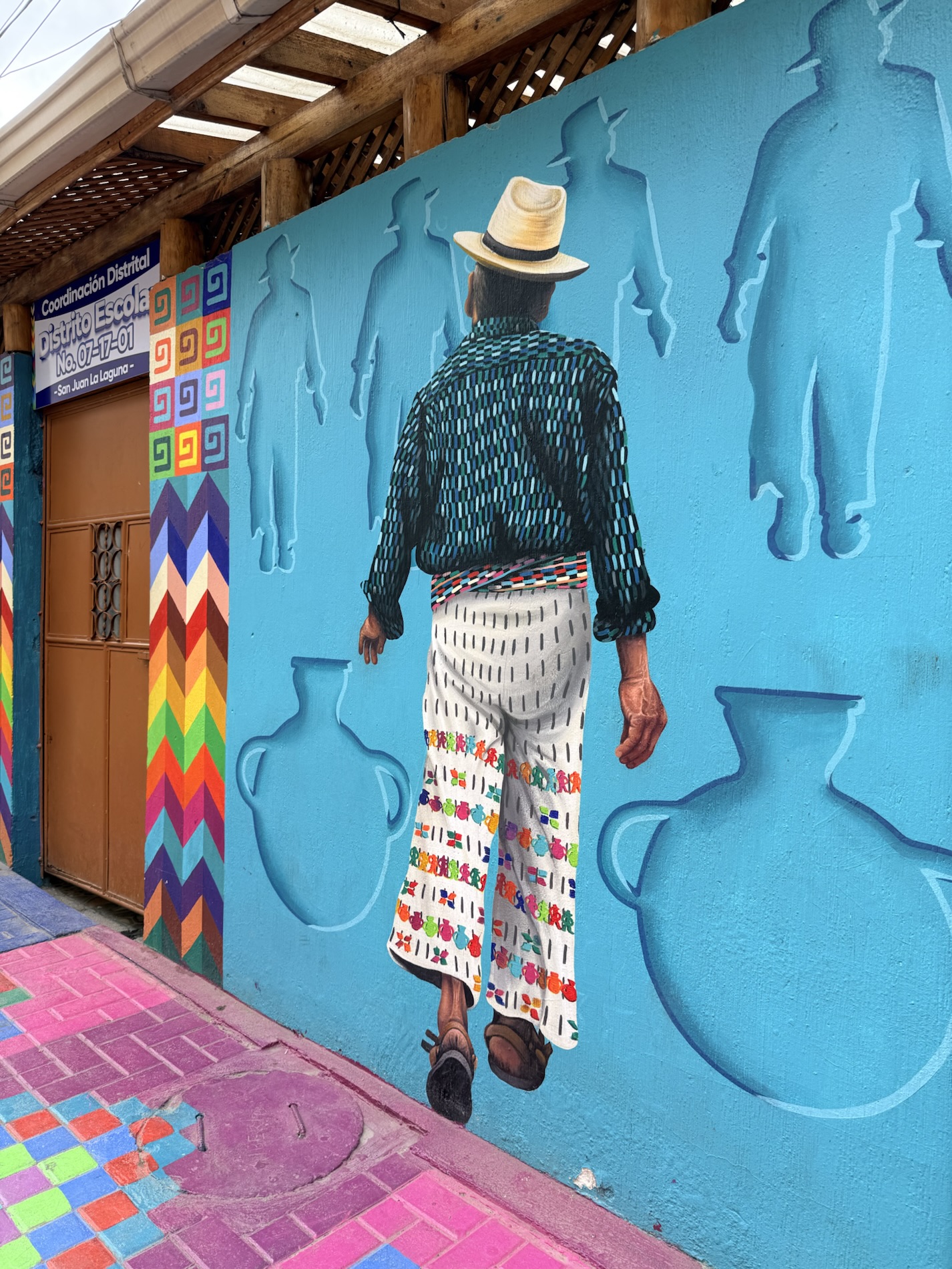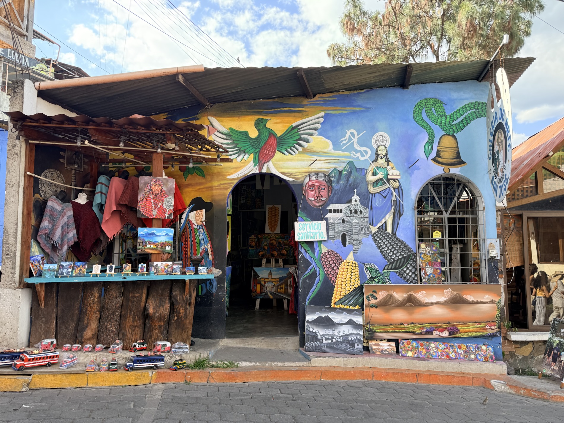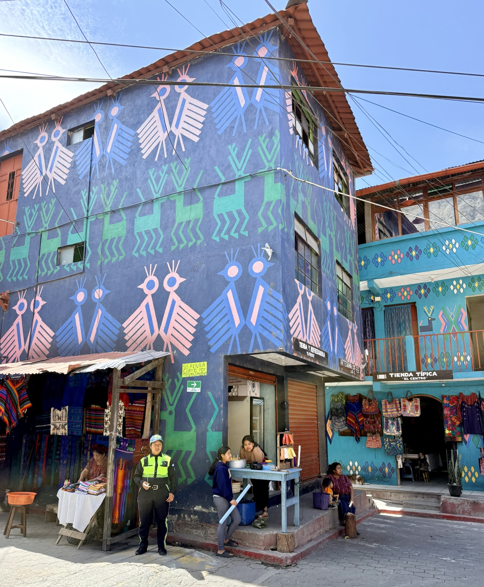We ate lunch at Deleite Ancestral Experiencia Gastronomica Tz’utujil, which offered traditional Tz’utujil food. The town is awash with beautiful murals that symbolize Mayan tradition. For us, this was the most gorgeous of all the towns. Pavement is painted and two streets are covered in umbrellas and hats: Calle de las Sombrillas and Calle de los Sombreros.