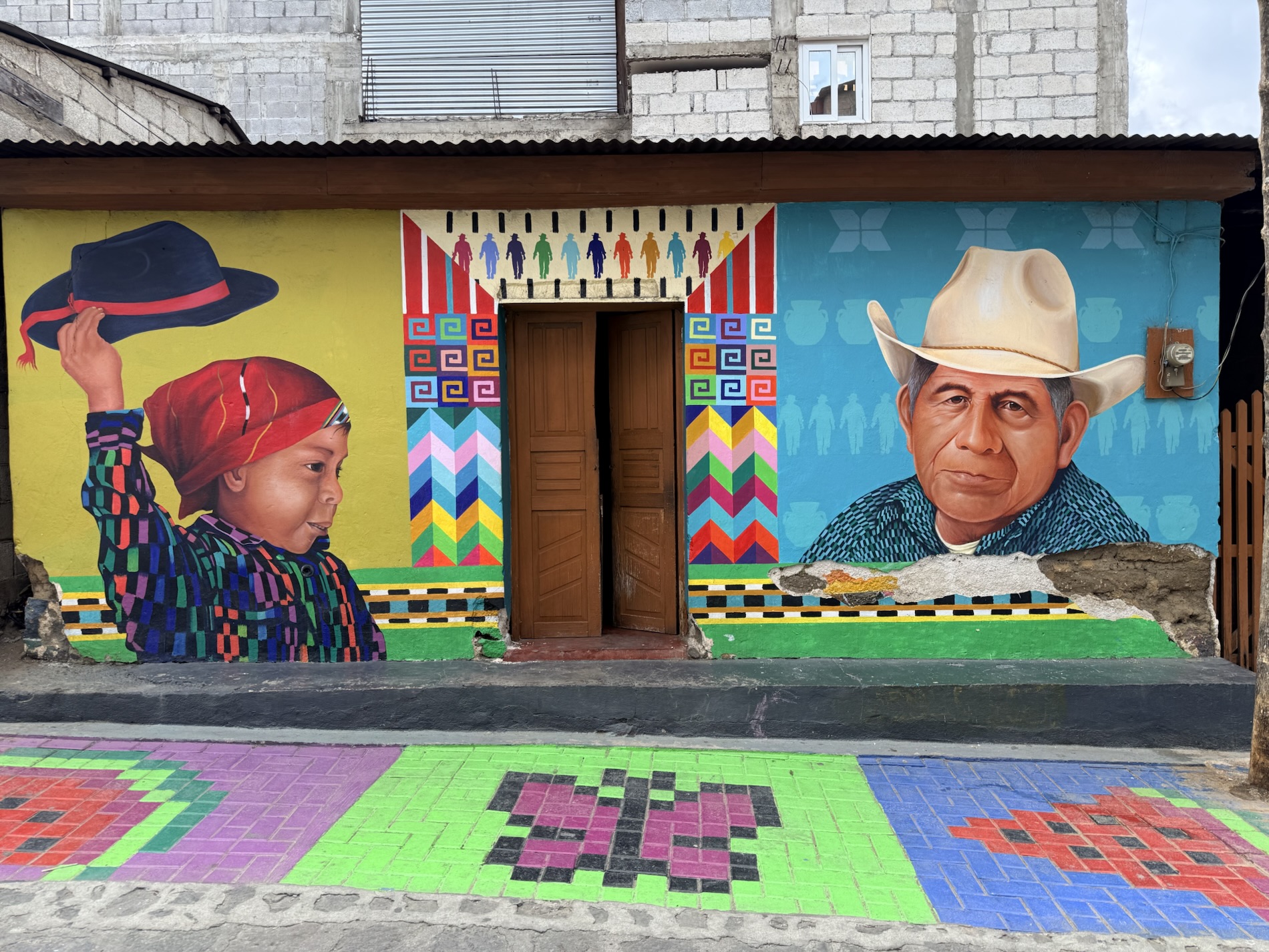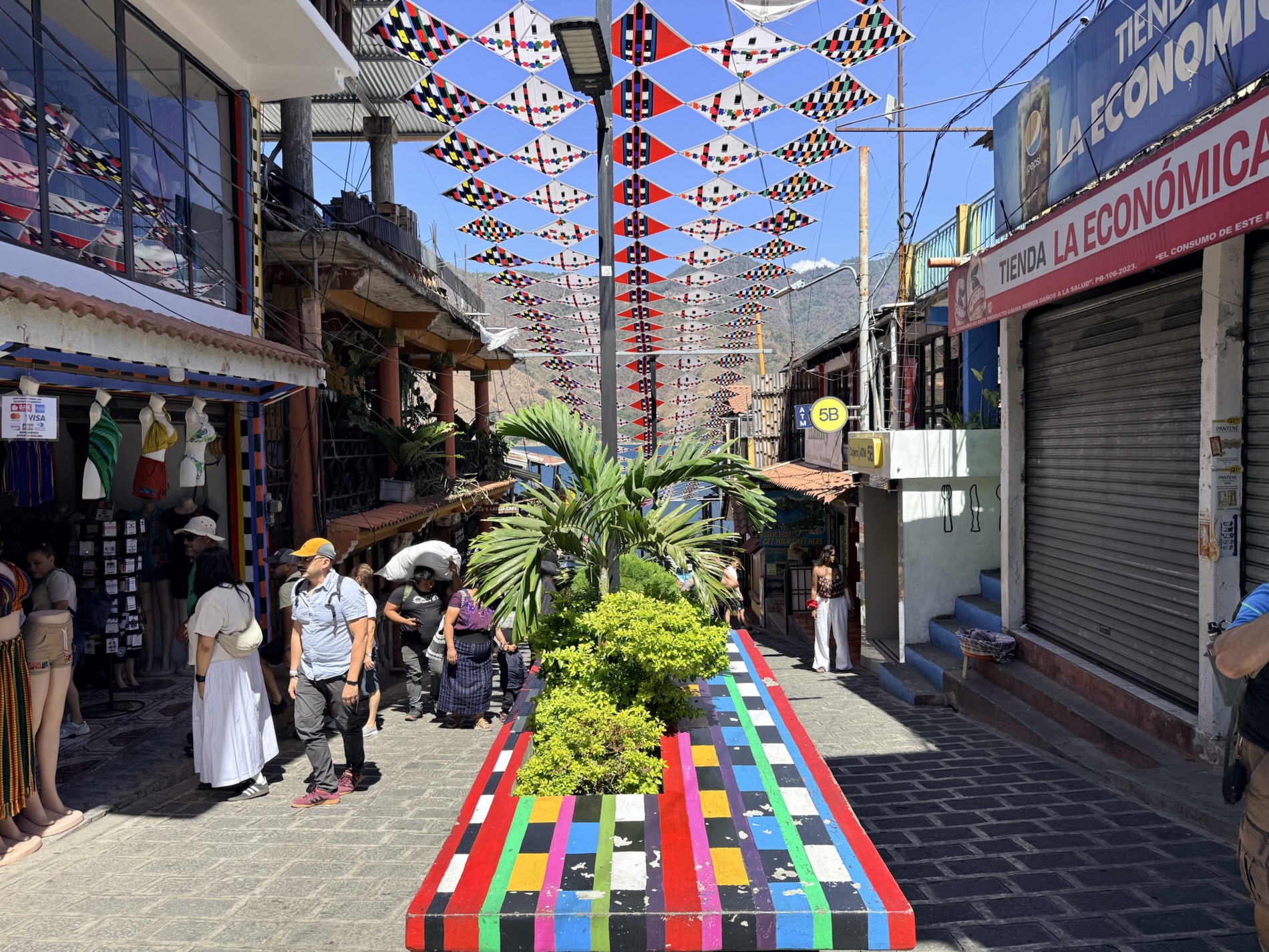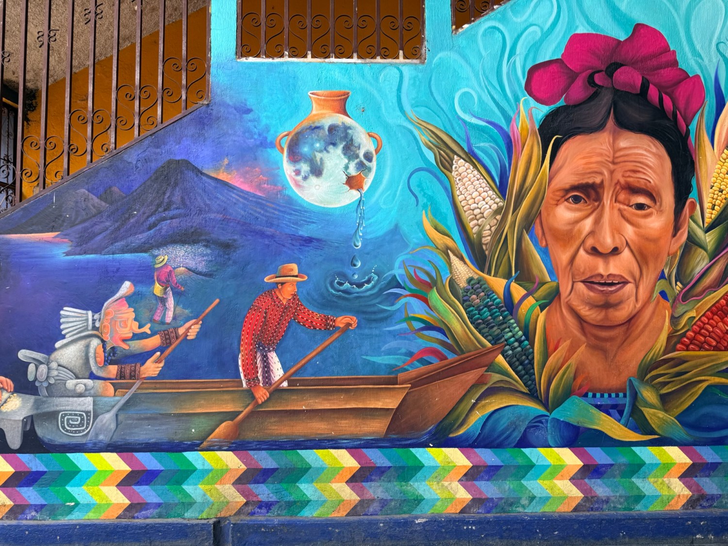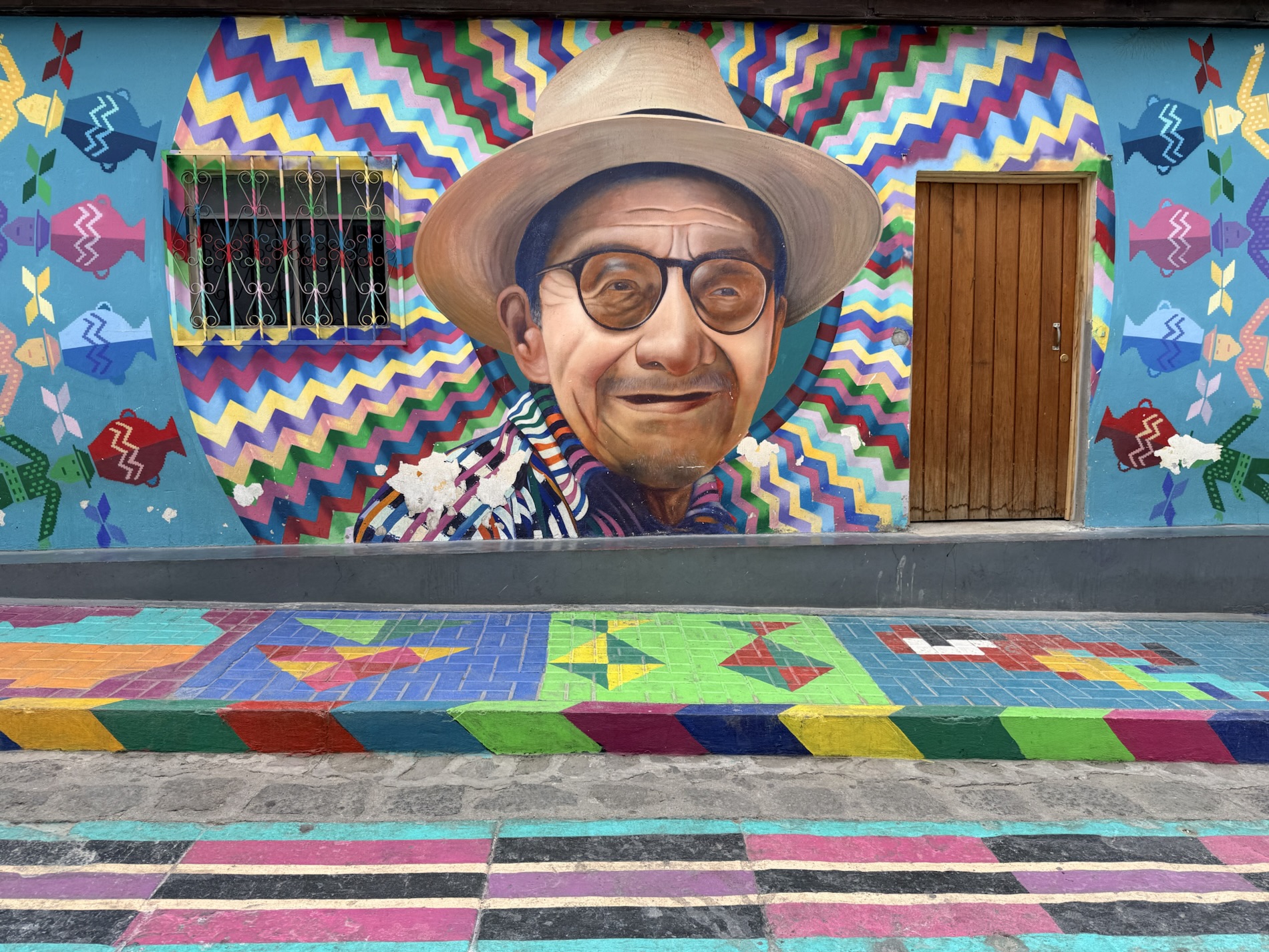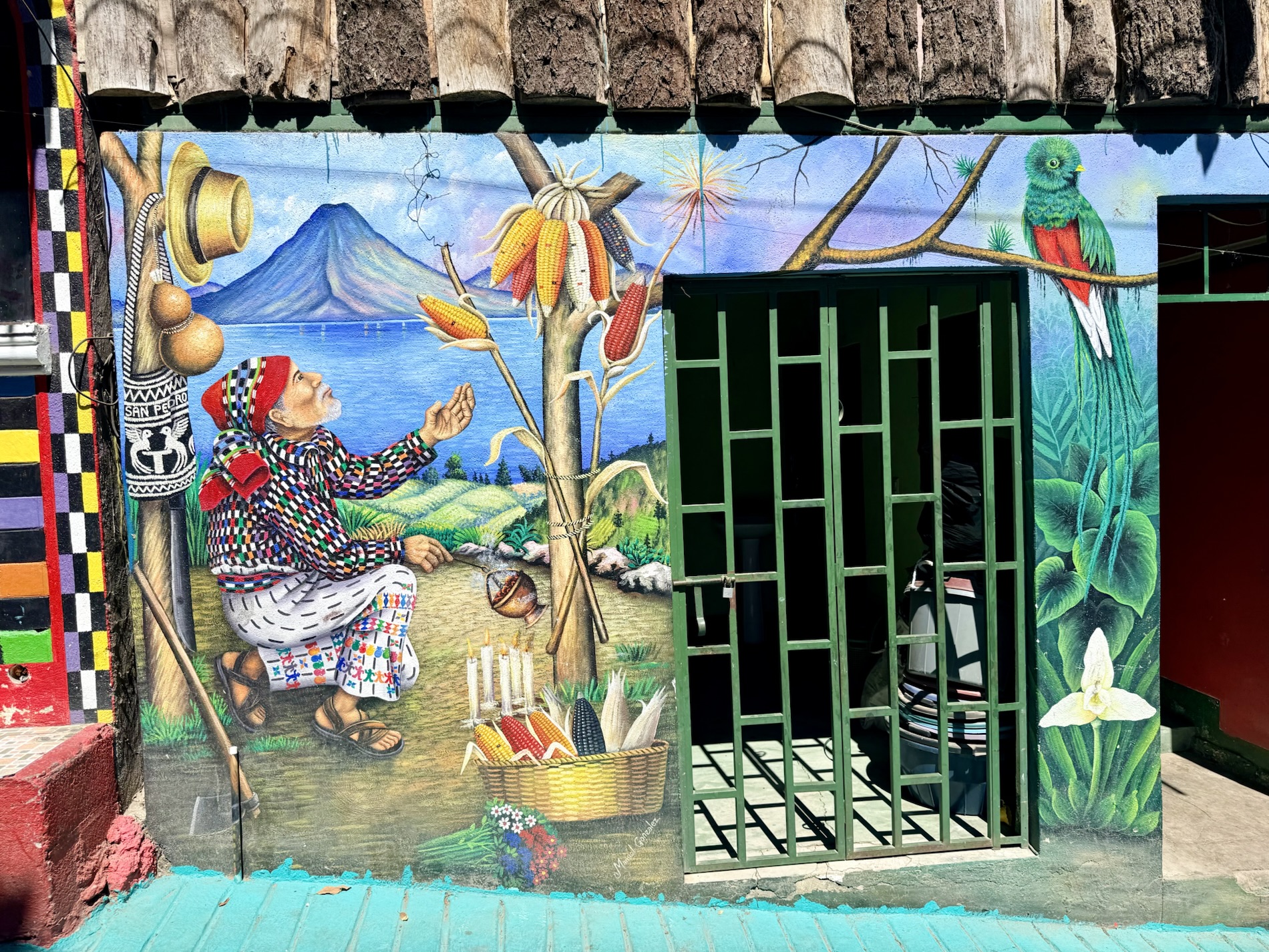 We ate lunch at Deleite Ancestral Experiencia Gastronomica Tz’utujil, which offered traditional Tz’utujil food. The town is awash with beautiful murals that symbolize Mayan tradition. For us, this was the most gorgeous of all the towns. Pavement is painted and two streets are covered in umbrellas and hats: Calle de las Sombrillas and Calle de los Sombreros.