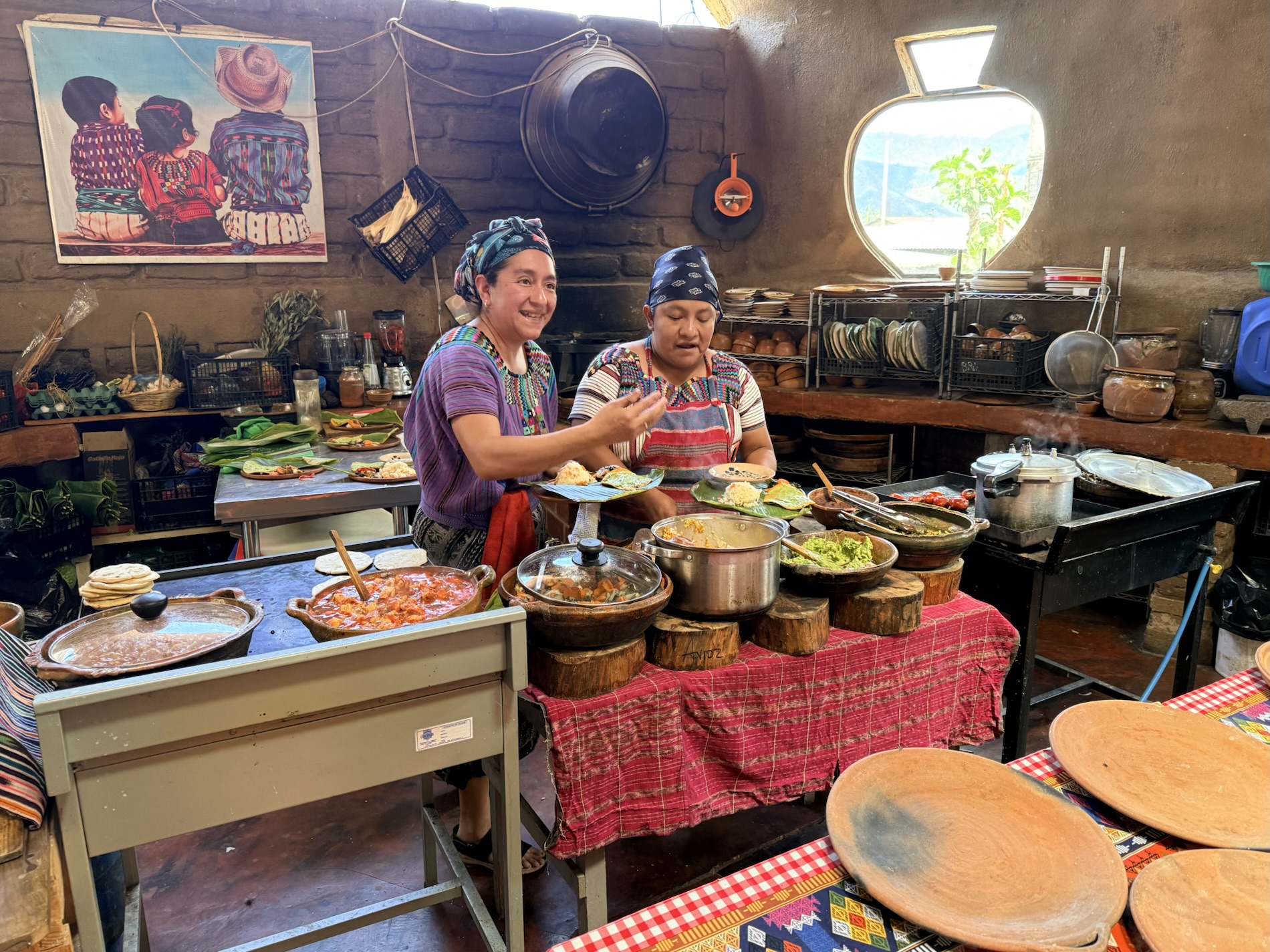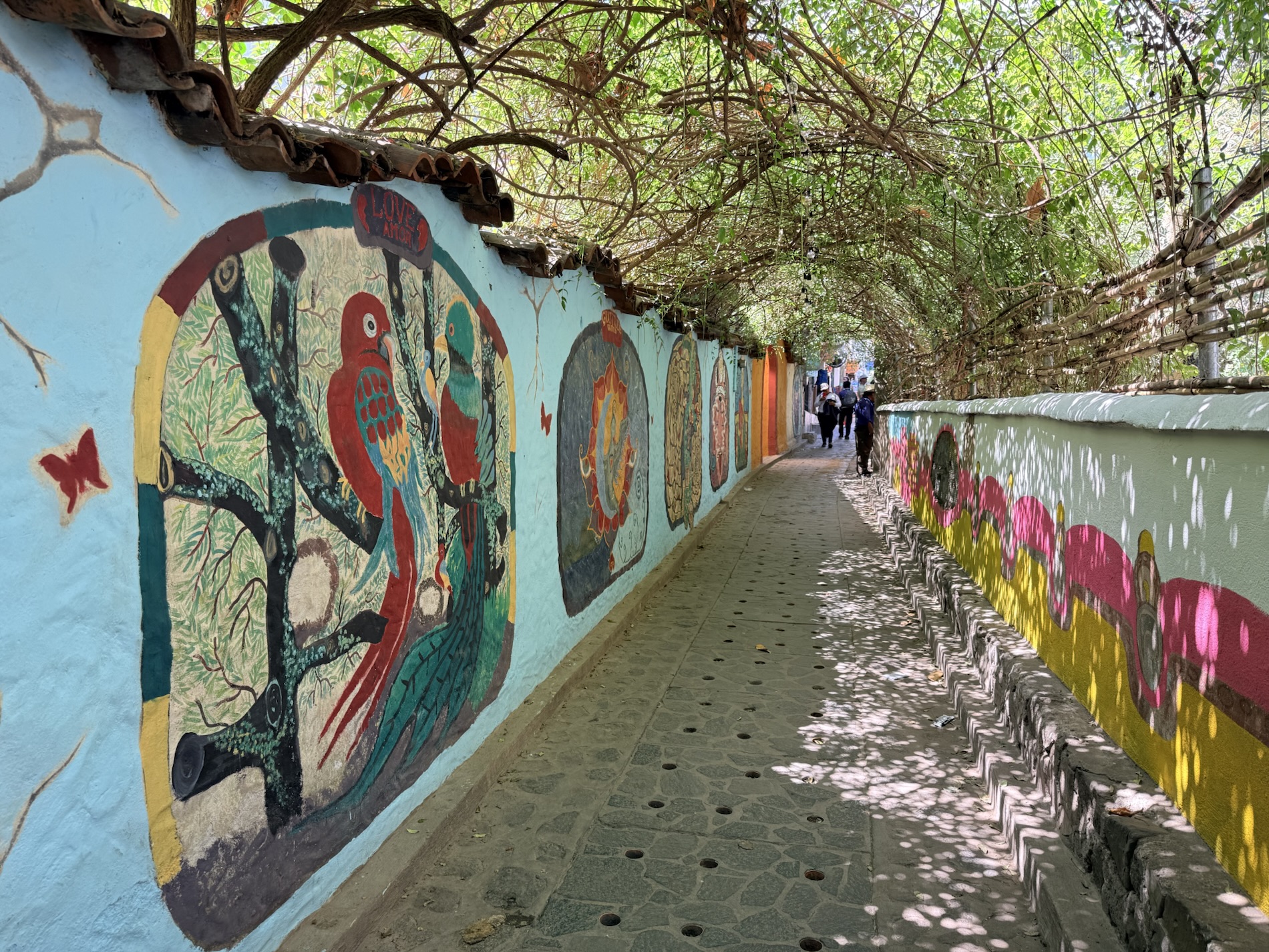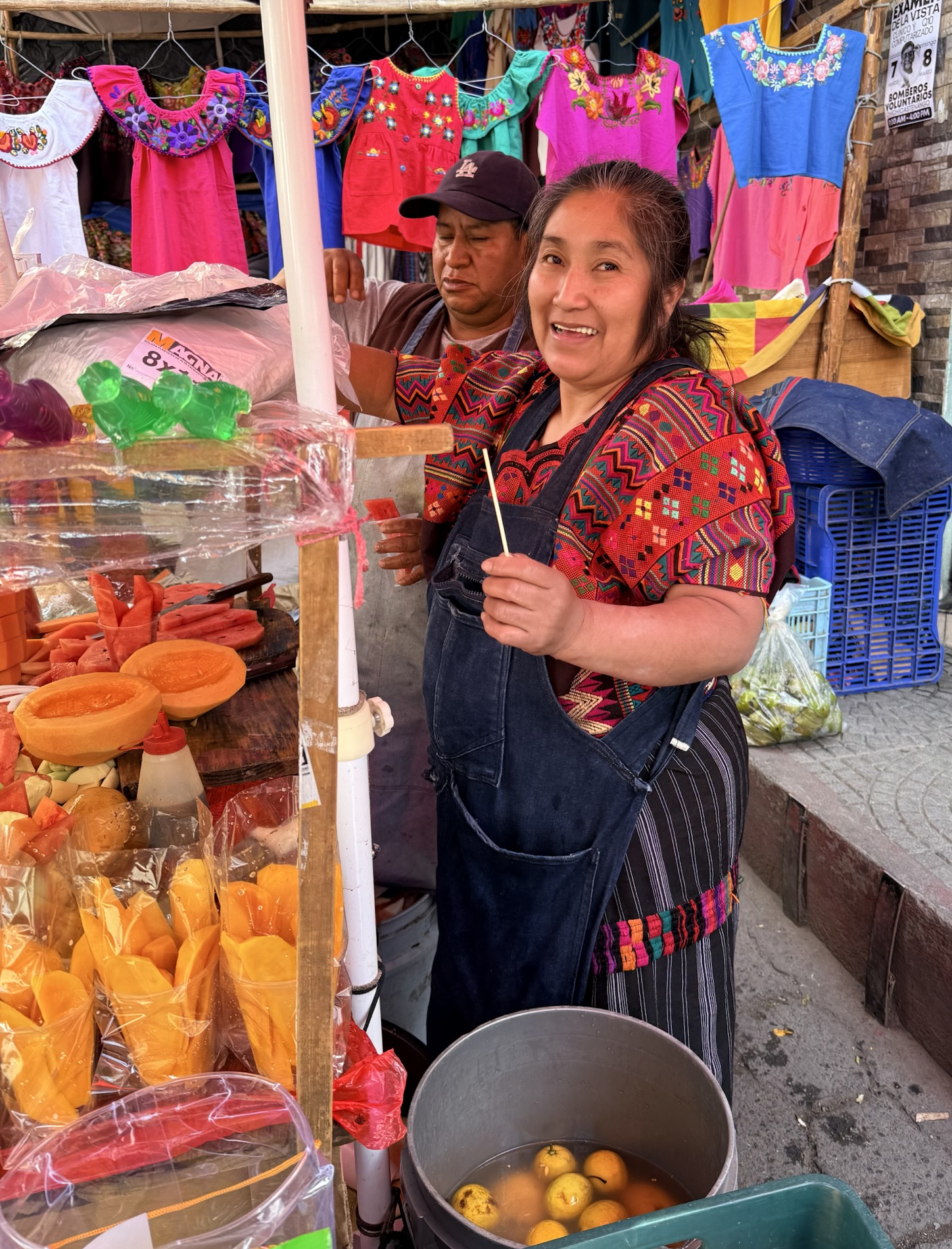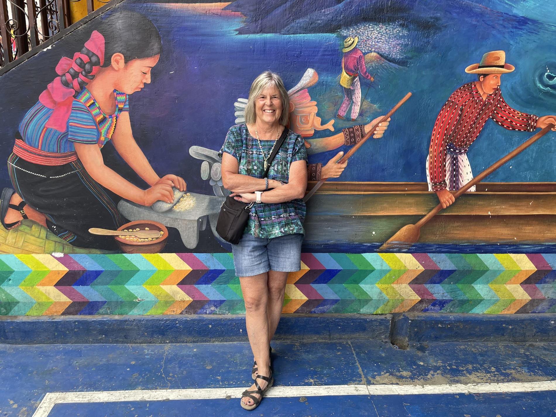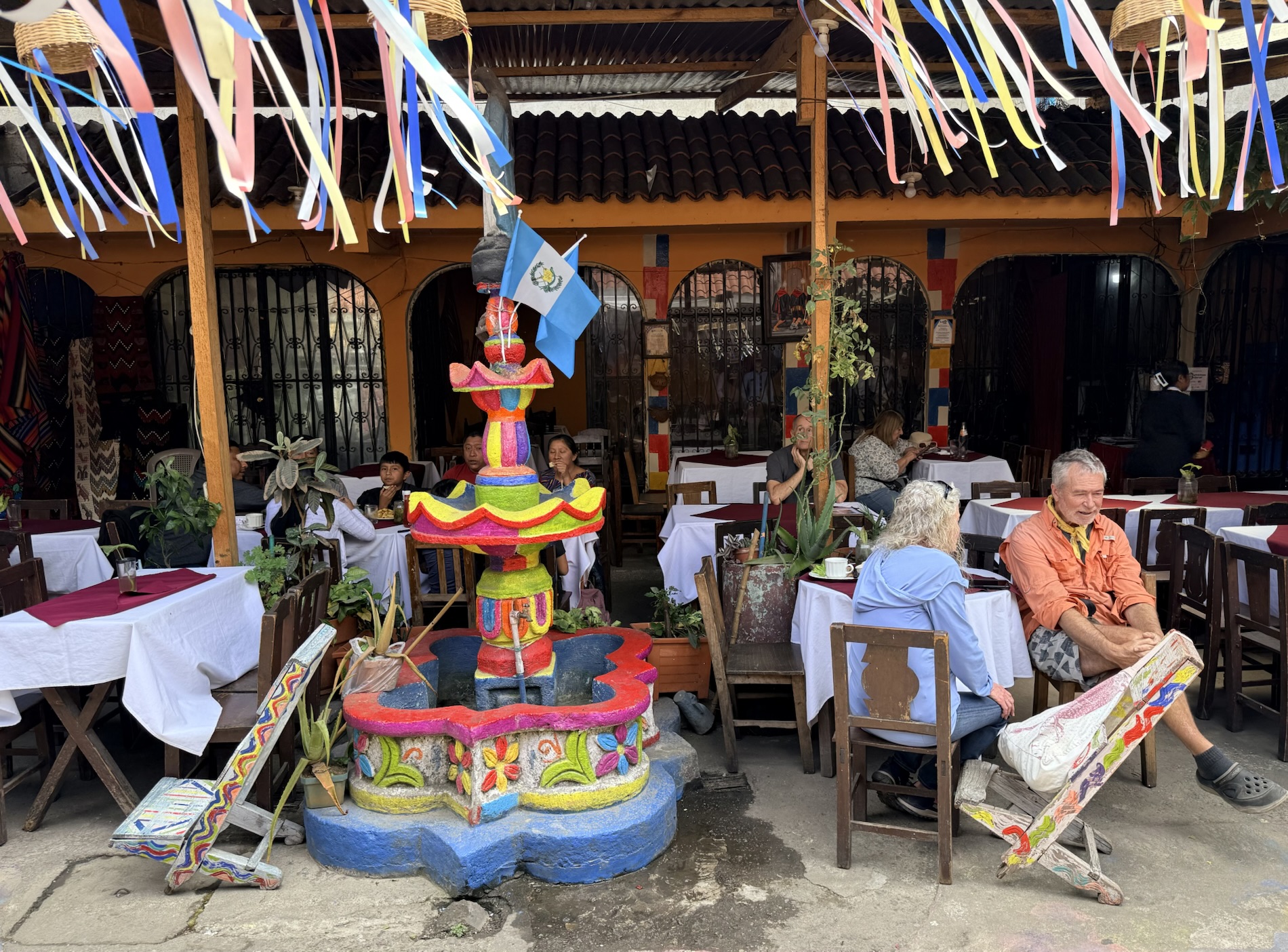 We ate lunch at Deleite Ancestral Experiencia Gastronomica Tz’utujil, which offered traditional Tz’utujil food. The town is awash with beautiful murals that symbolize Mayan tradition. For us, this was the most gorgeous of all the towns. Pavement is painted and two streets are covered in umbrellas and hats: Calle de las Sombrillas and Calle de los Sombreros.