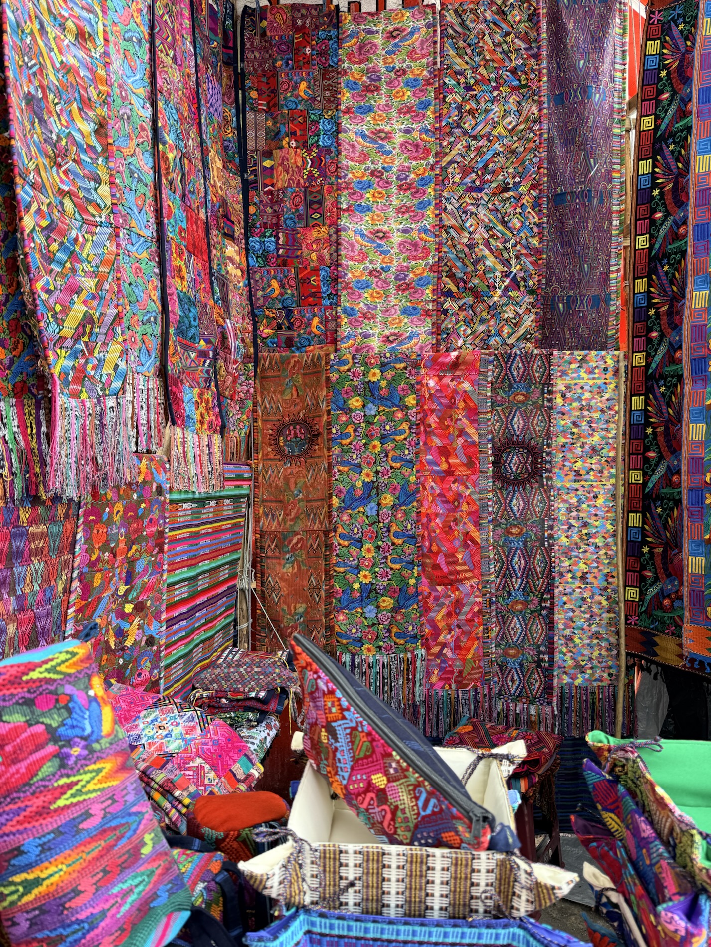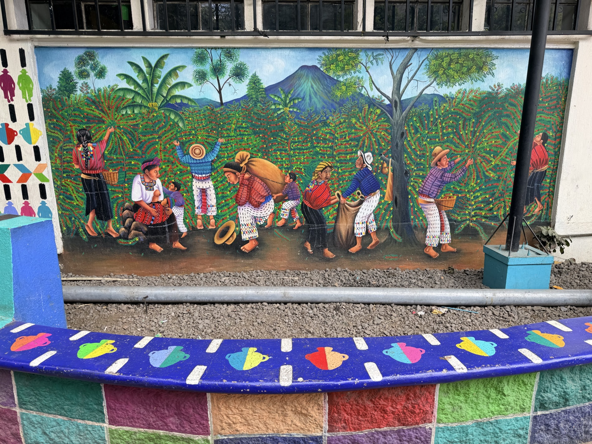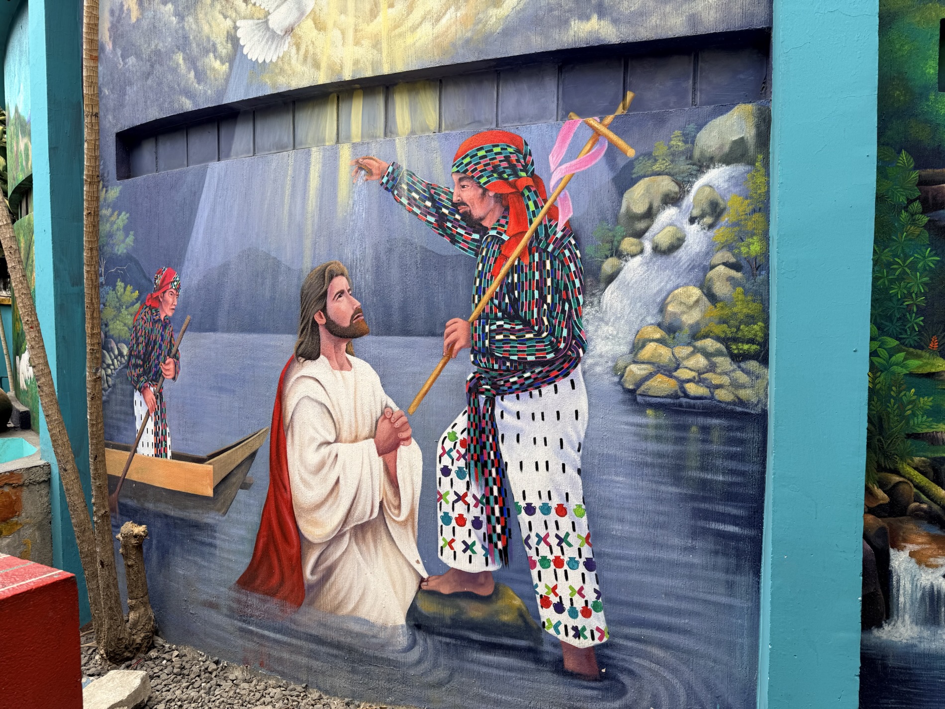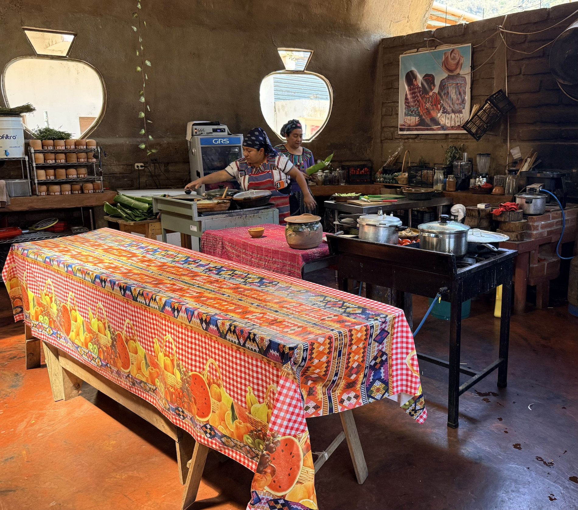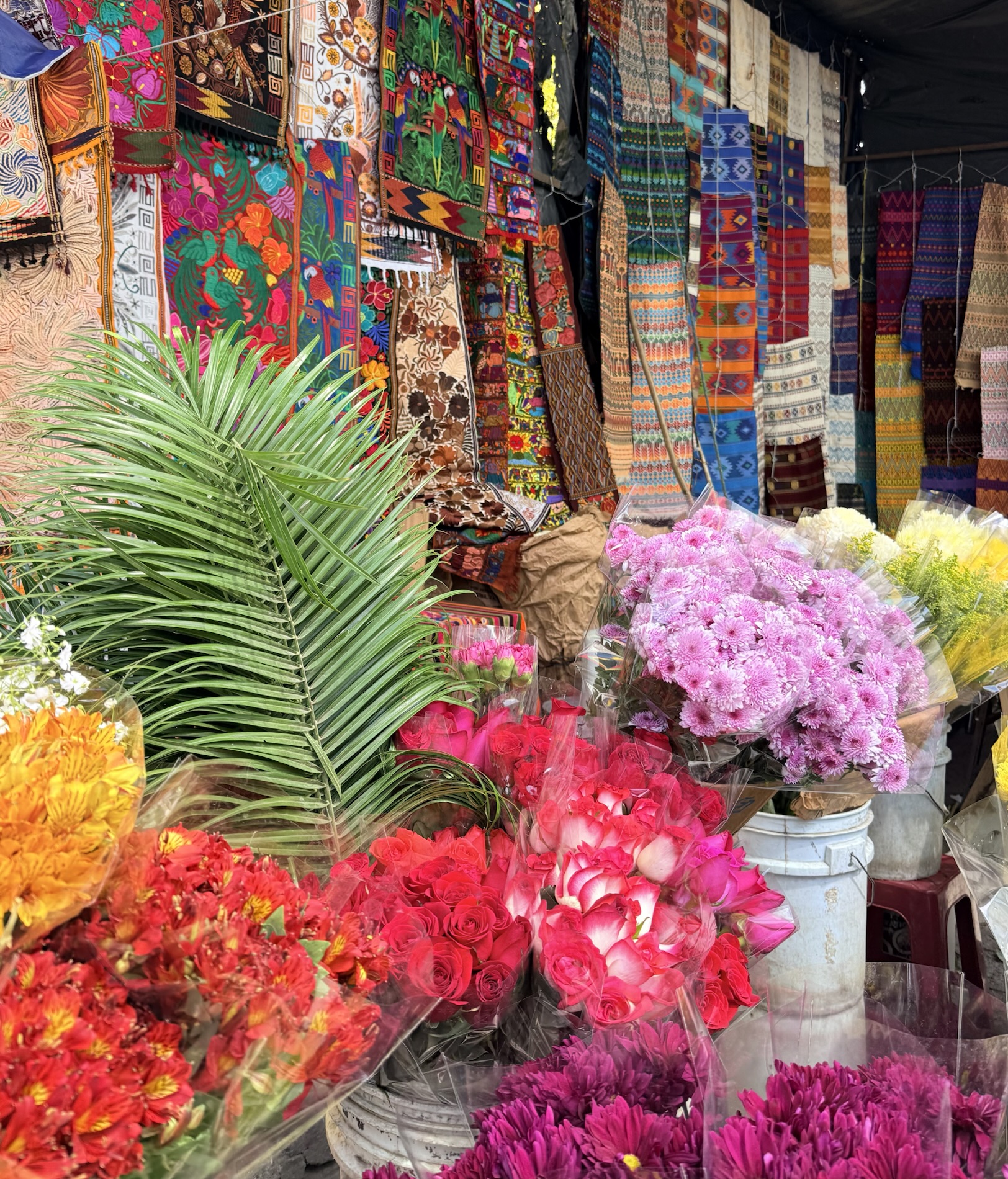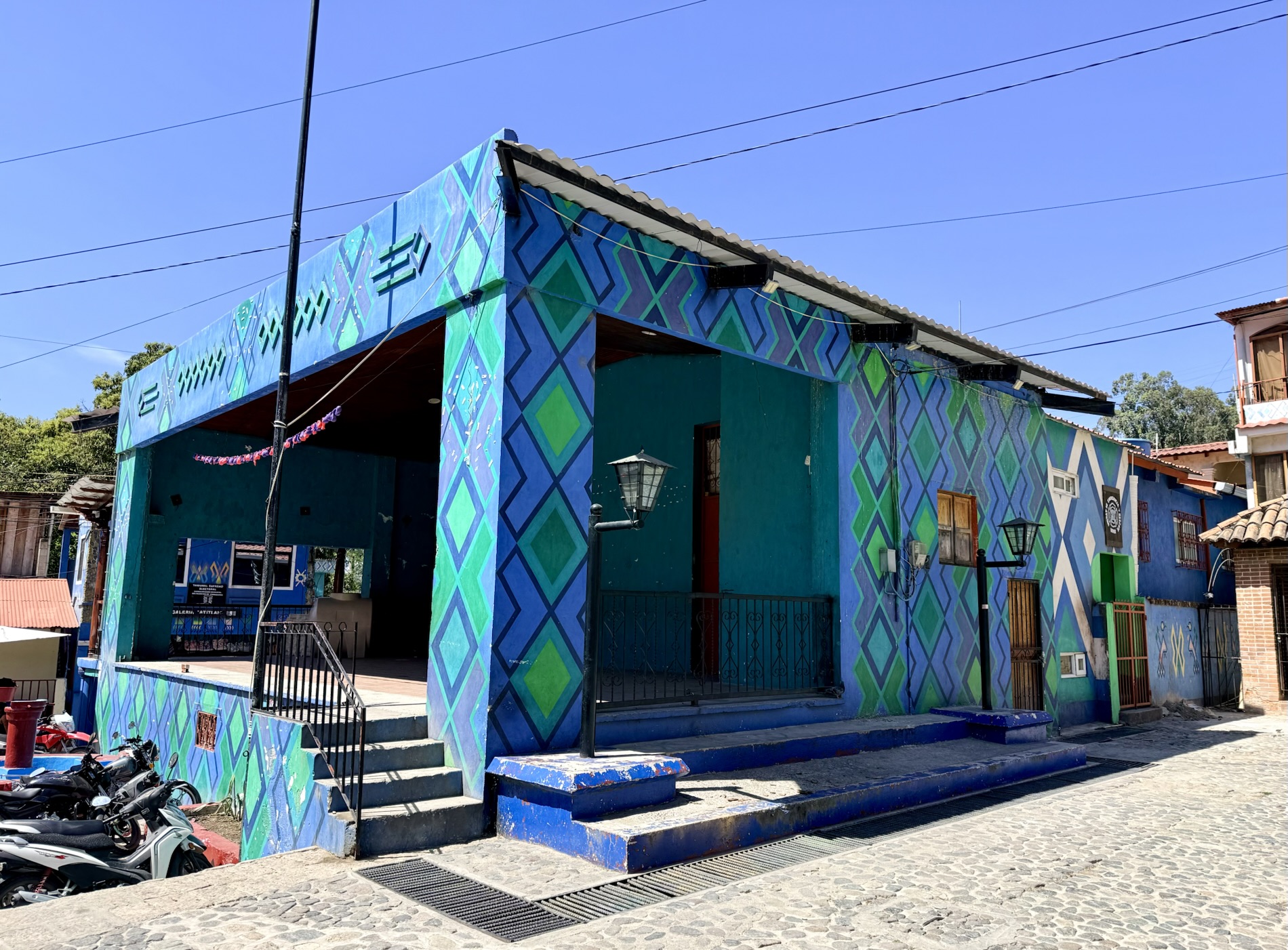 We ate lunch at Deleite Ancestral Experiencia Gastronomica Tz’utujil, which offered traditional Tz’utujil food. The town is awash with beautiful murals that symbolize Mayan tradition. For us, this was the most gorgeous of all the towns. Pavement is painted and two streets are covered in umbrellas and hats: Calle de las Sombrillas and Calle de los Sombreros.