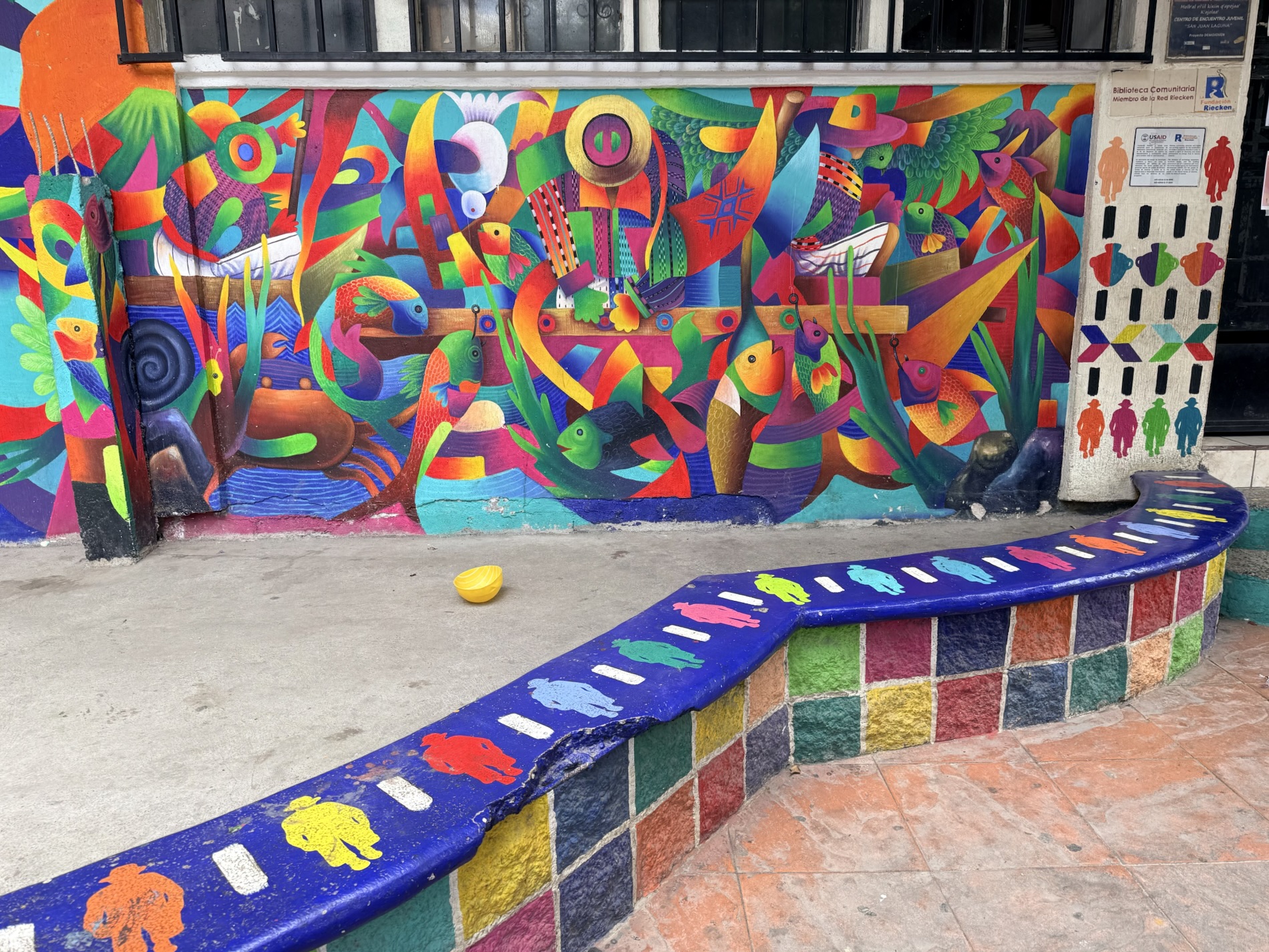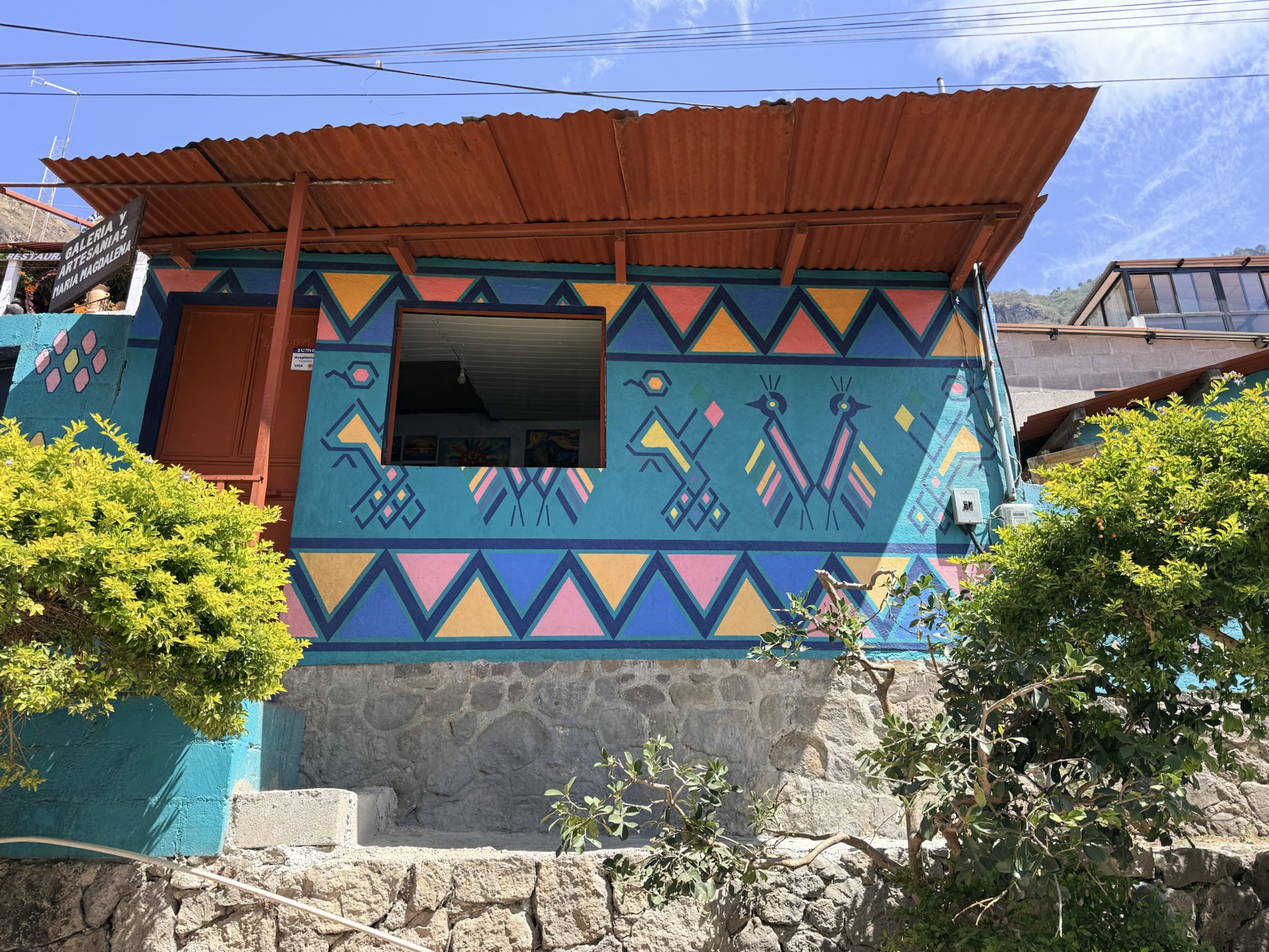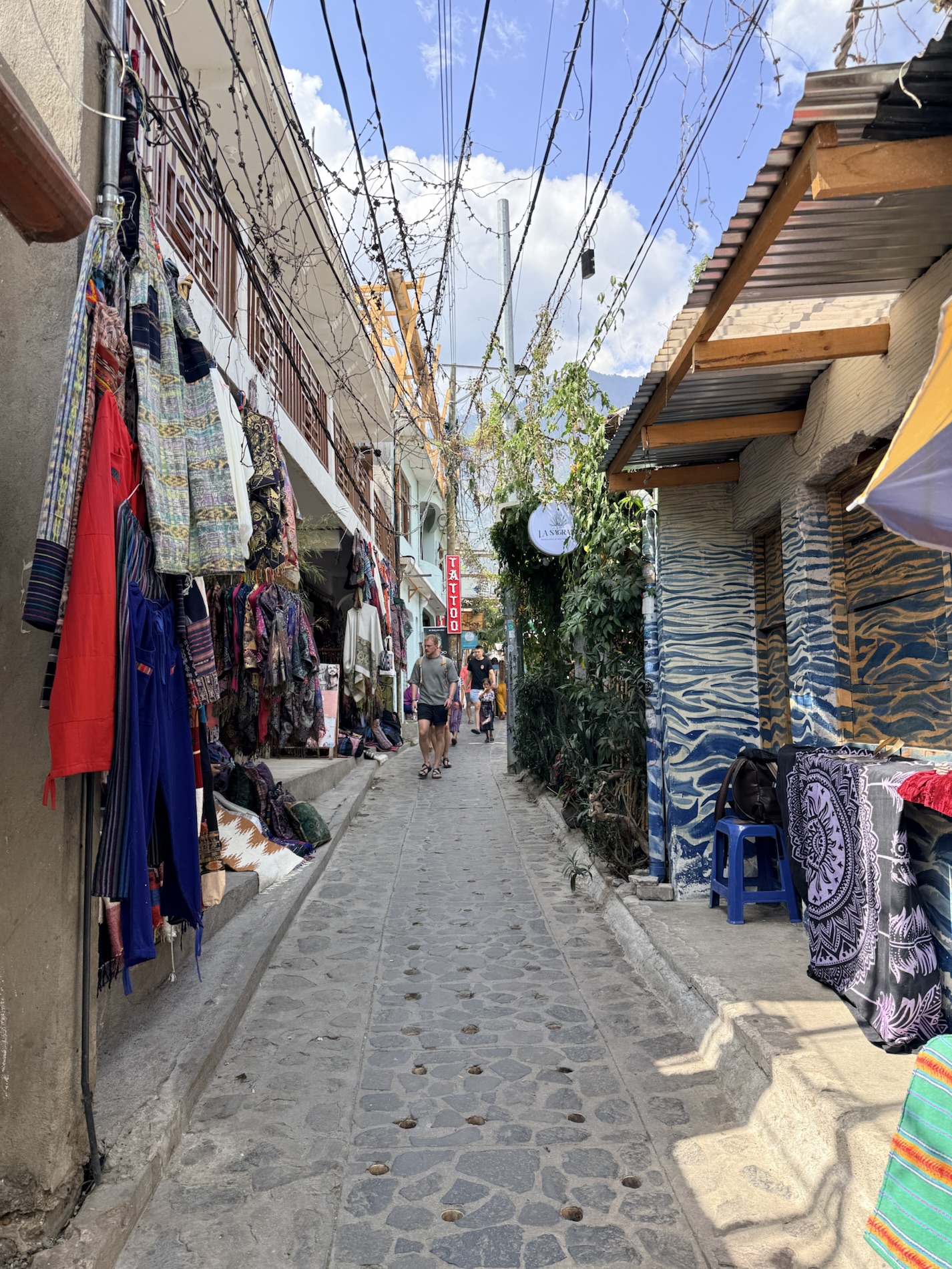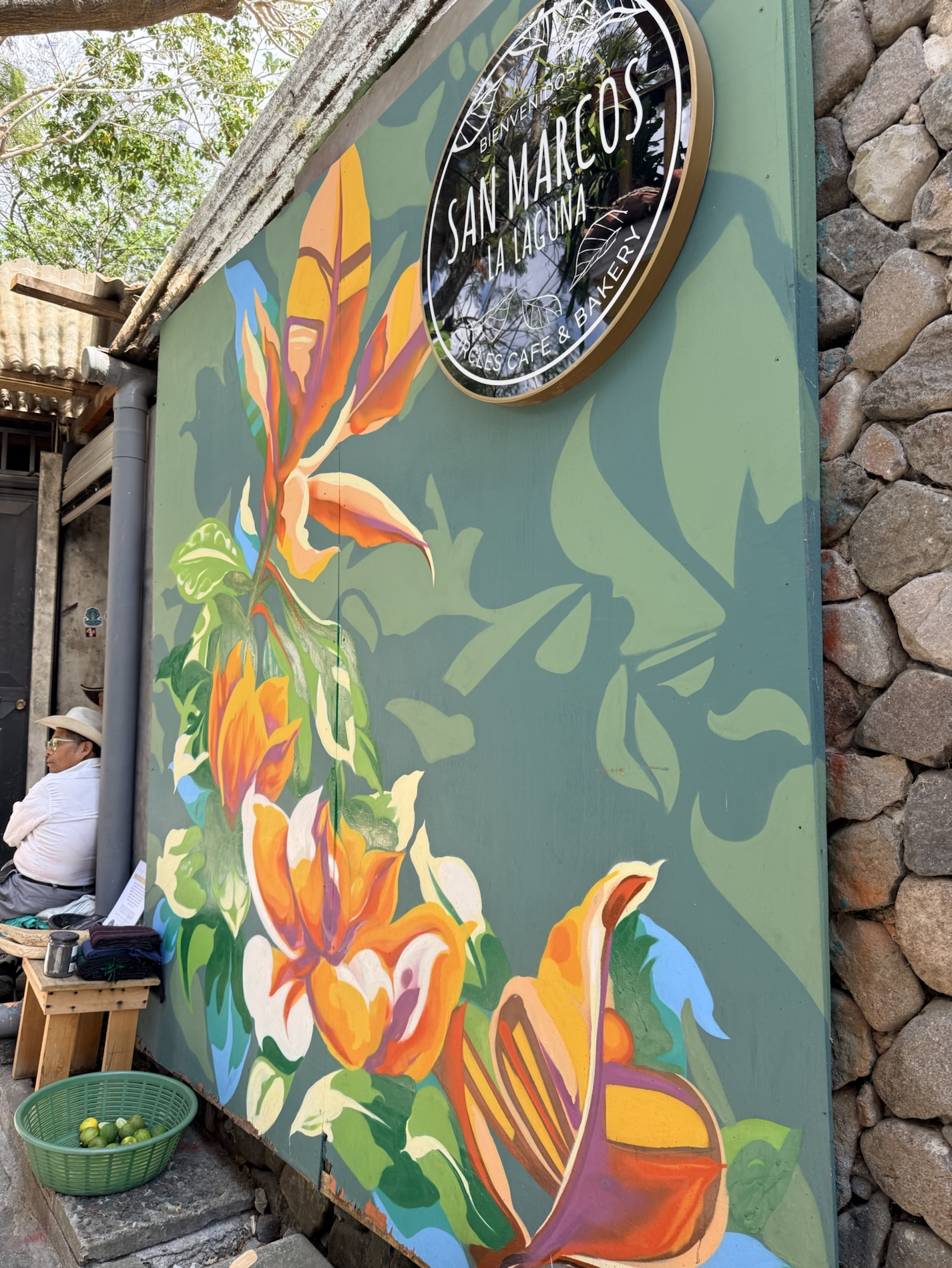 San Marcos la Laguna is NOT known for Mayan culture, but instead draws New Age and hippie types. It has murals, bohemian clothing shops, cafes and hostels. Offers for spiritual nurturing include yoga, mediation, tattoos, sound bathing, cacao ceremonies, reiki, chakra alignment, massage, and full moon dances.