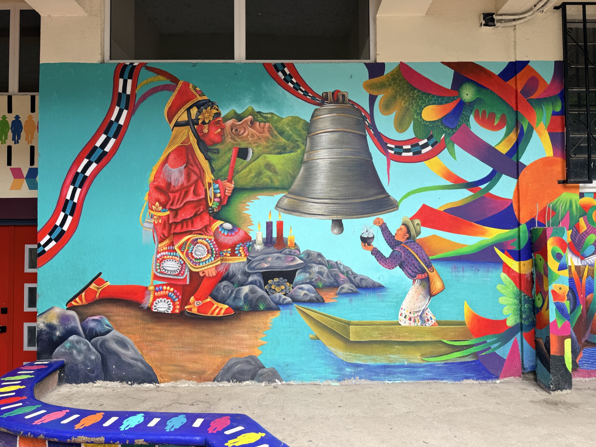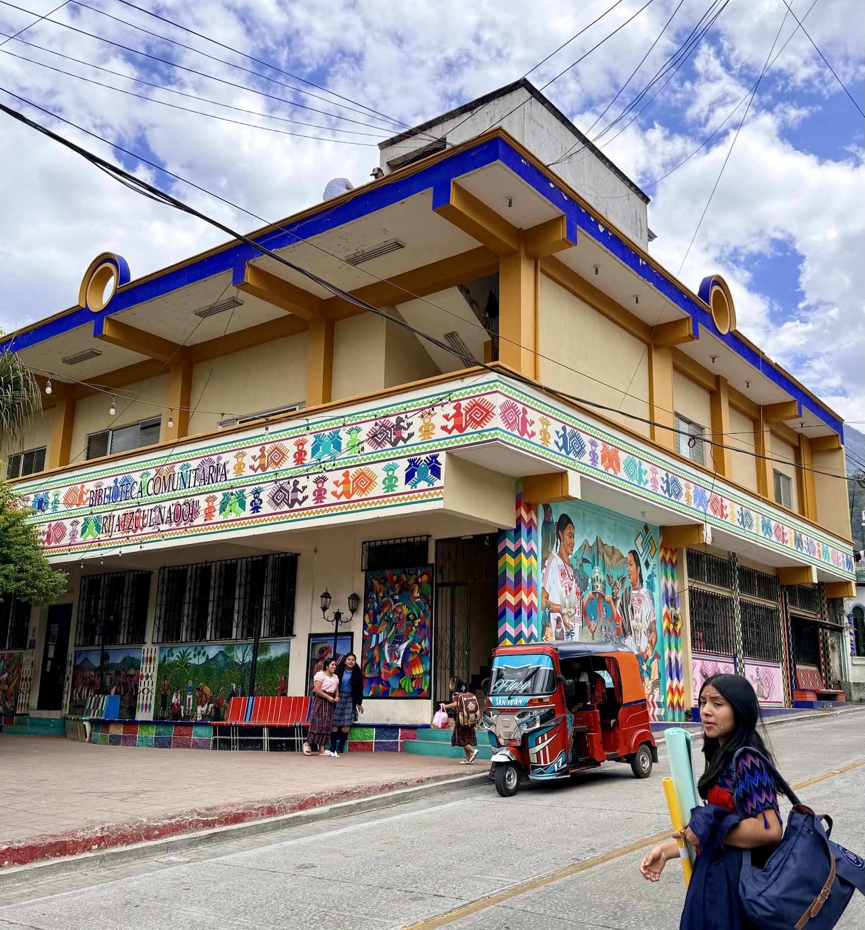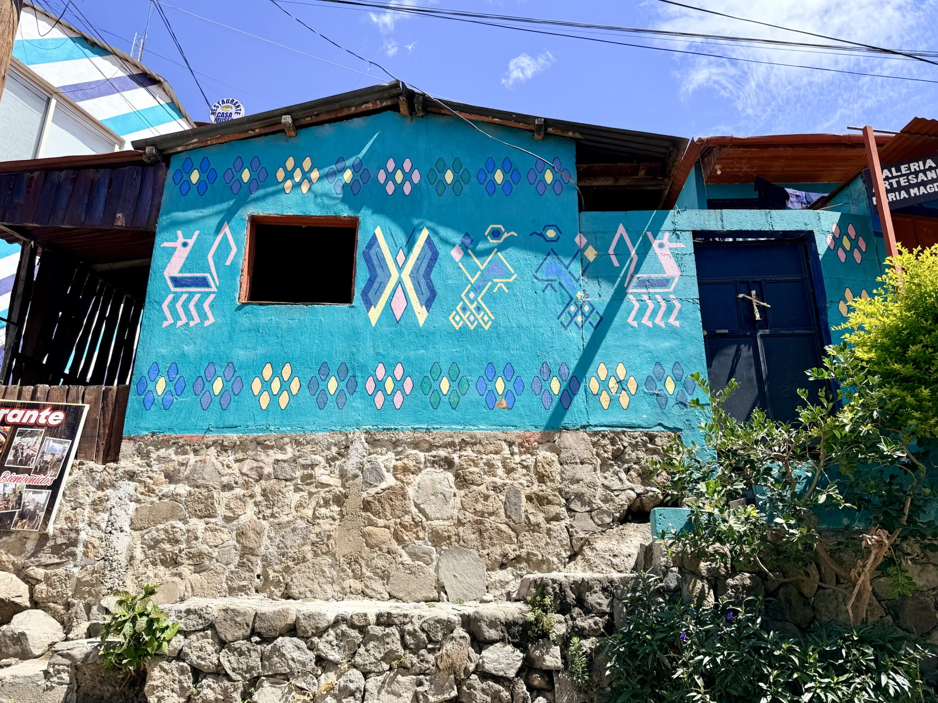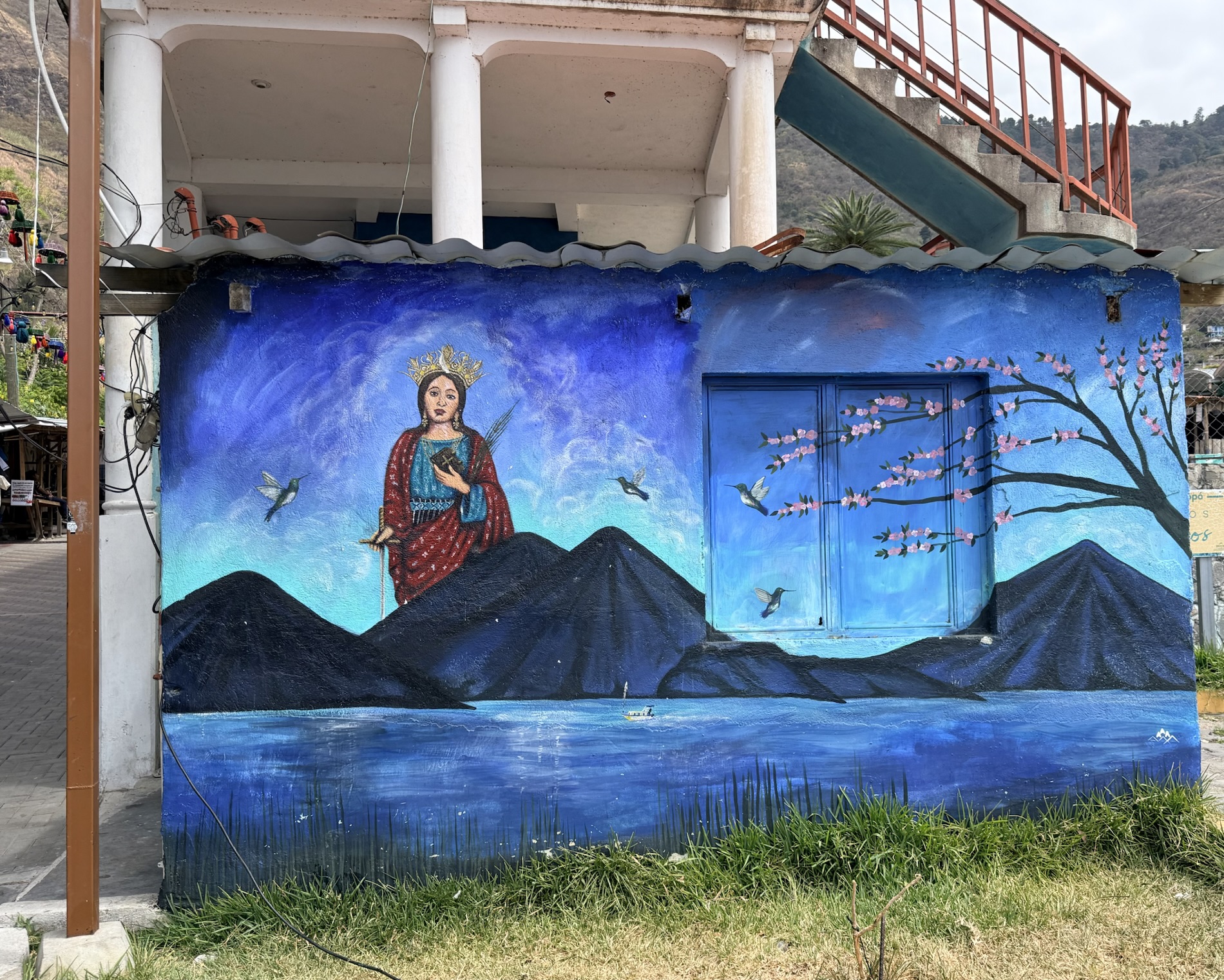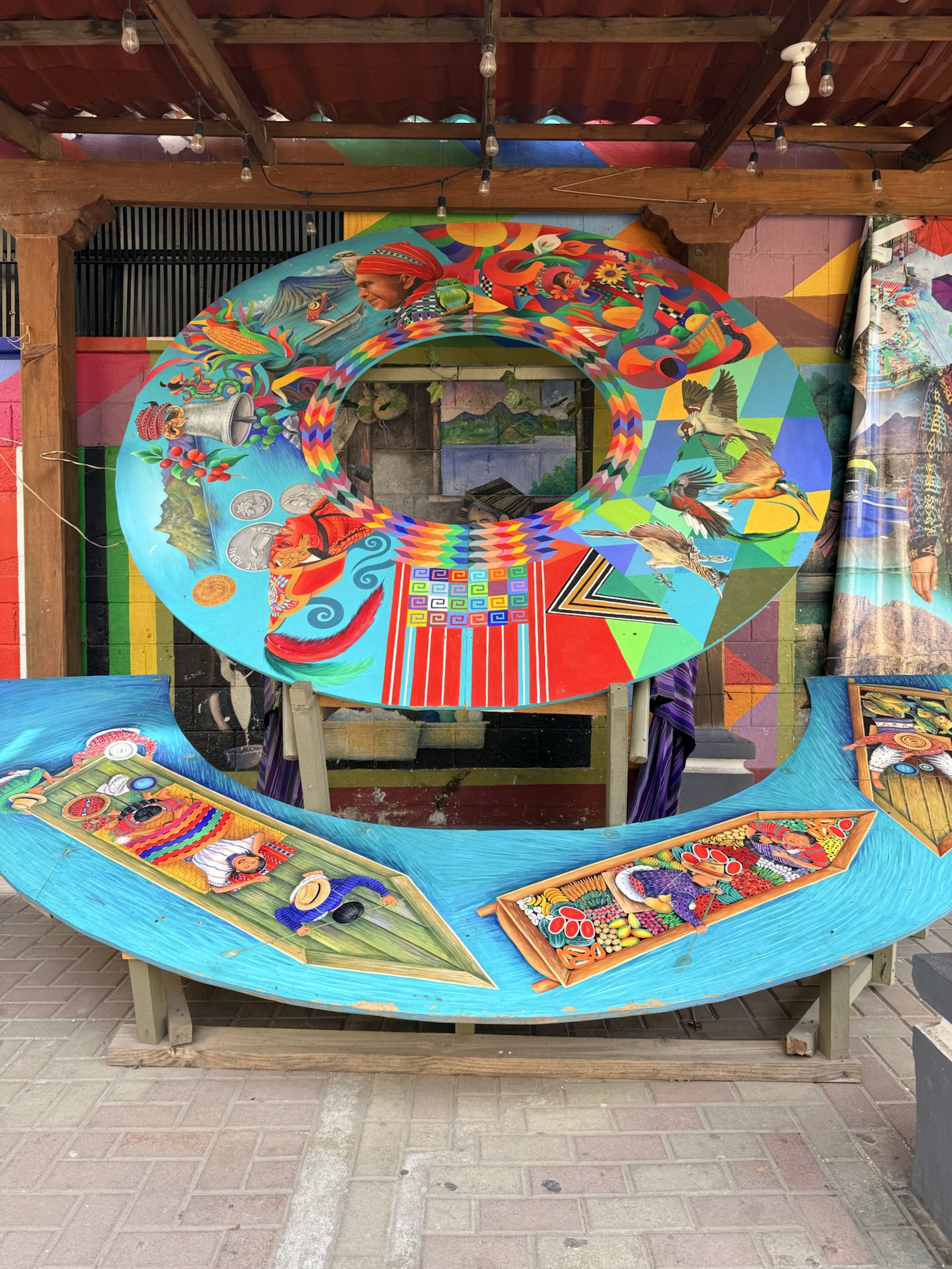 San Marcos la Laguna is NOT known for Mayan culture, but instead draws New Age and hippie types. It has murals, bohemian clothing shops, cafes and hostels. Offers for spiritual nurturing include yoga, mediation, tattoos, sound bathing, cacao ceremonies, reiki, chakra alignment, massage, and full moon dances.