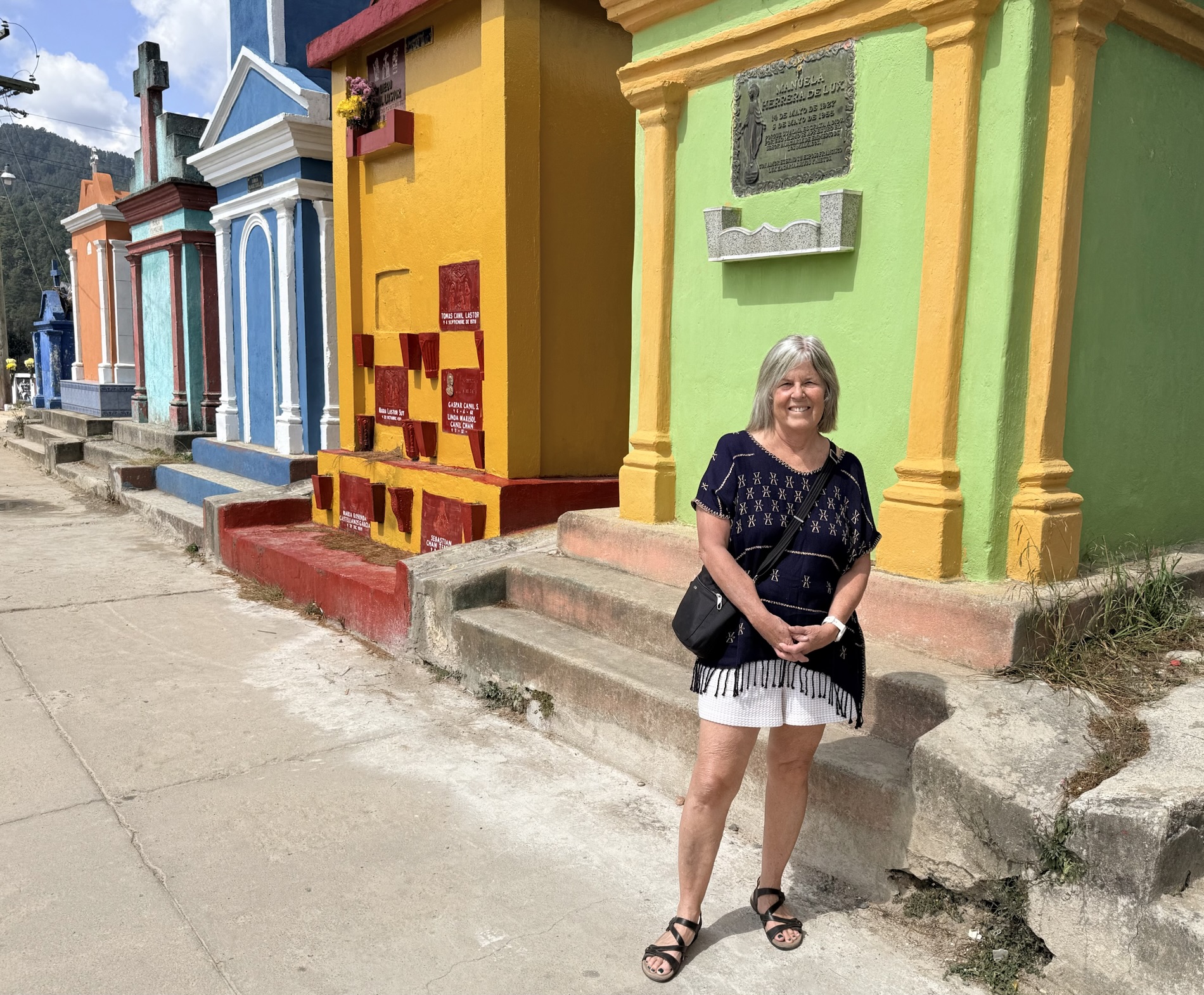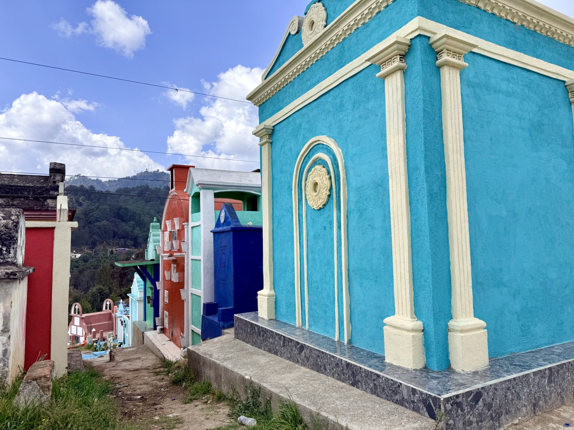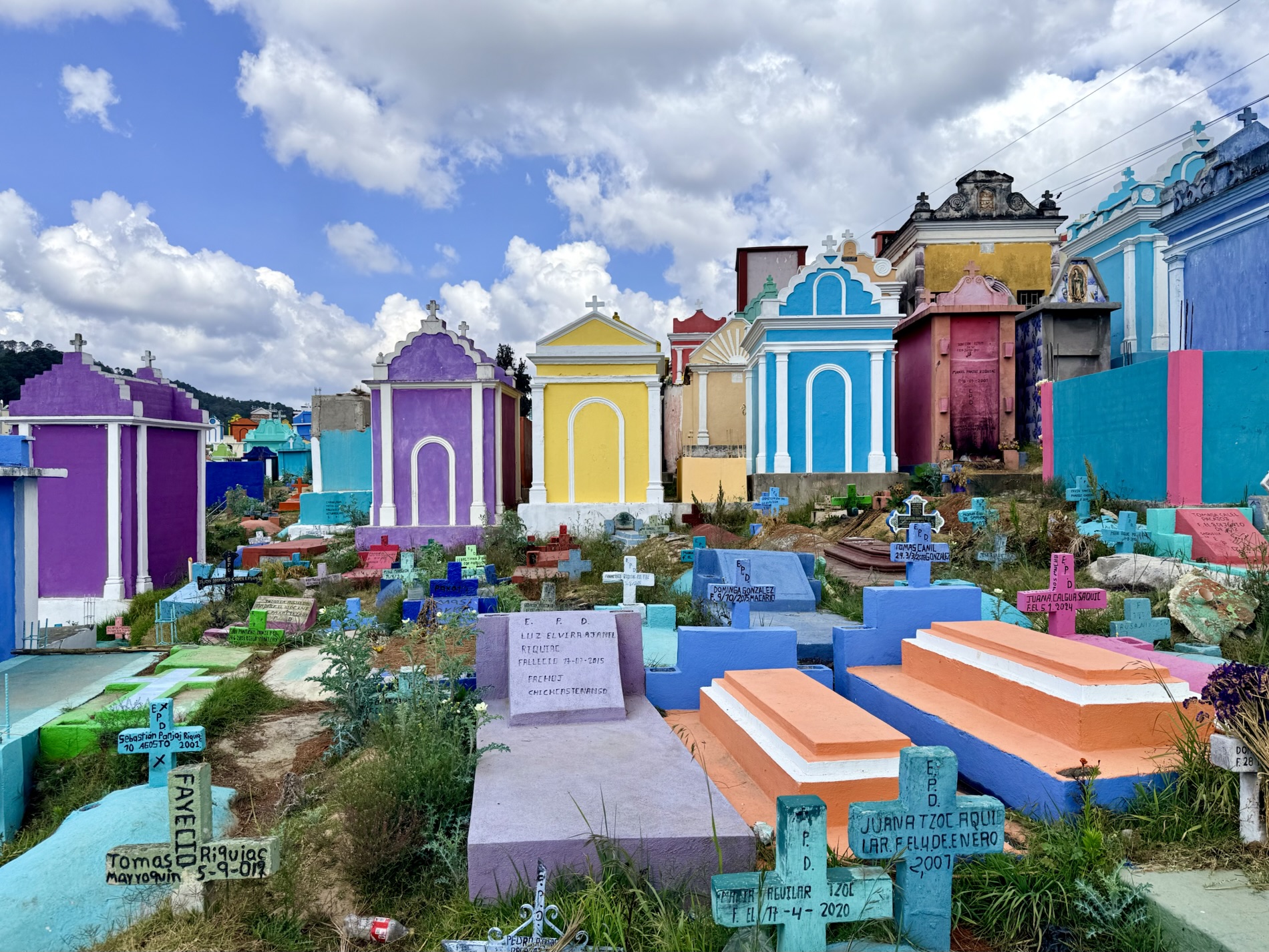 The Chichicastenango Cemetery is a cemetery overlooking the town. The rainbow-colored above-ground mausoleums and tombstones celebrate the afterlife and can symbolize different family roles. White means purity. Mothers’ tombs are often painted turquoise for protection. Grandfathers’ tombs are often painted in yellow symbolizing the sun’s life force. Other graves are painted in lime green, lavender, red, or the favorite color of the deceased.