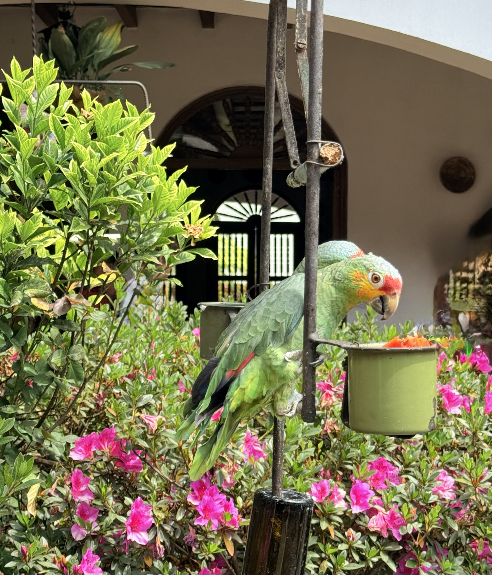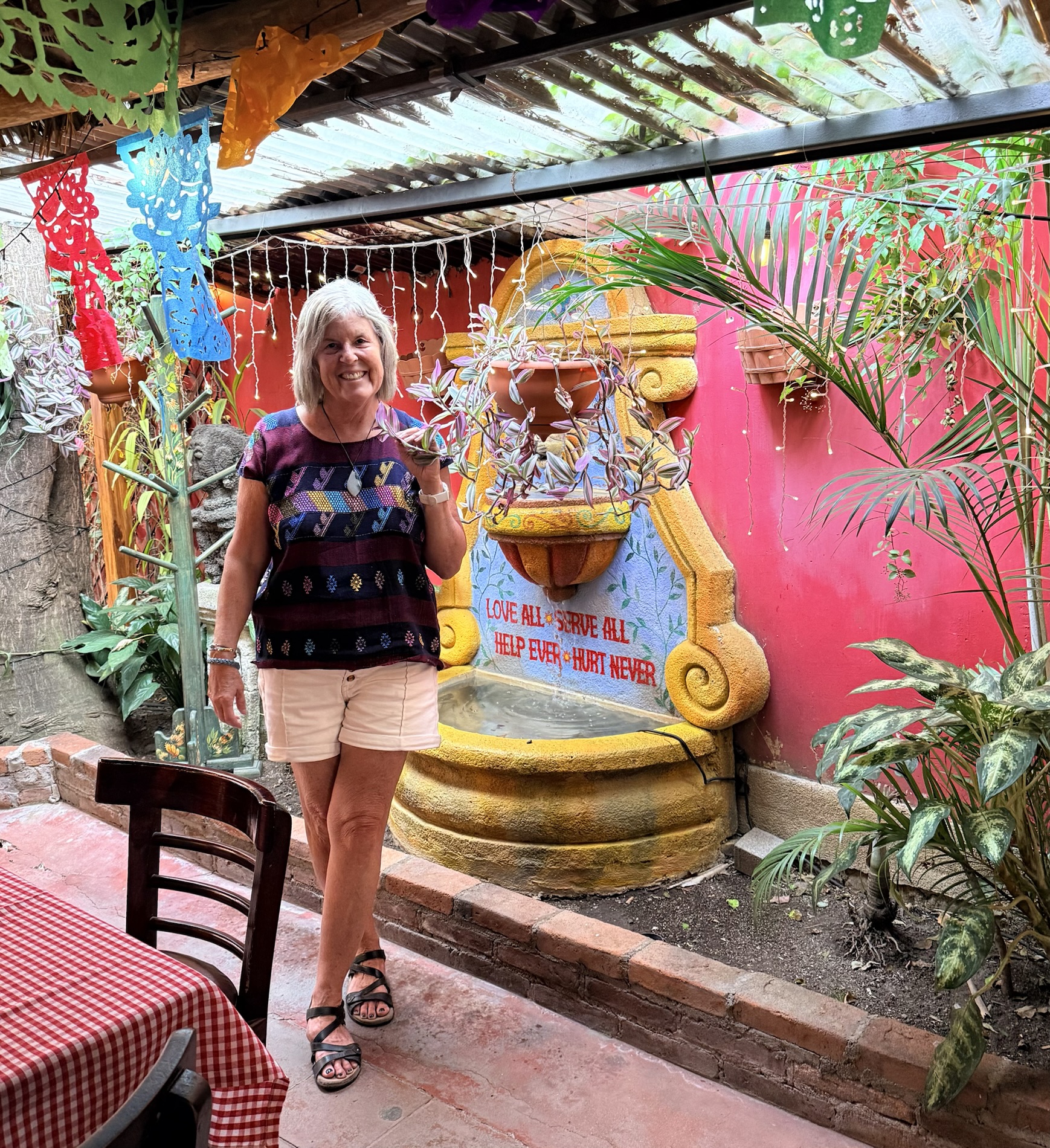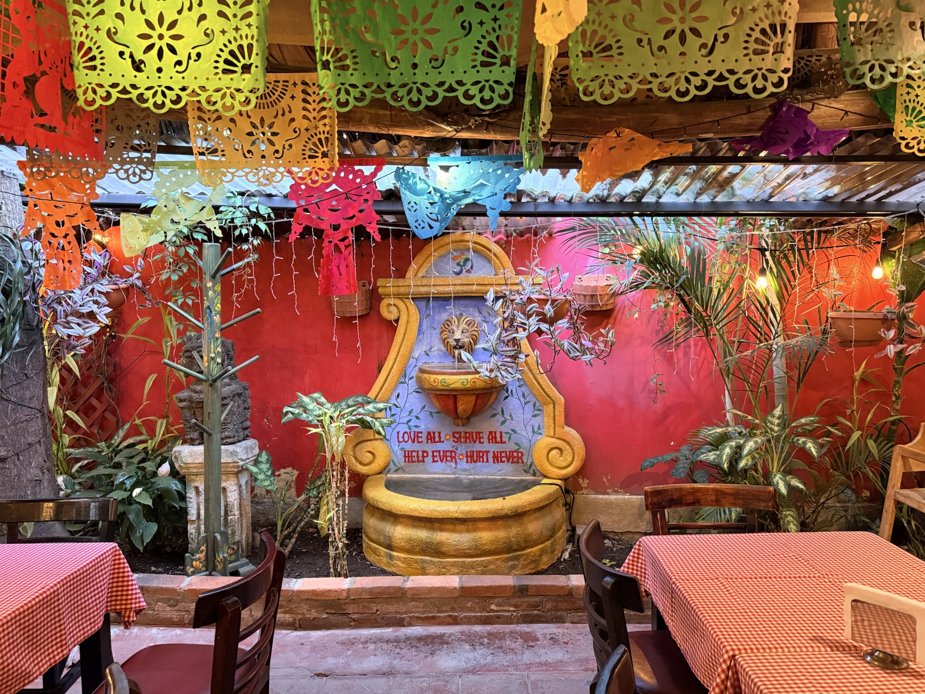 Nearby a fountain advises: “Love all. Serve all. Help ever. Hurt never.”