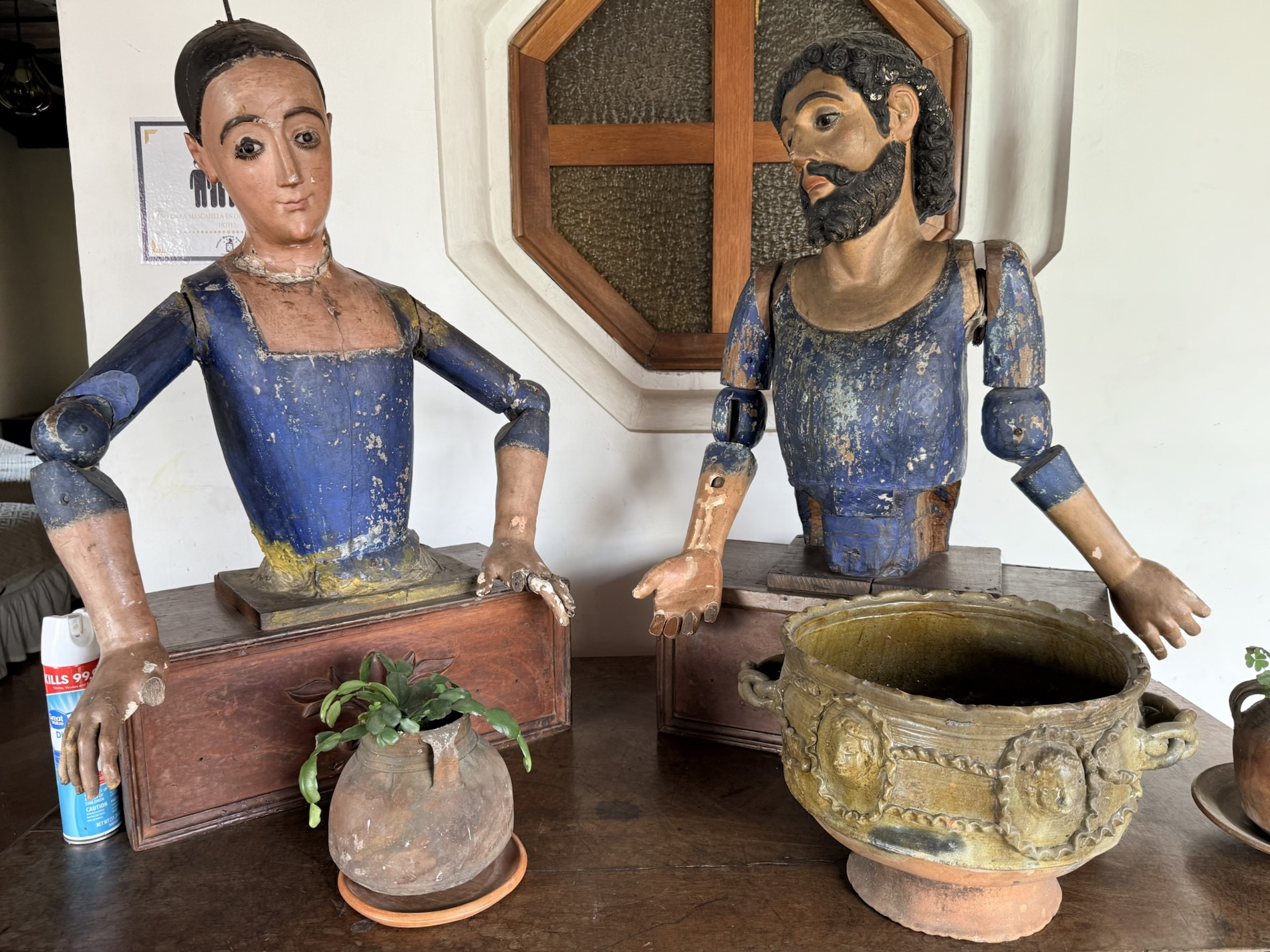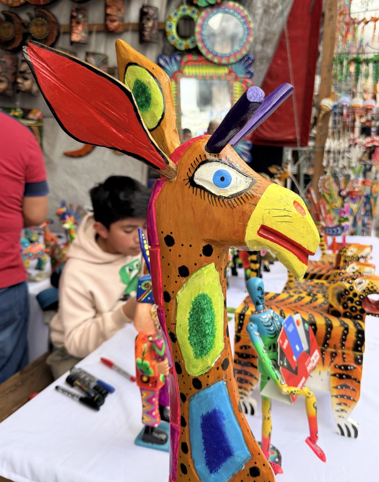 wooden miniatures of the Holy Family, and hummingbirds hovering on handbags