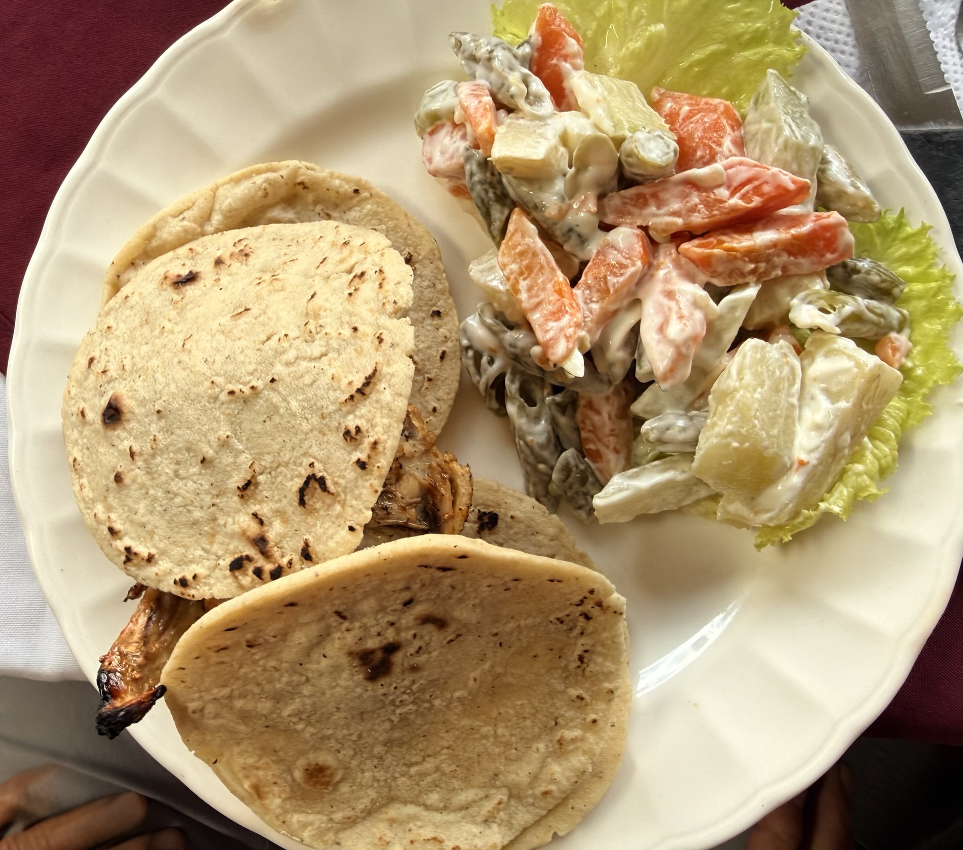 Tz’utujil women serve lunch of traditional food: jicama, chicken and beef stew.