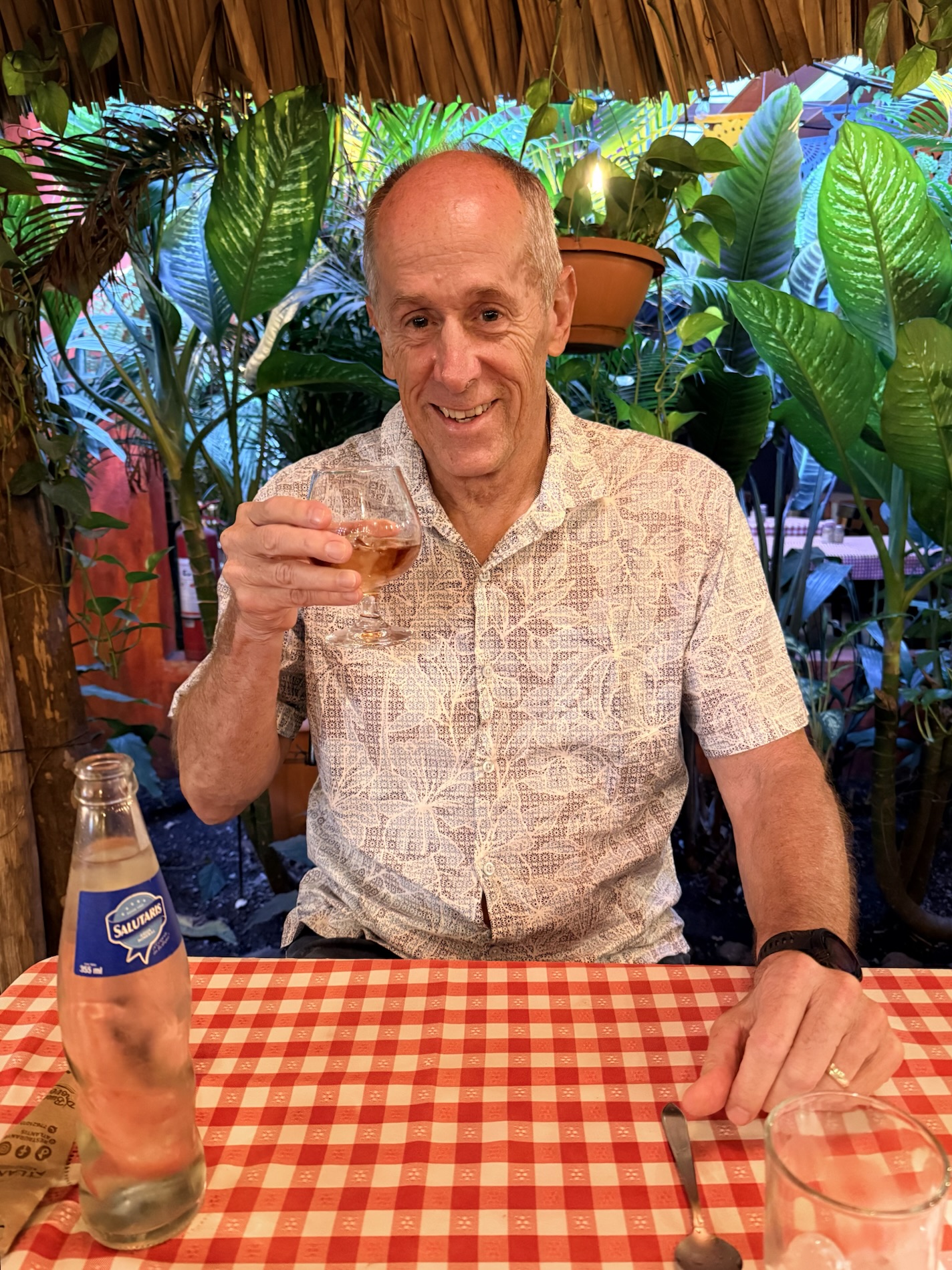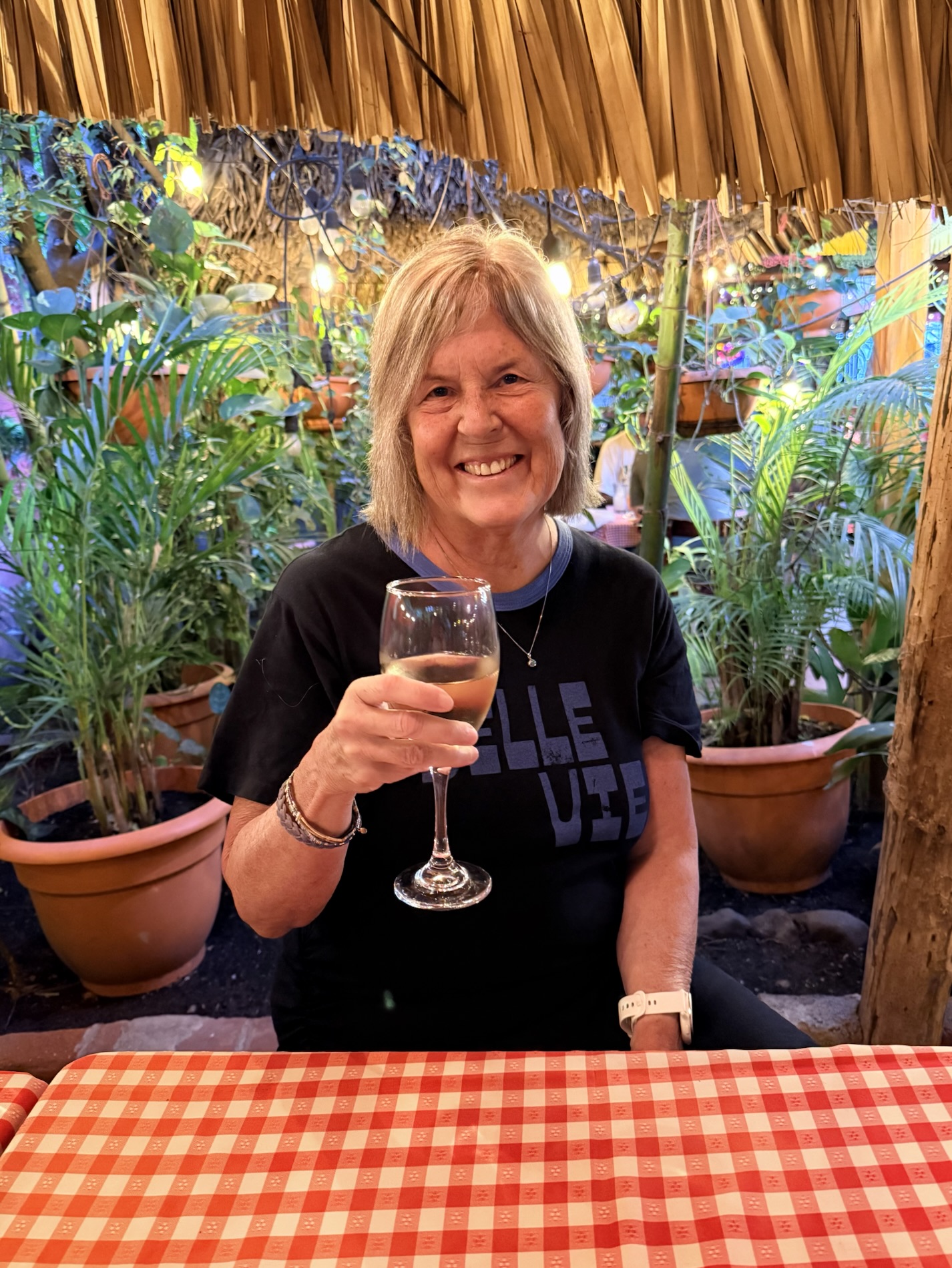 When she returns from Chichi, she sips wine under a rainbow