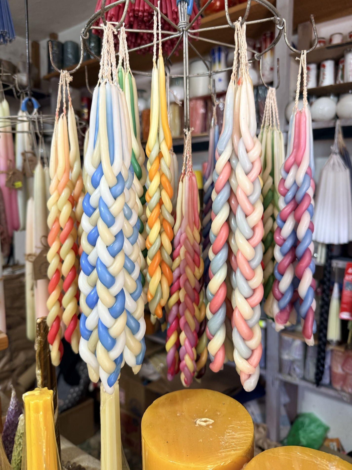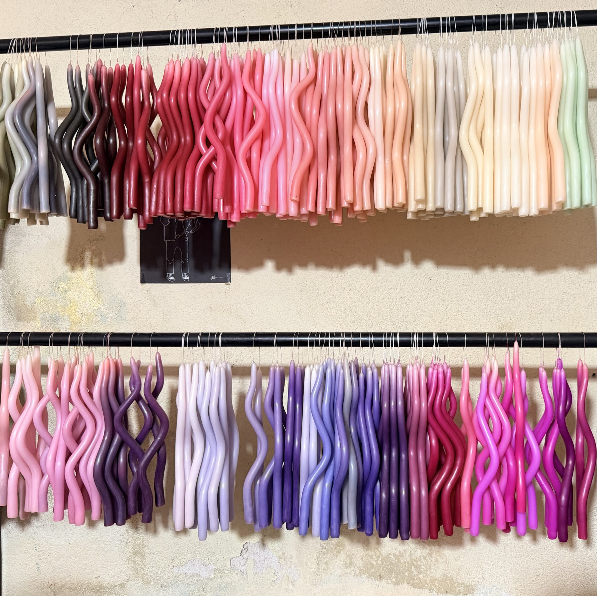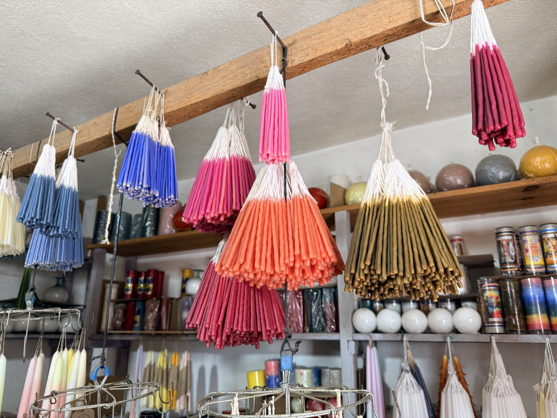 of twisted and twirled candles hang from rafters in waxen silence.