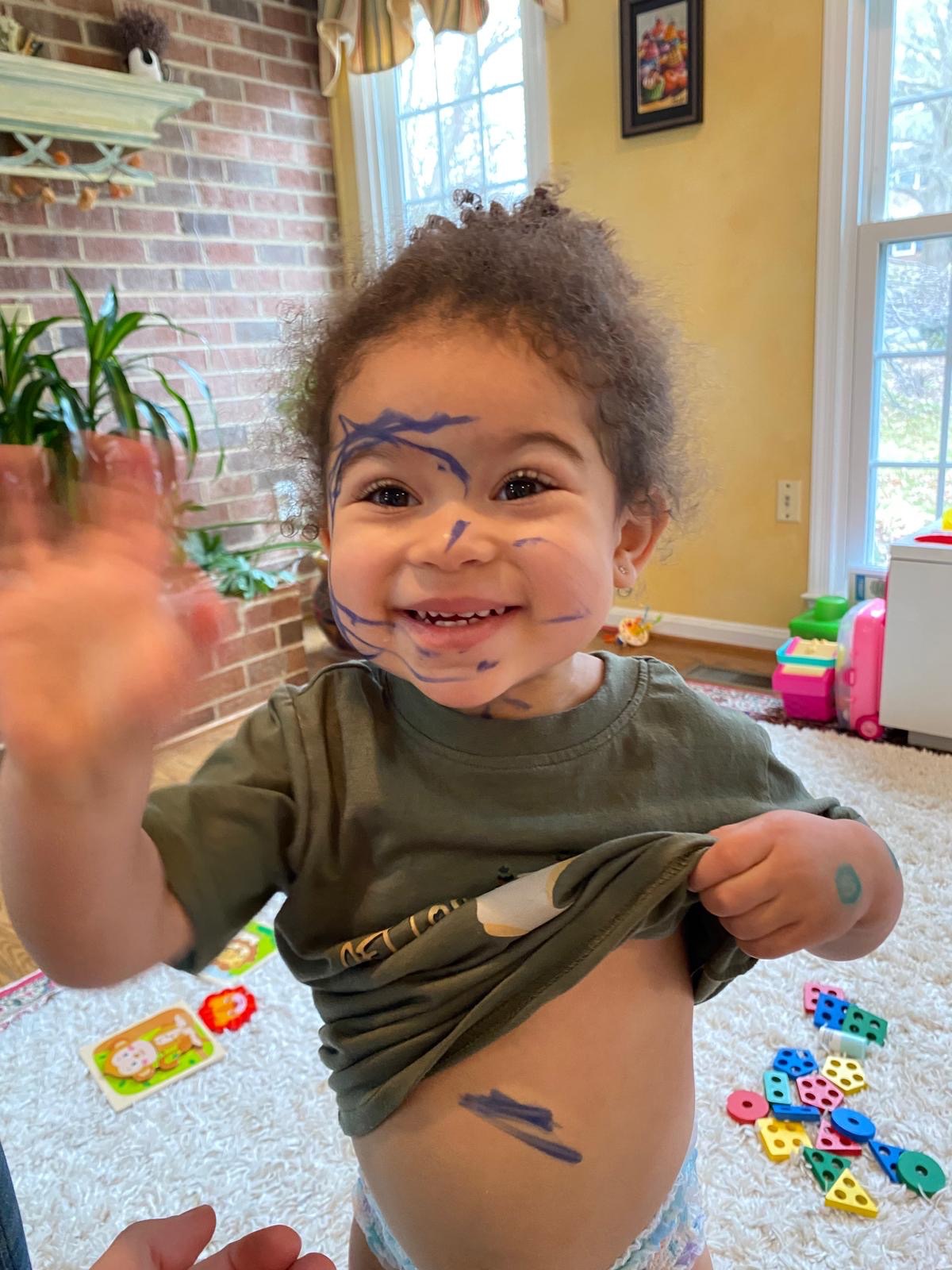 We got pictures of Allie at home and after drawing all over her face with markers. We also got to celebrate Alex’s 35th birthday vicariously as the family went out to a Mexican restaurant. We also got to see photos of Allie at her day care.