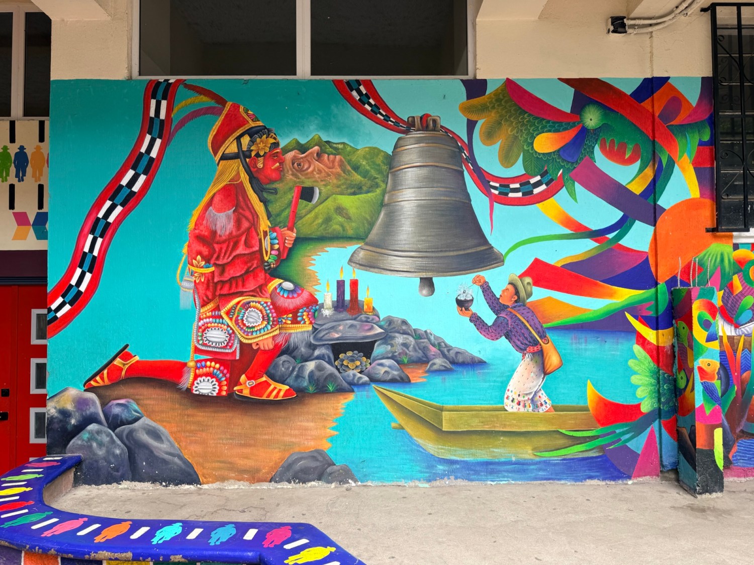 Around Lago de Atitlán, we went from our Airbnb base in Panajachel to the Sunday market and the colorful town cemetery in Chichicastenango, where colorful tombstones and mausoleums encourage Guatemalans to accept the inevitability of death. We zipped across the lake in lanchas (water taxis) to various towns around the lake: San Pedro la Laguna (the hippie backpacker town), San Juan la Laguna (the Tz’utujil town filled with colorful Mayan-themed murals), and San Marcos la Laguna (the “spiritual nurturing” town). We took a tuk-tuk to Santa Catarina Palopó where houses are painted in blues and greens with Mayan symbols. We ate several times at Lena’s Atlantis Restaurant decorated with colorful Mexican perforated banners called papel picado, representing the fragility of life and the element of wind.
