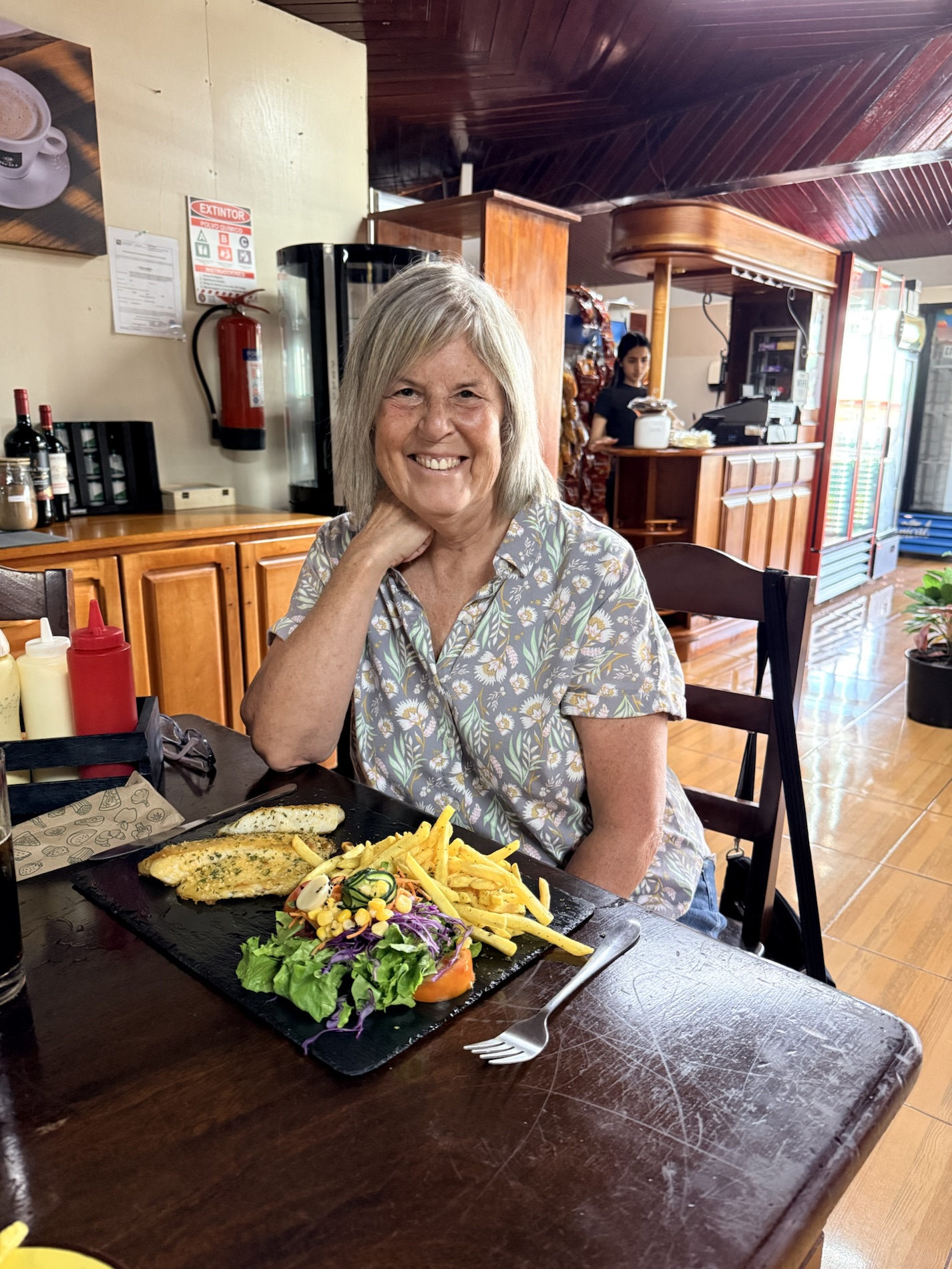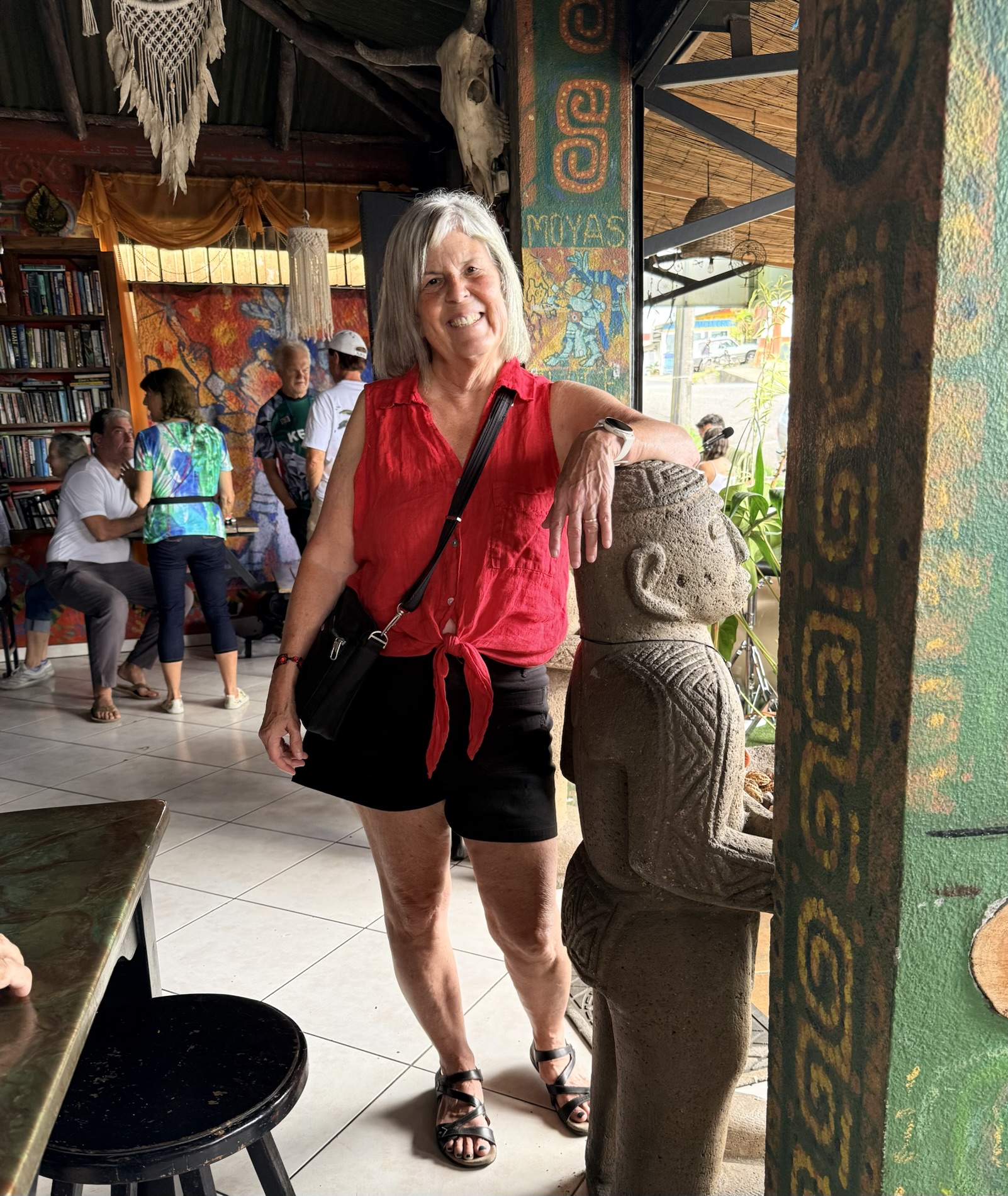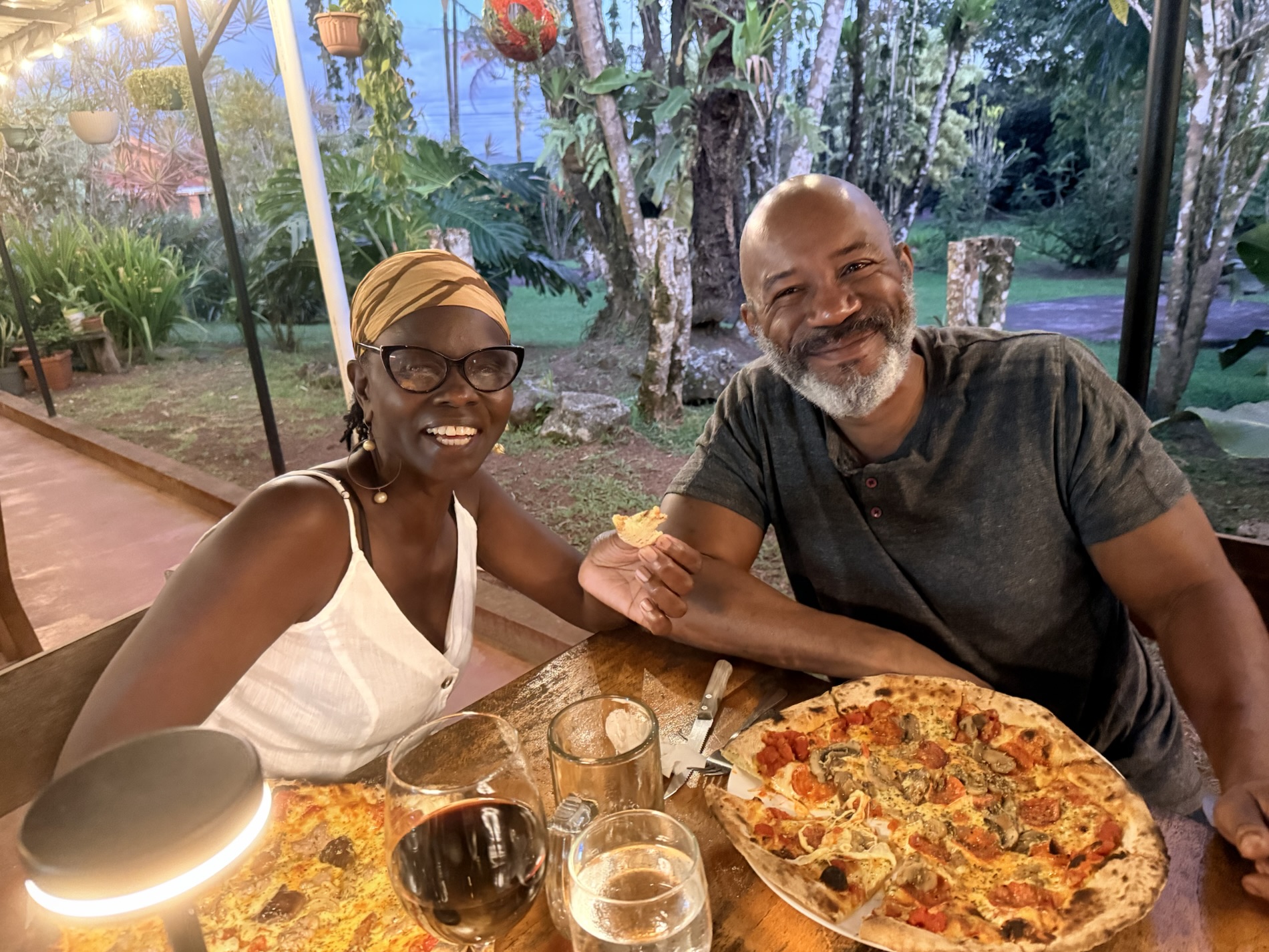 Once we returned home from Guatemala, we went to Moya’s Place to listen to the debut of the band Deep Cover; we are acquainted with two of the members. I enjoyed a Pad Thai with shrimp while Mike had a Fajita Bowl with chicken. We also have on our Spring BINGO card to try three new restaurants before we leave Costa Rica, so we tried Dond’Liz, a restaurant in Tronadora that we discovered has a great lending library. I enjoyed my grilled tilapia with garlic sauce while Mike ate a hamburger. I picked up a book, My Grandmother Asked Me to Tell You I’m Sorry by Fredrik Backman, adding additional pressure on myself to finish all the books I brought from Virginia so I don’t have to haul them back home. After going there for the first time, we ended up going there twice in the same week, the second time just before we attended El Gran Tope de Tronadora. On Friday night we went out with Darrell and Farida to Casa Italia in Nuevo Arenal, where we had a wild night filled with laughter. 🙂