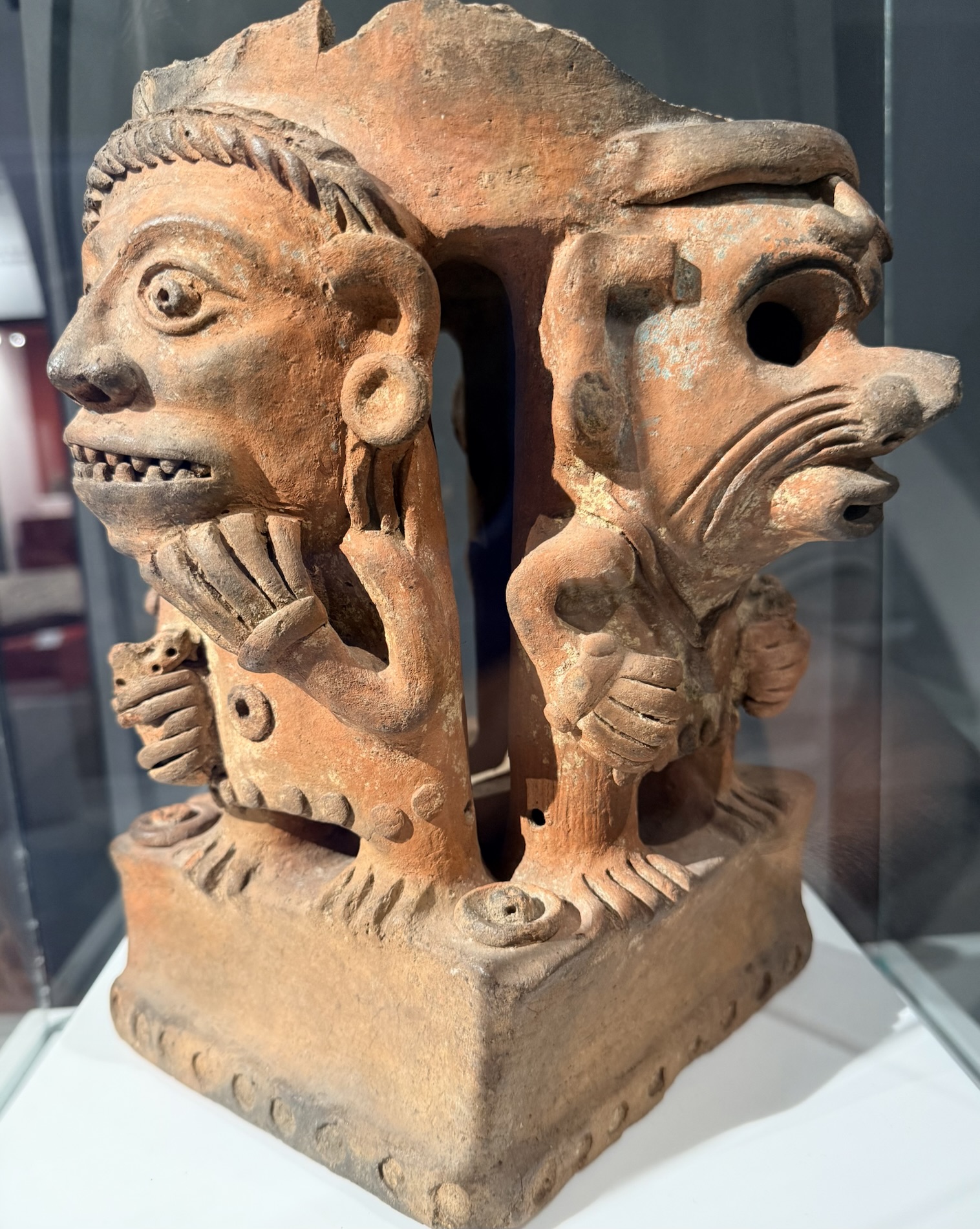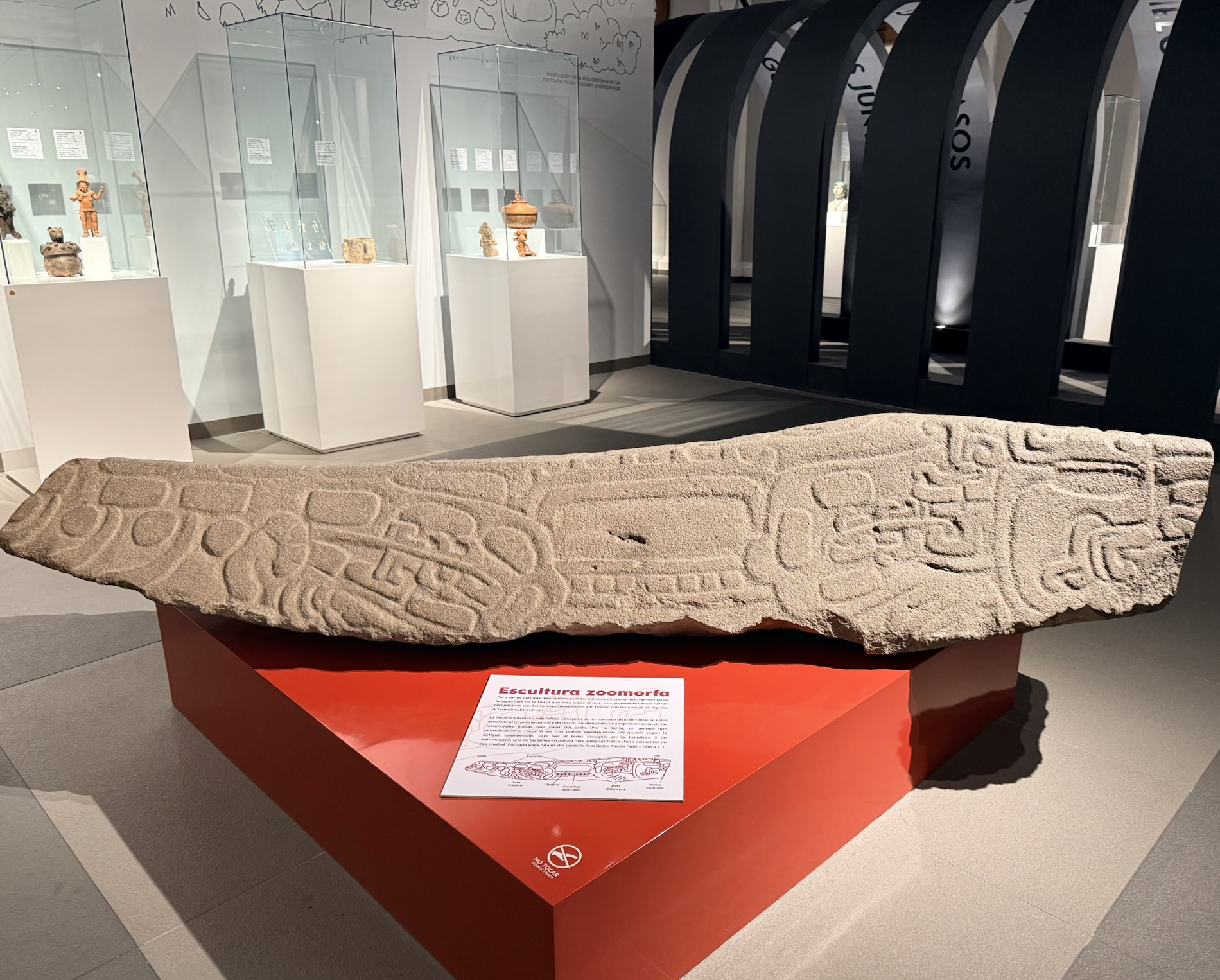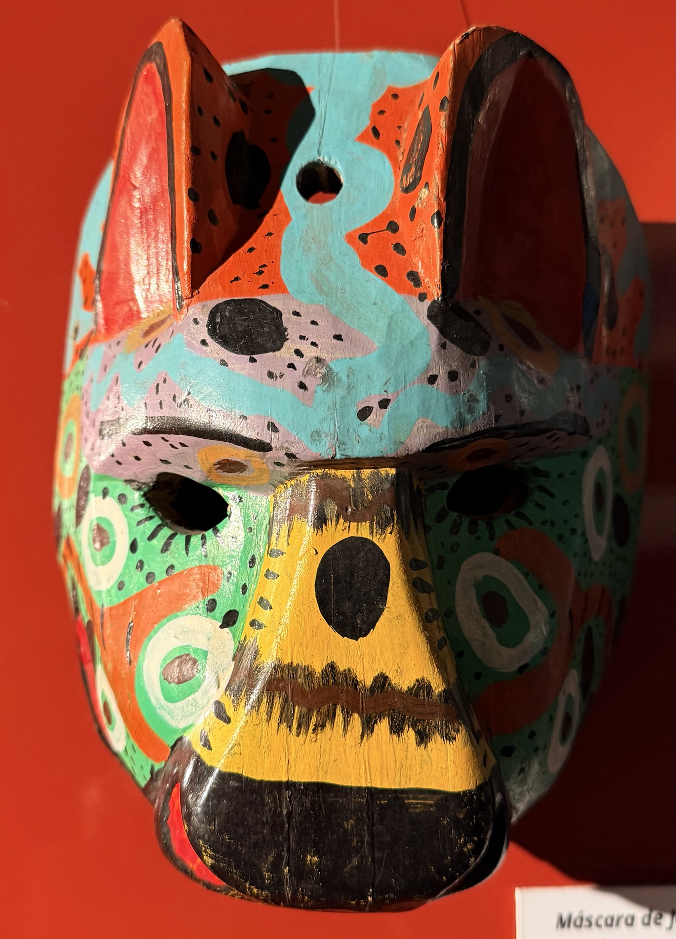 In the museum, we found cultural artifacts such as polychrome vessels and plates, lintels, vessels with lids, a jaguar heads necklace (Post Classic 950-1524), mosaic masks, anthropomorphic figurines, mosaic vessels of jade from Tikal, along with obsidian and shell, zoomorphic bowls, incense burners with zoomorphic effigies, a huge crocodile sculpture, devil and jaguar masks, textiles and indigenous clothing.