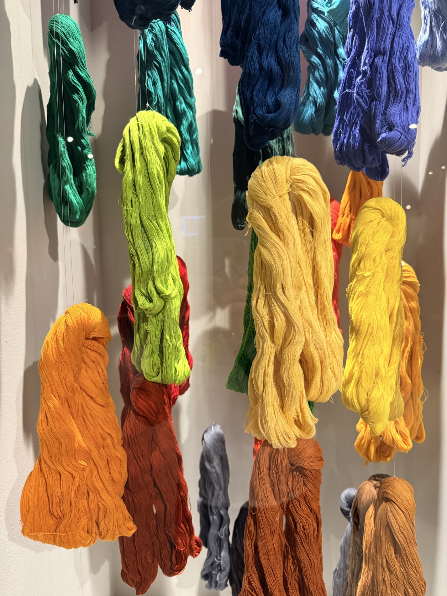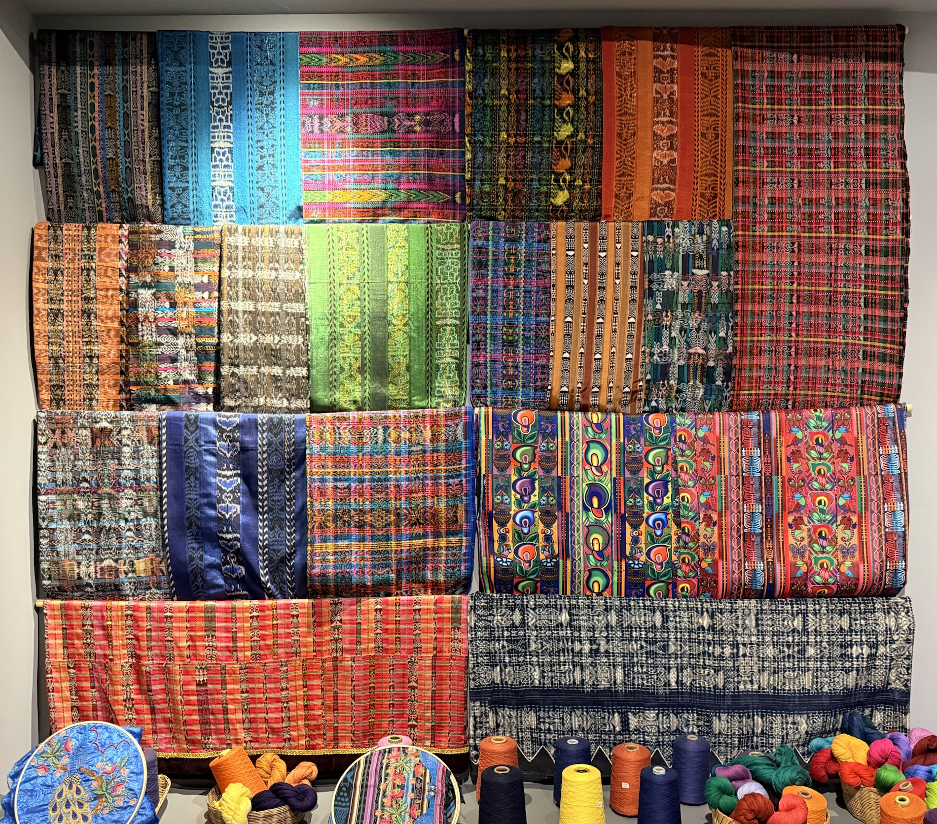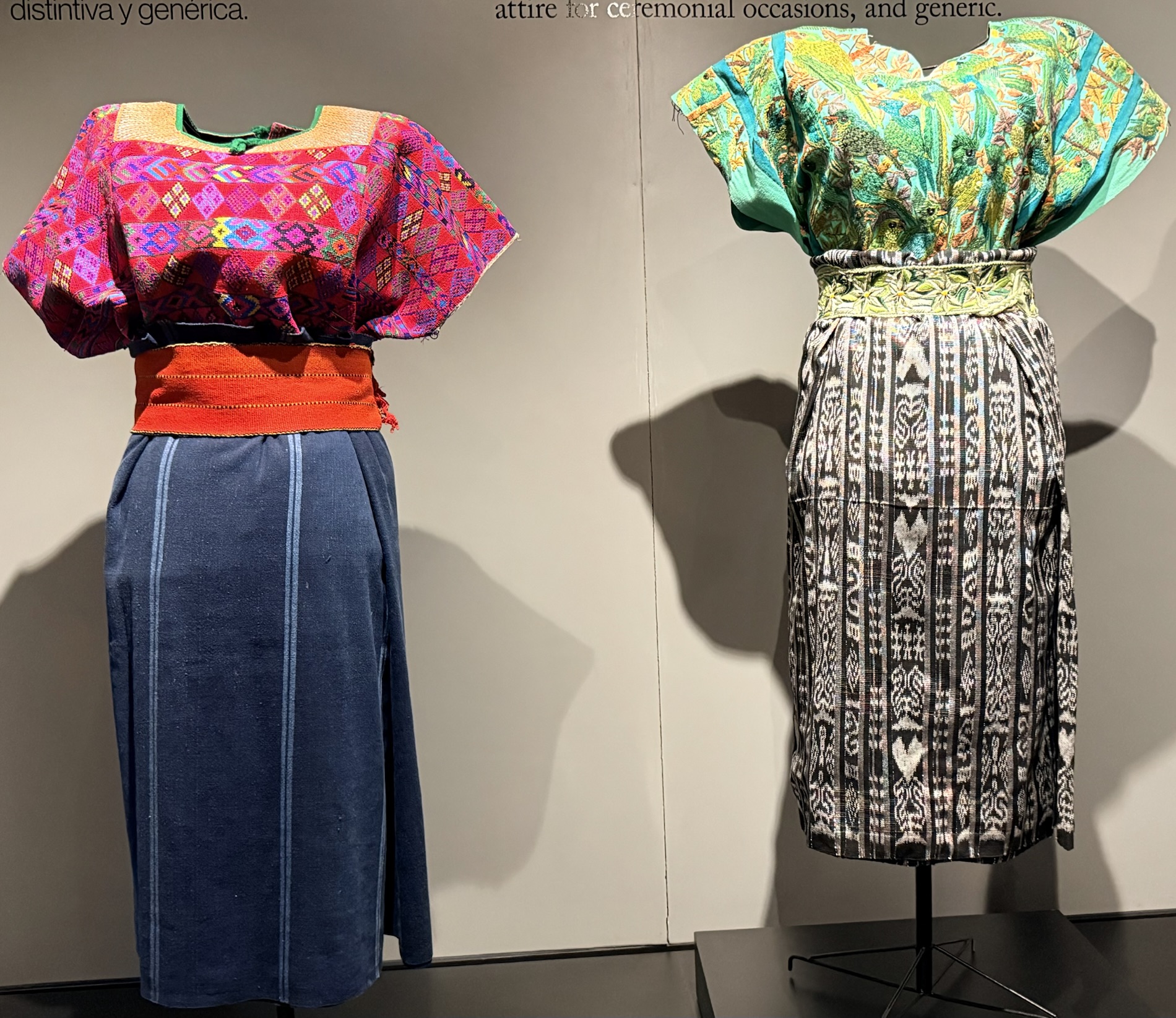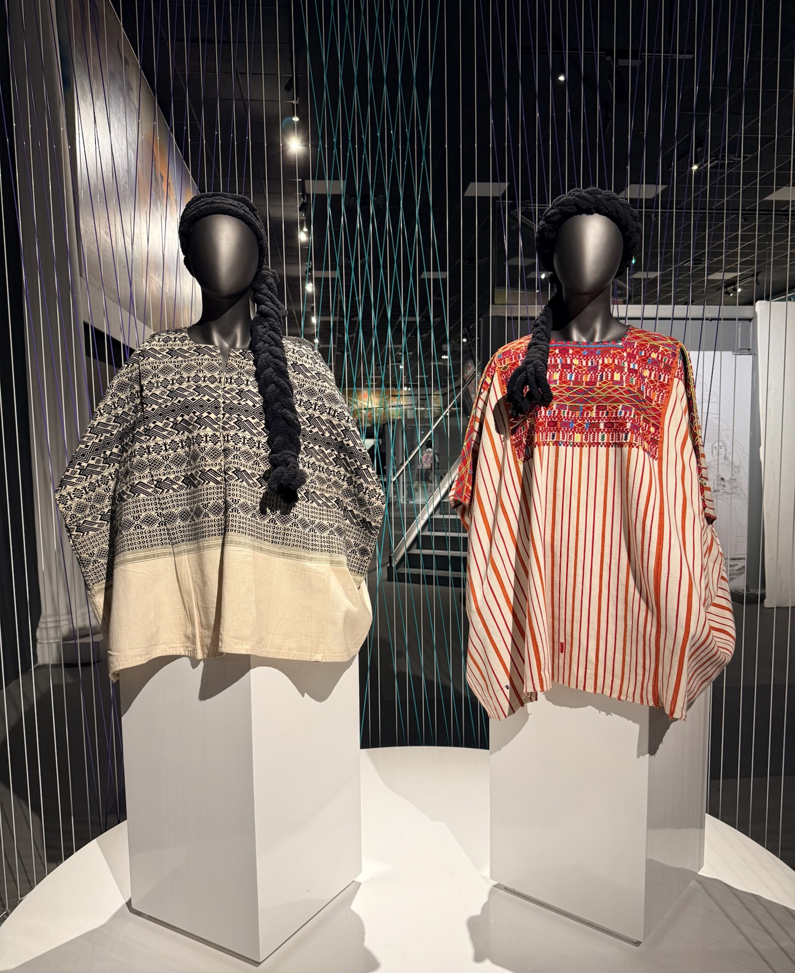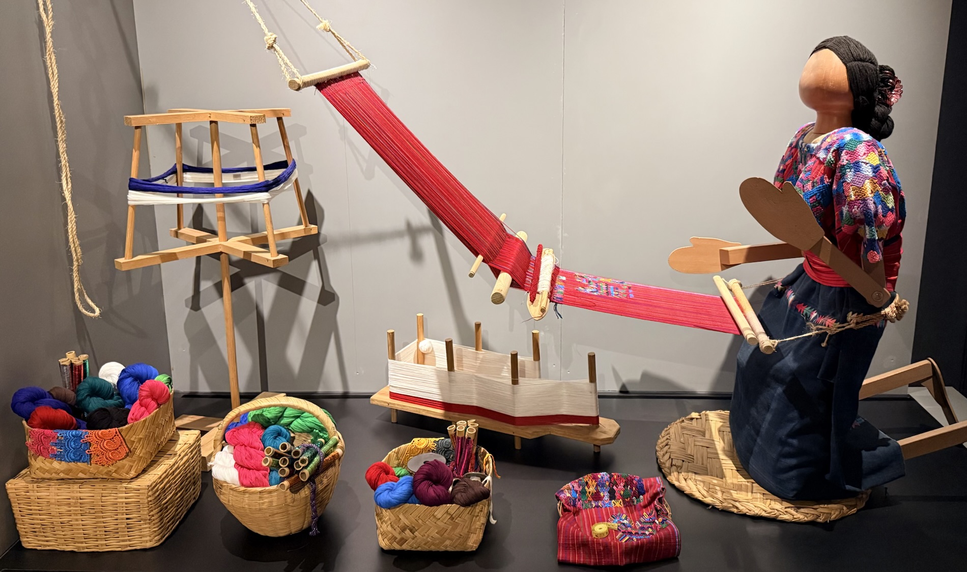 One display features the backstrap loom technique, which is an ongoing ancestral practice, as well as huipiles made with modern technologies. It also includes skirts made with the jaspe (ikat) or resist-dye technique, mostly designed by male weavers who use the treadle loom. These sets express the ethnic identity conveyed in traditional and ceremonial attire. They follow the display of threads, which in weavings take on a life and shape of their own. Threads have always been the key link to begin the weaving process. Together with the skilled hands of weavers, they give distinction and texture to each piece.