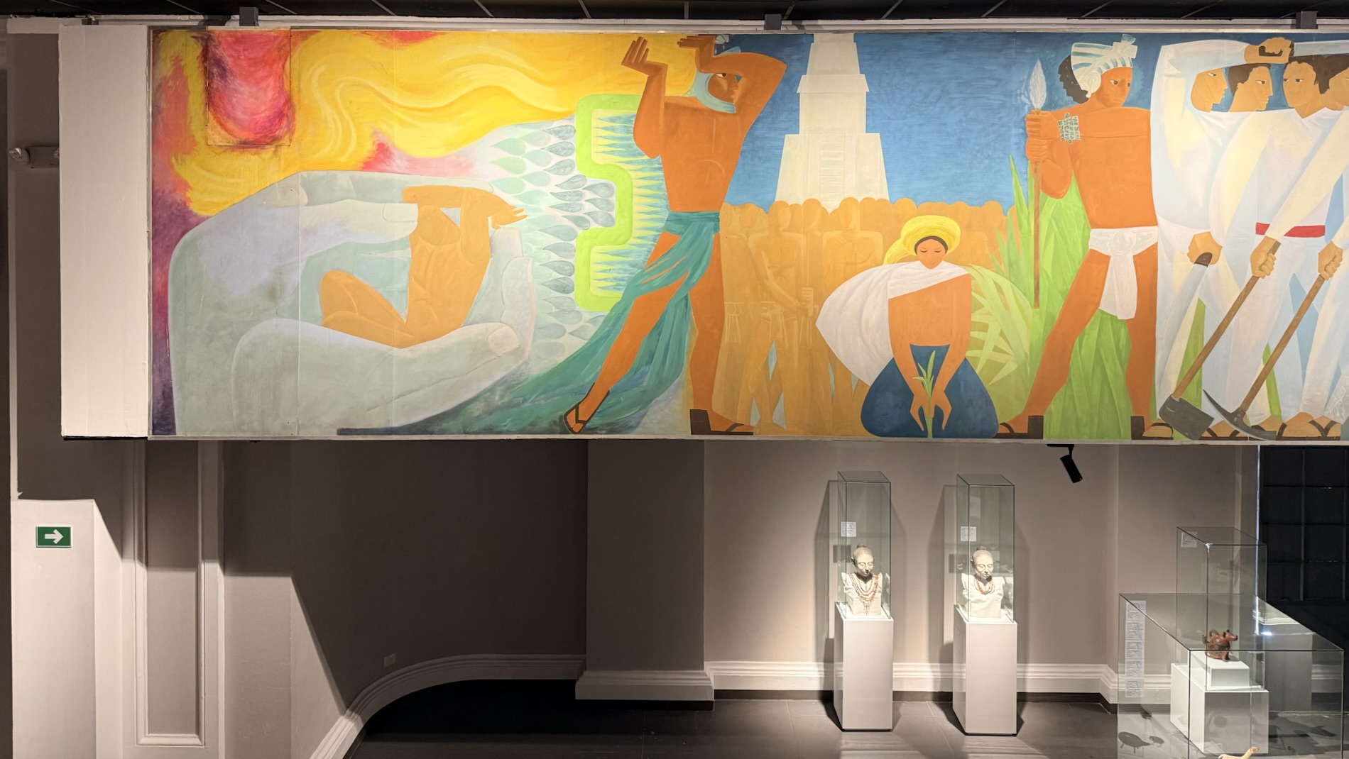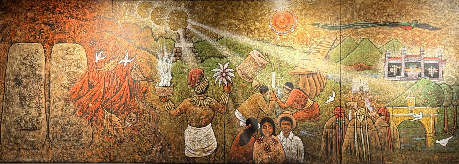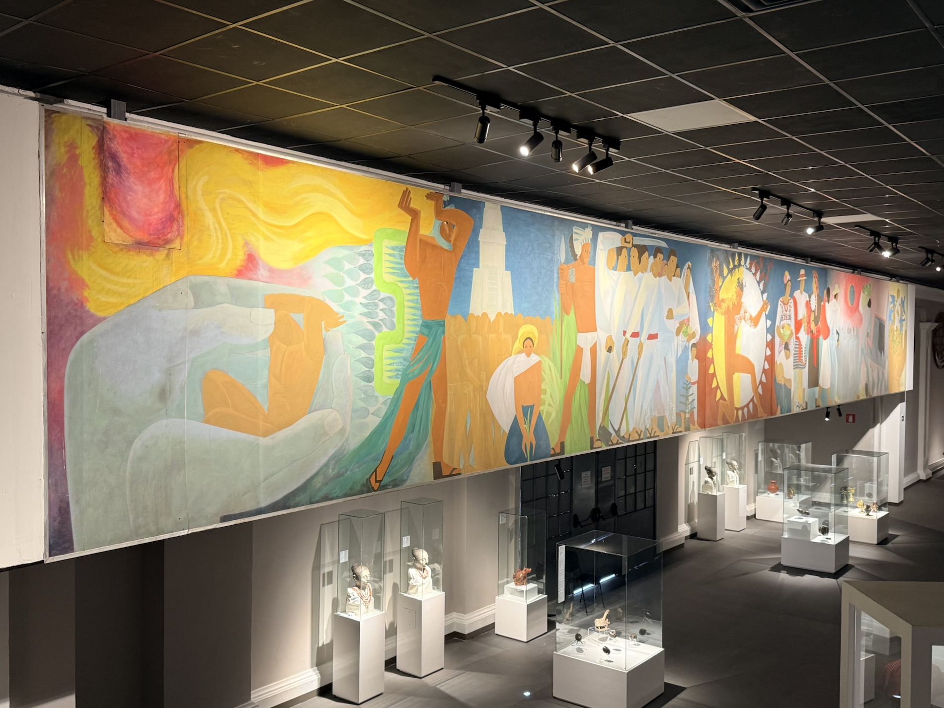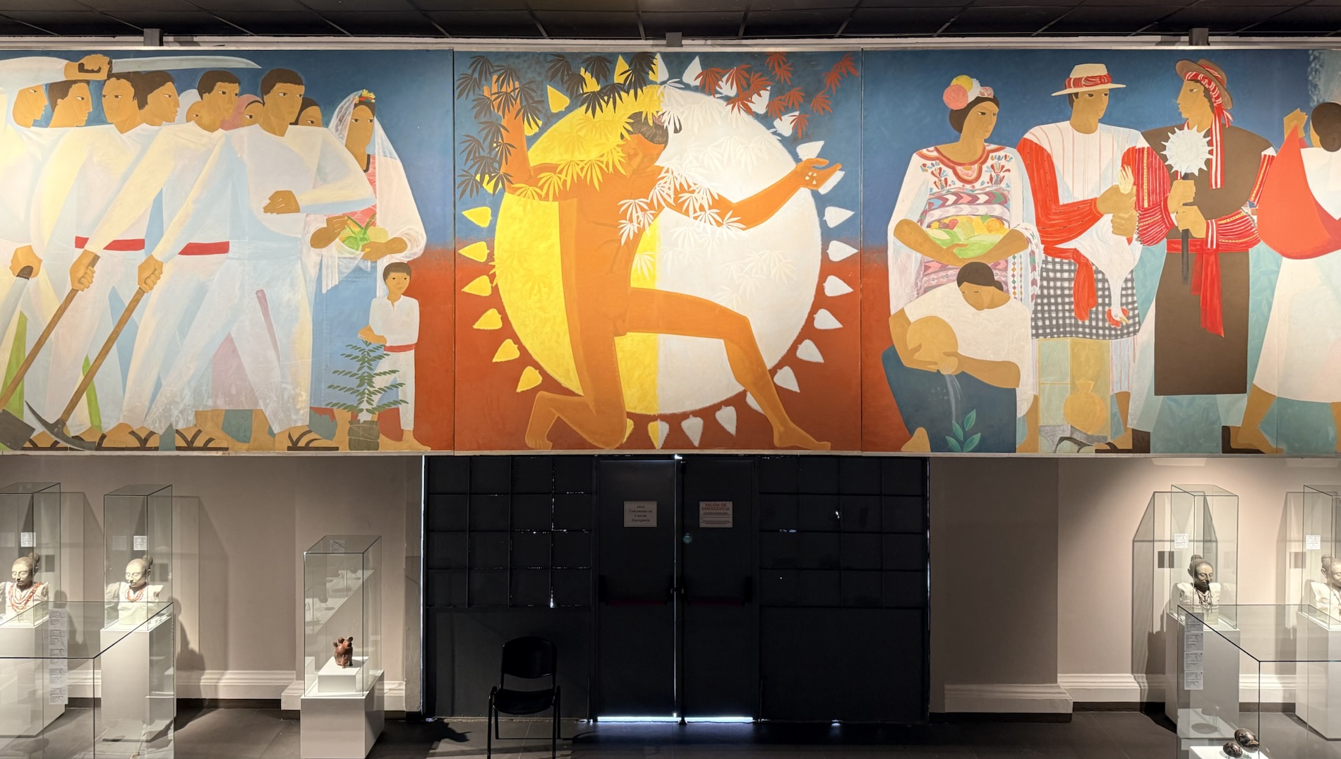 Encircling the final room in the museum are painted panels created by Roberto González Goyri which show “spiritual syncretism” based on the sacred book of the Maya, the Popol Vuh, the events of the Spanish conquest, and the fusion of present-day manifestations. Another panel shows the ancient Mayan world.
