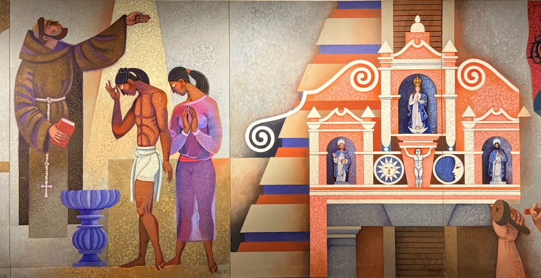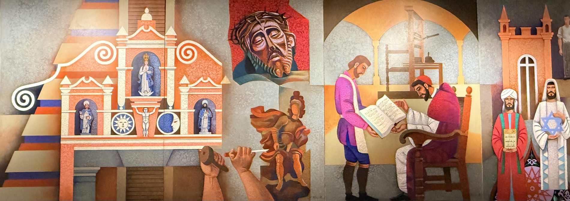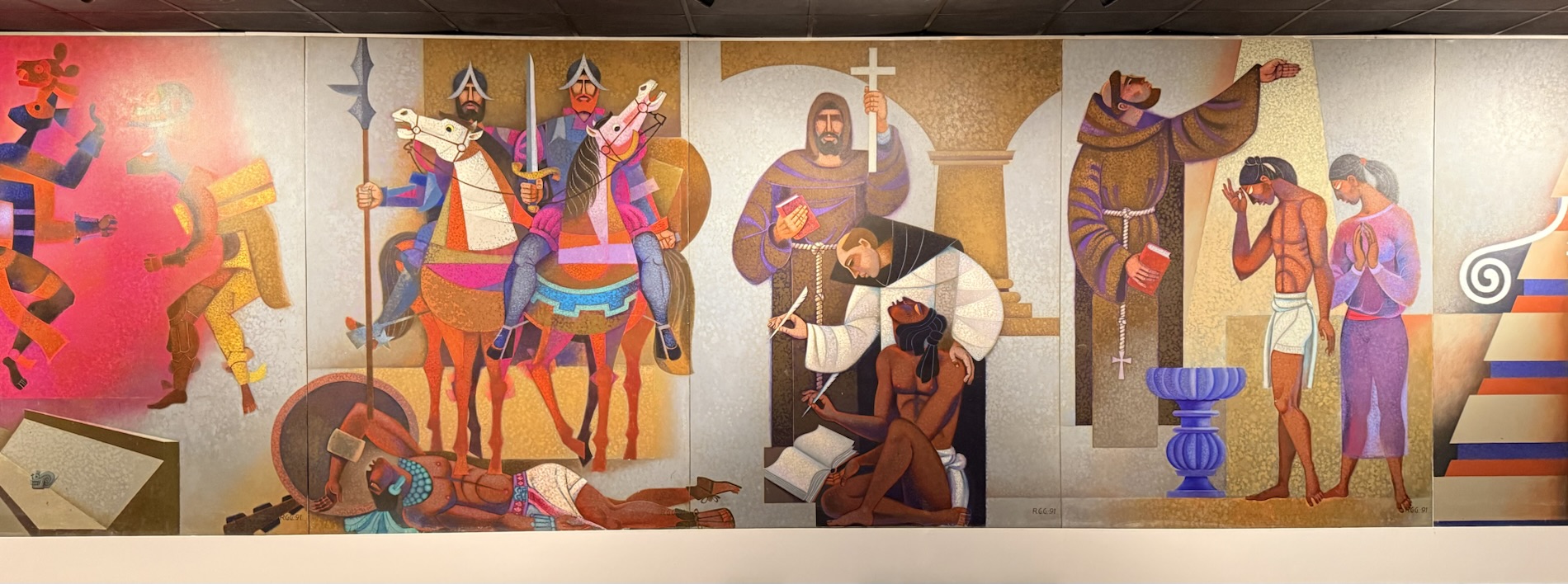 Encircling the final room in the museum are painted panels created by Roberto González Goyri which show “spiritual syncretism” based on the sacred book of the Maya, the Popol Vuh, the events of the Spanish conquest, and the fusion of present-day manifestations. Another panel shows the ancient Mayan world.