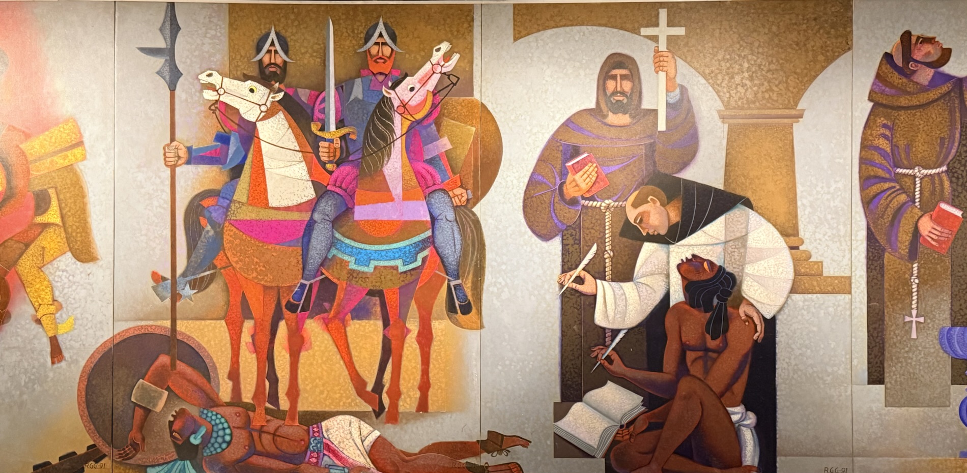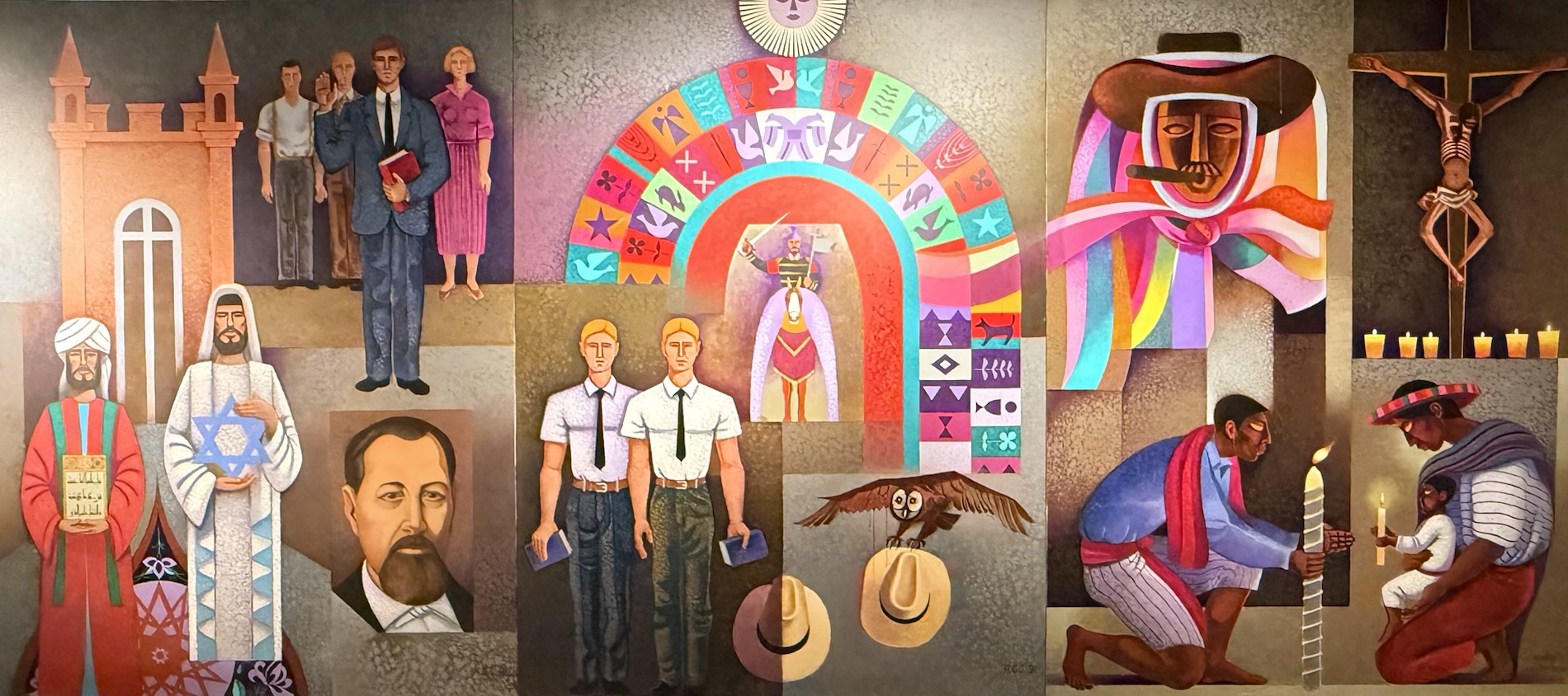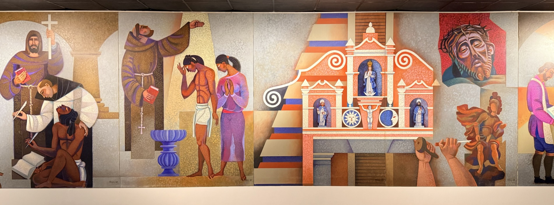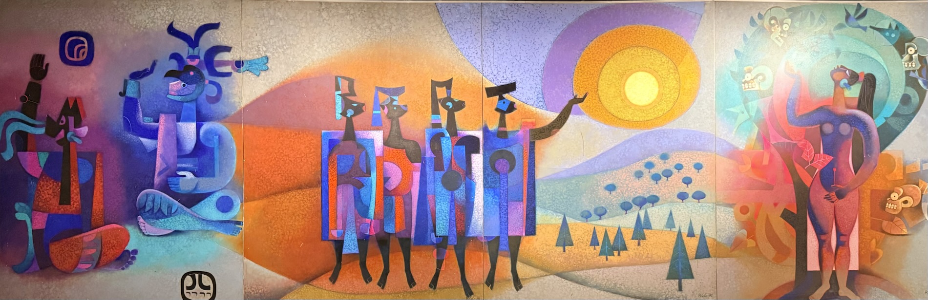 Encircling the final room in the museum are painted panels created by Roberto González Goyri which show “spiritual syncretism” based on the sacred book of the Maya, the Popol Vuh, the events of the Spanish conquest, and the fusion of present-day manifestations. Another panel shows the ancient Mayan world.