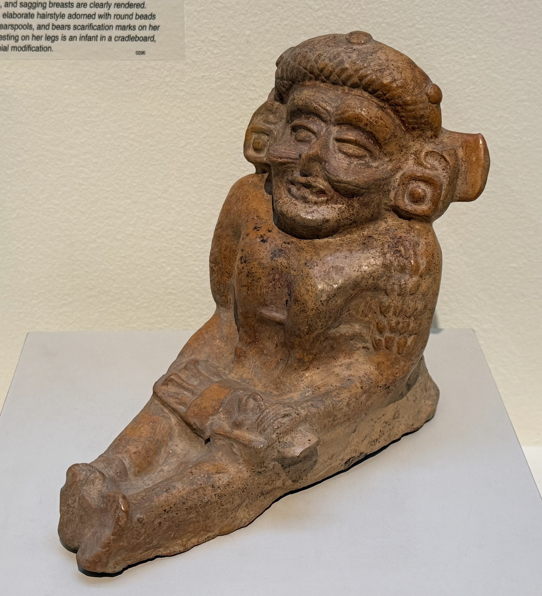 The pre-Hispanic Maya practiced a series of permanent bodily modifications to conform with their society’s ideals of beauty. Cranial modification was foremost, usually carried out in infancy by women using rigid tools such as a cradleboard or a pair of loose splints, accompanied by constricting bandages. Imagery shows this being performed by elderly women (possibly midwives), but colonial accounts suggest it was carried out by the mother. Women wore elaborate hairstyles to emphasize their cranial modification.
