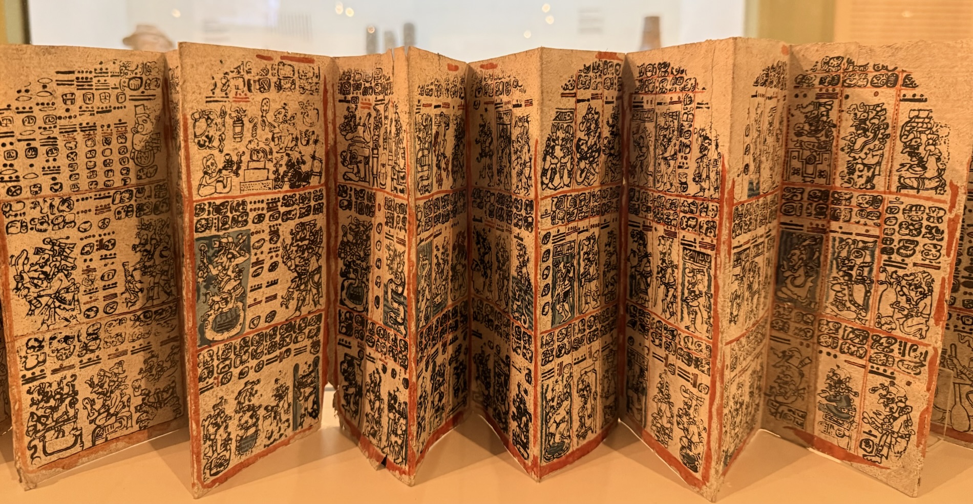 The ancient Maya made books from the inner bark of a native fig tree, called amate. Long strips of paper were made from processed bark, covered with fine layers of stucco and folded like screens, so it was possible to open the books and read several pages at once. The Dresden Codex is the oldest and finest example of the three Maya books still preserved from the the pre-Hispanic period. It is estimated to have been written in the 13th century. It includes a series of omens and calendars with predictions for each date based on the actions of the gods. Tables track the cycle of the planet Venus and solar and lunar eclipses, and prescribes rituals for celebrating the New Year.