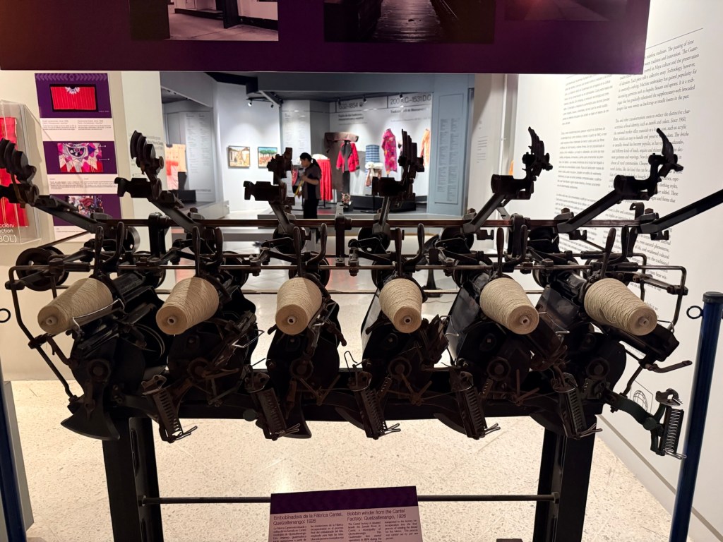 A bobbin winder from the Cantel Factory, Quetzaltenango (1926) was incorporated into the final process of winding the thread for the fabrics. This Guatemalan firm started operations in 1874 and was a major enterprise in the manufacture of thread and fabrics in Central America. The factory closed in 2008.