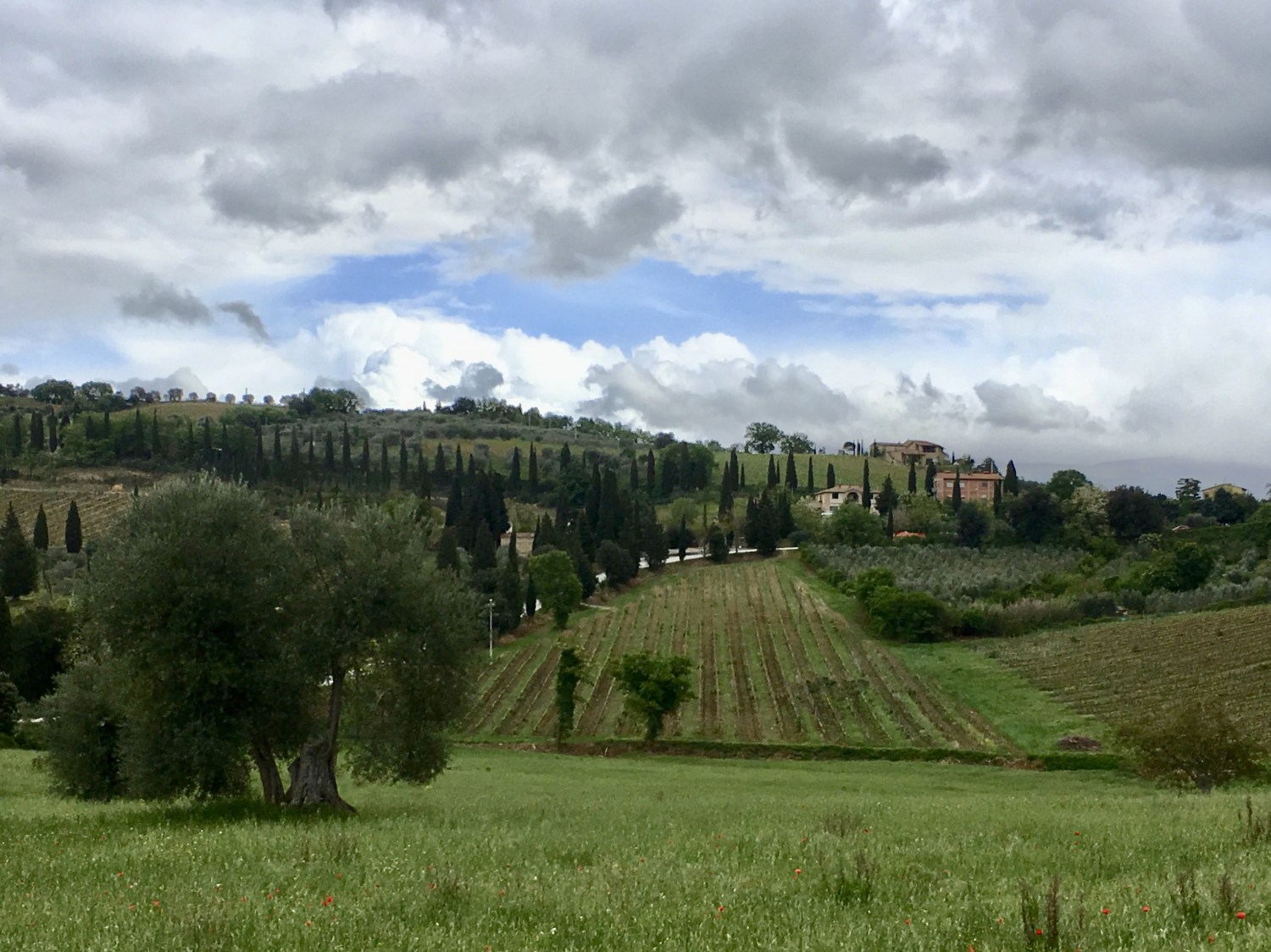 We continued on the uphill road forever and as the fog burned off, we had majestic views of the Tuscan countryside. We walked along the ridges with almost no shade for what seemed an eternity.